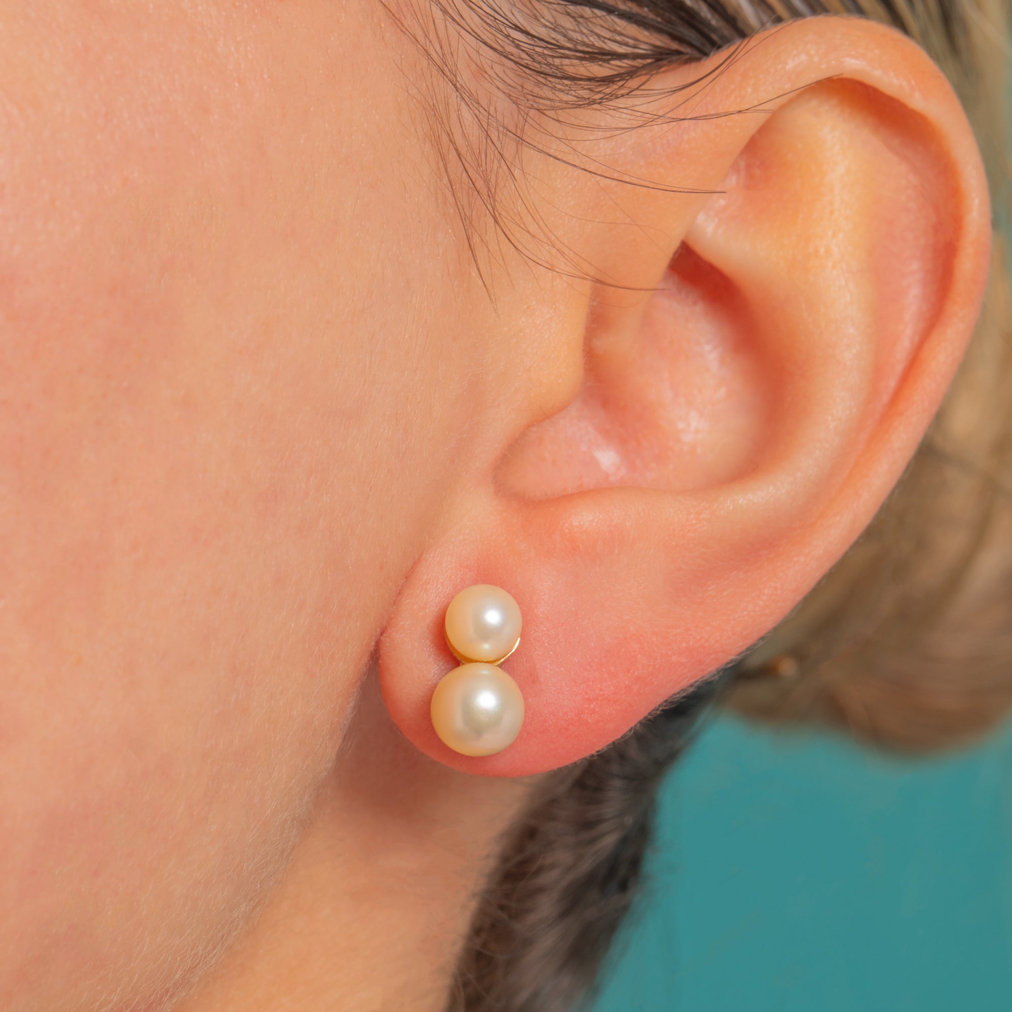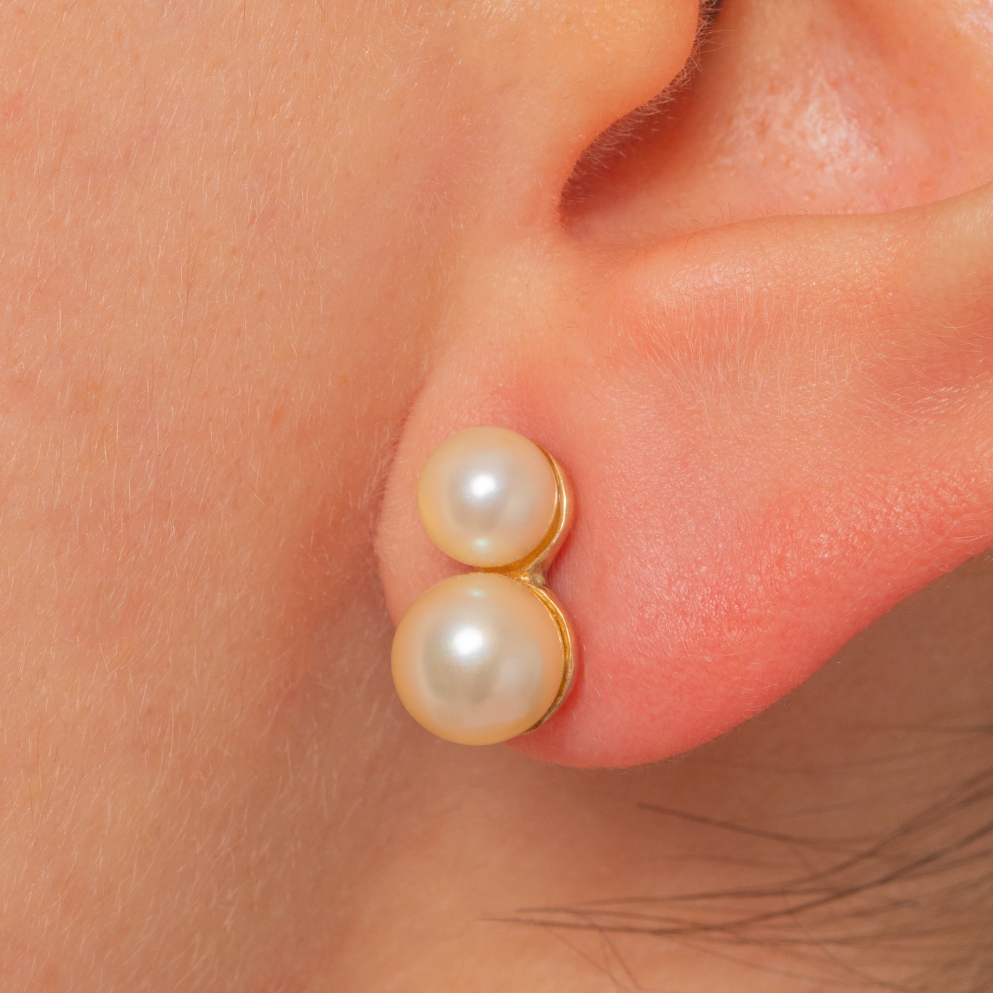 Elegantly minimal and endlessly wearable, these 9ct Gold double Pearl studs stack two creamy, lustrous Pearls in a refined vertical duo. The sleek low cup settings show just a whisper of warm Gold, letting the soft silvery-pink iridescence of the Pearls take centre stage.