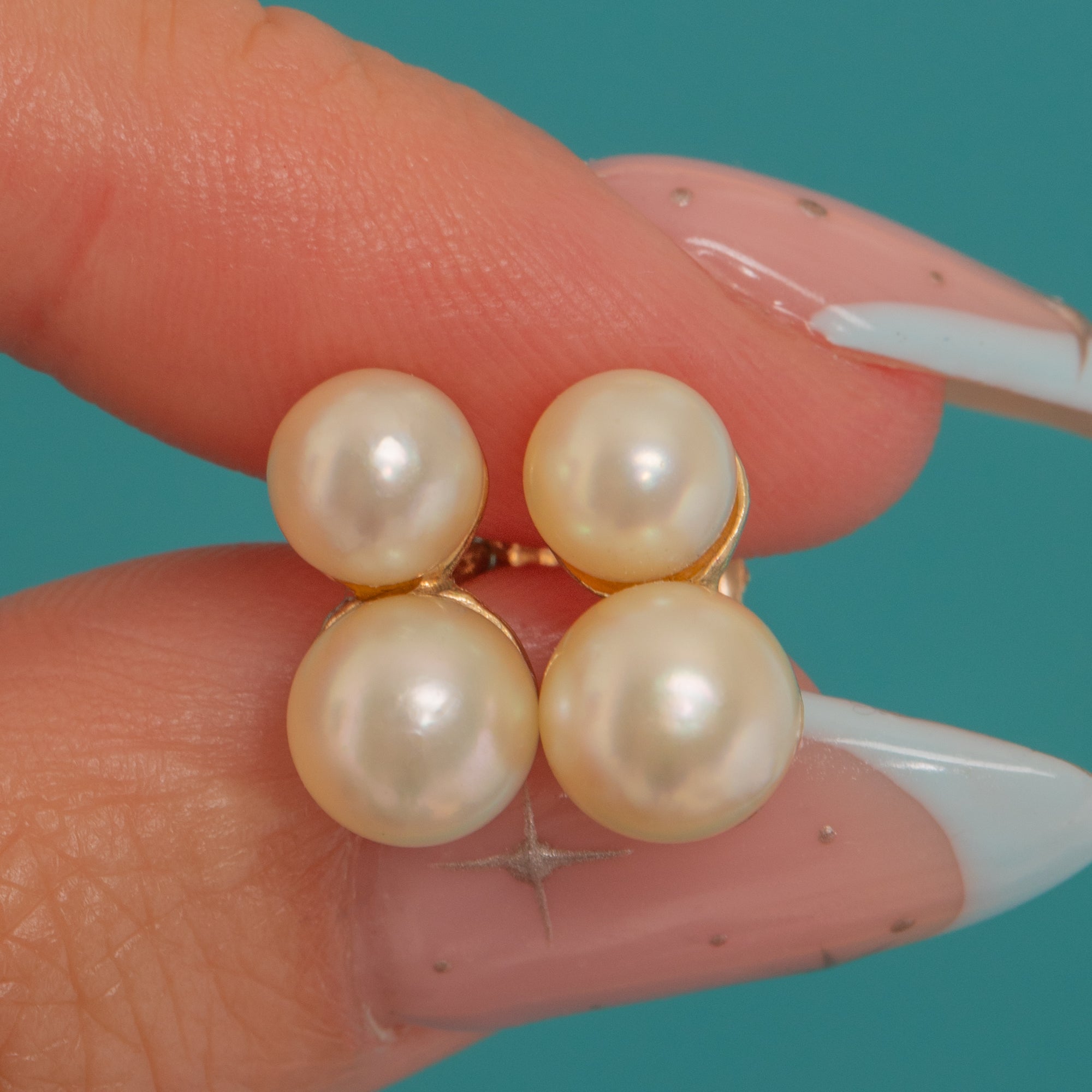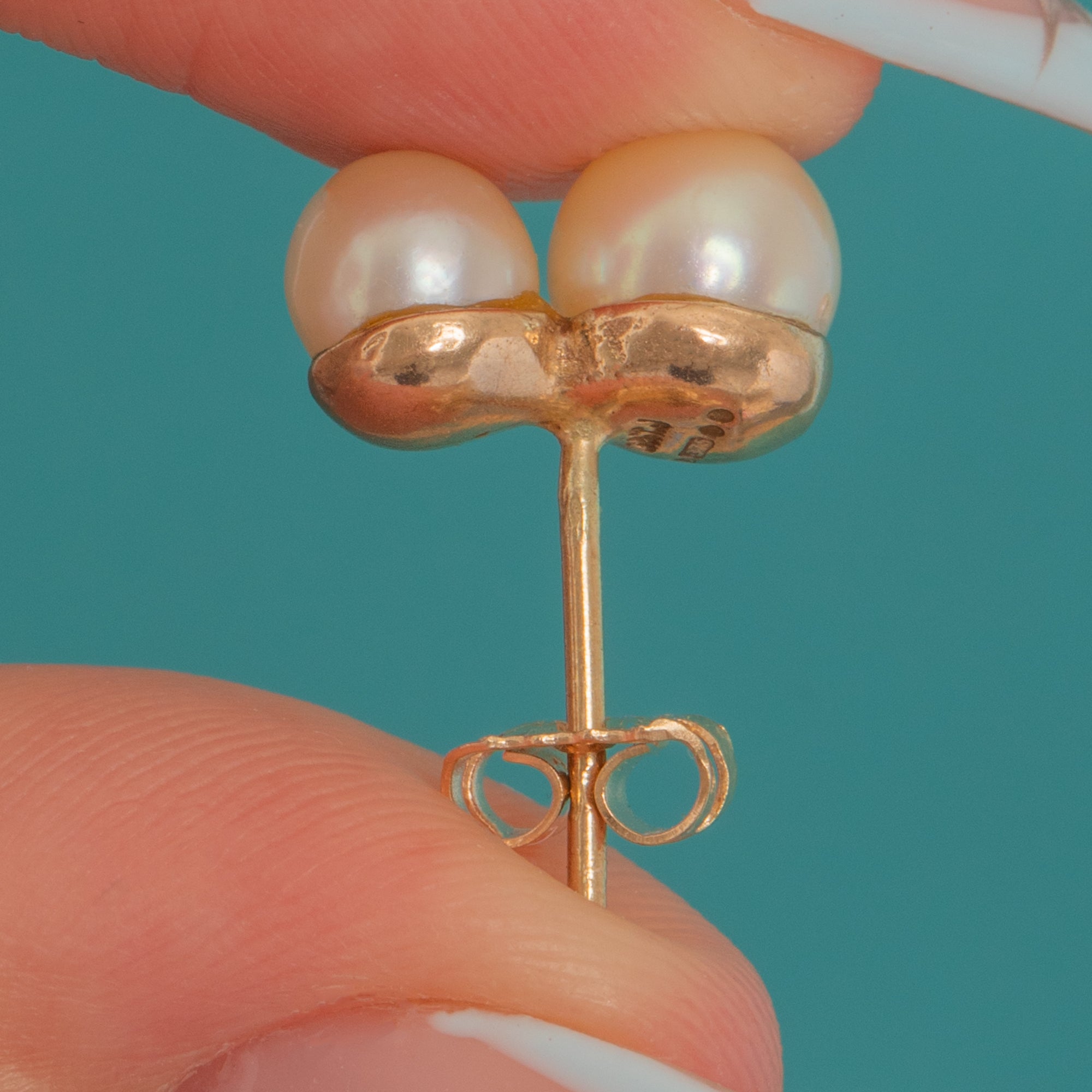EXCELLENT: Pearls are bright with even lustre and only minor natural surface pinpricks visible on close inspection, with no chips or cracks. The Gold settings and posts are crisp with a high polish and light surface marks consistent with careful wear. Backs fit securely and there are no visible repairs or alterations.