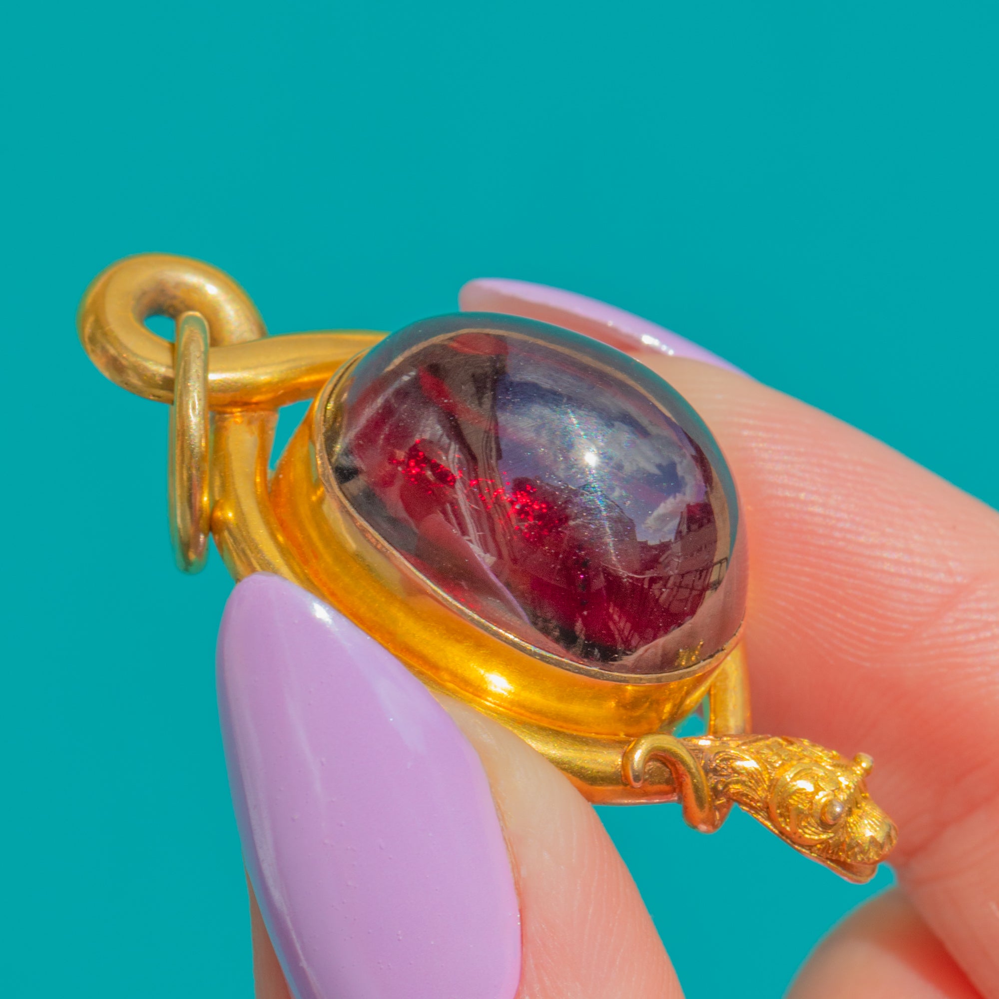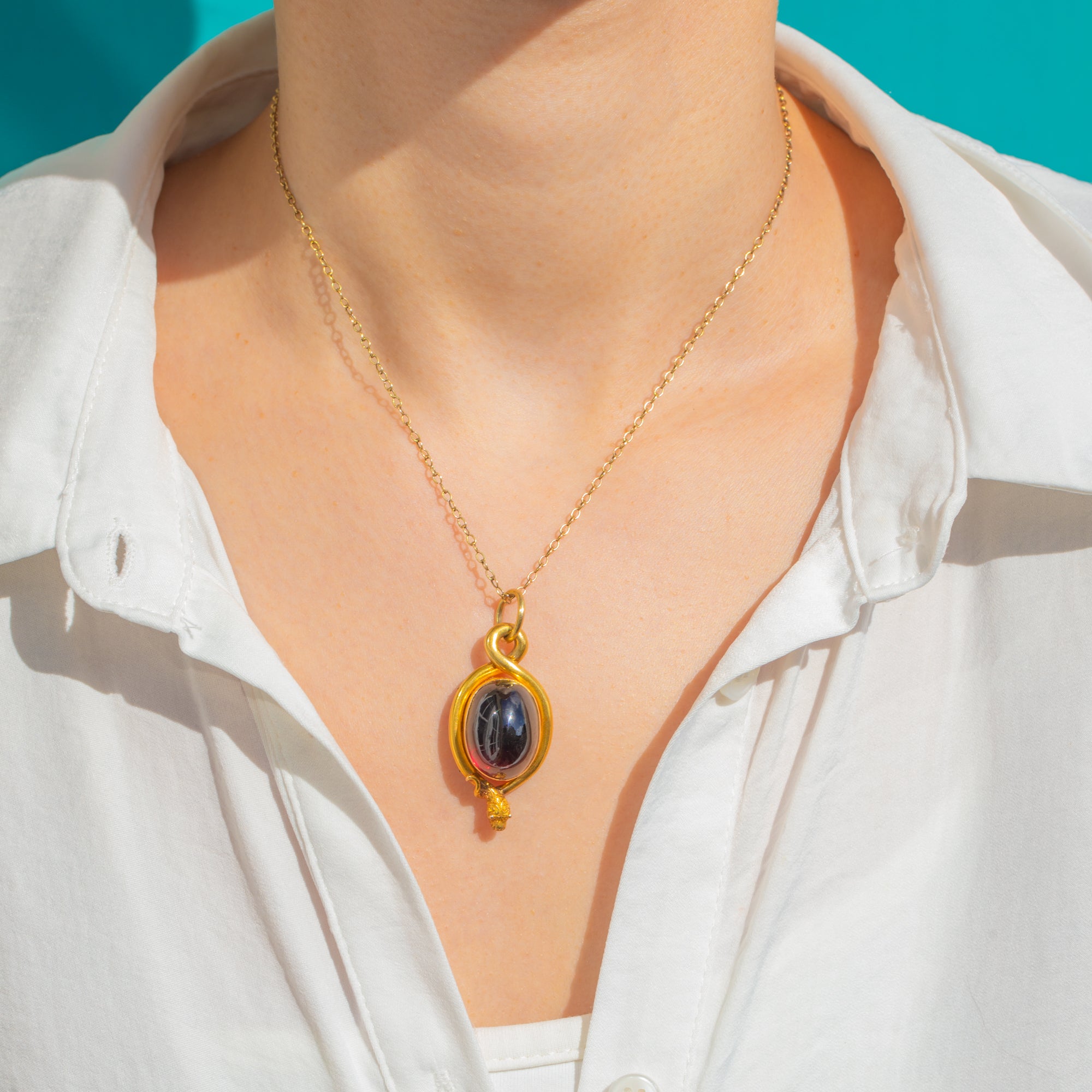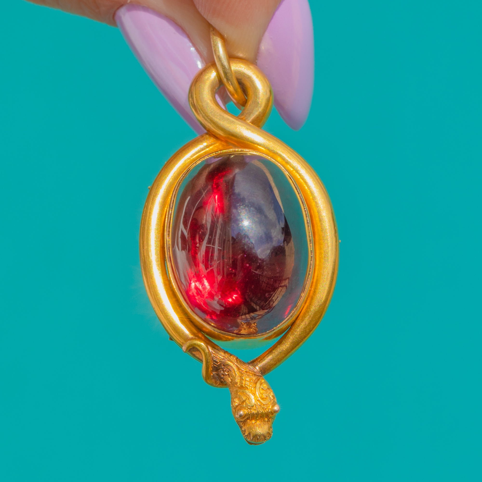 A sumptuous Victorian snake pendant in rich 18ct Gold, coiling protectively around a glowing 19.00ct Garnet cabochon. The high-domed oval Garnet moves from deep claret to near-black depending on the light, its smooth dome embraced by a continuous serpent bezel that loops seamlessly into the integrated bail. The sculpted, lifelike snake head crowns the design with exquisite detail, while the reverse reveals a locket back for that quintessential 19th-century flourish.