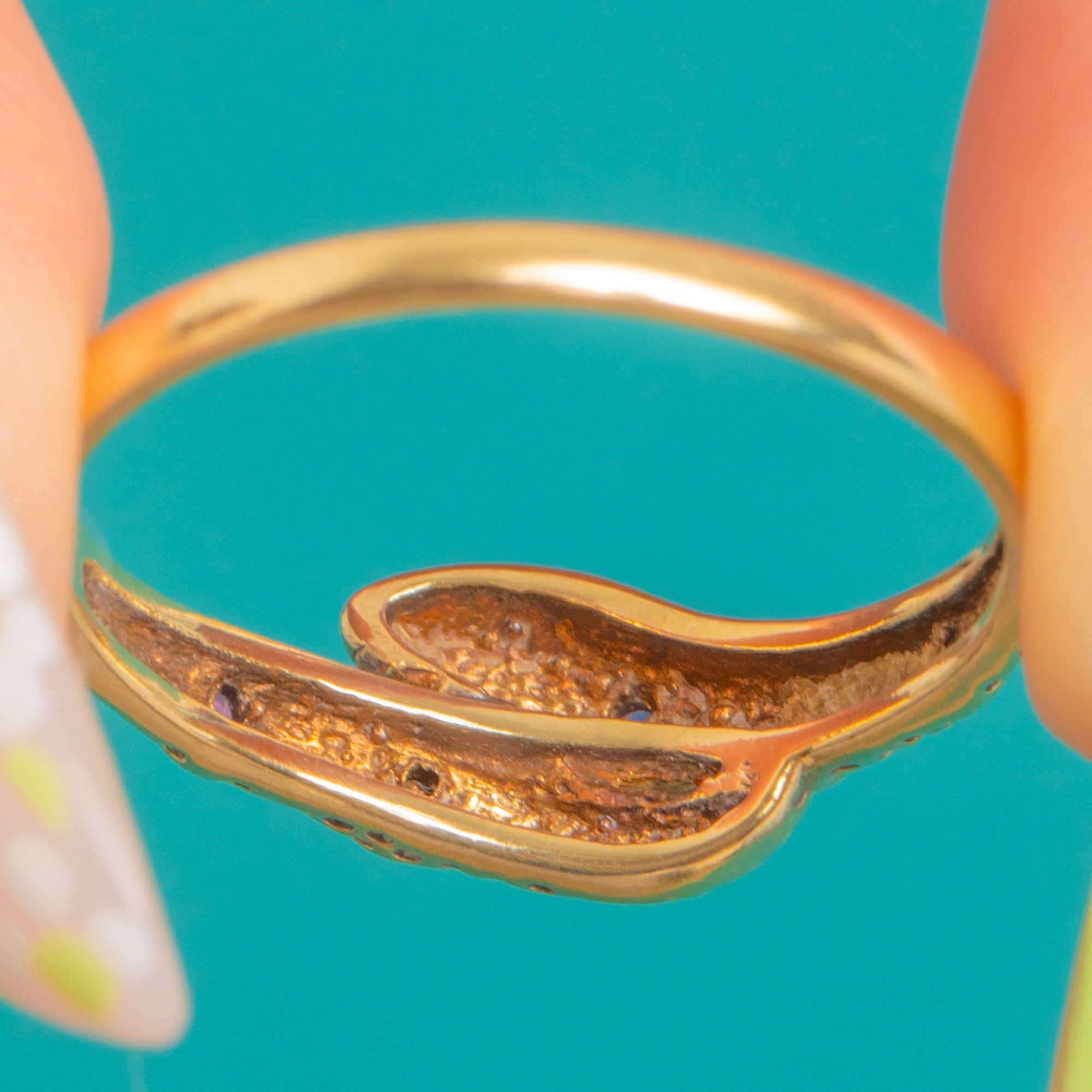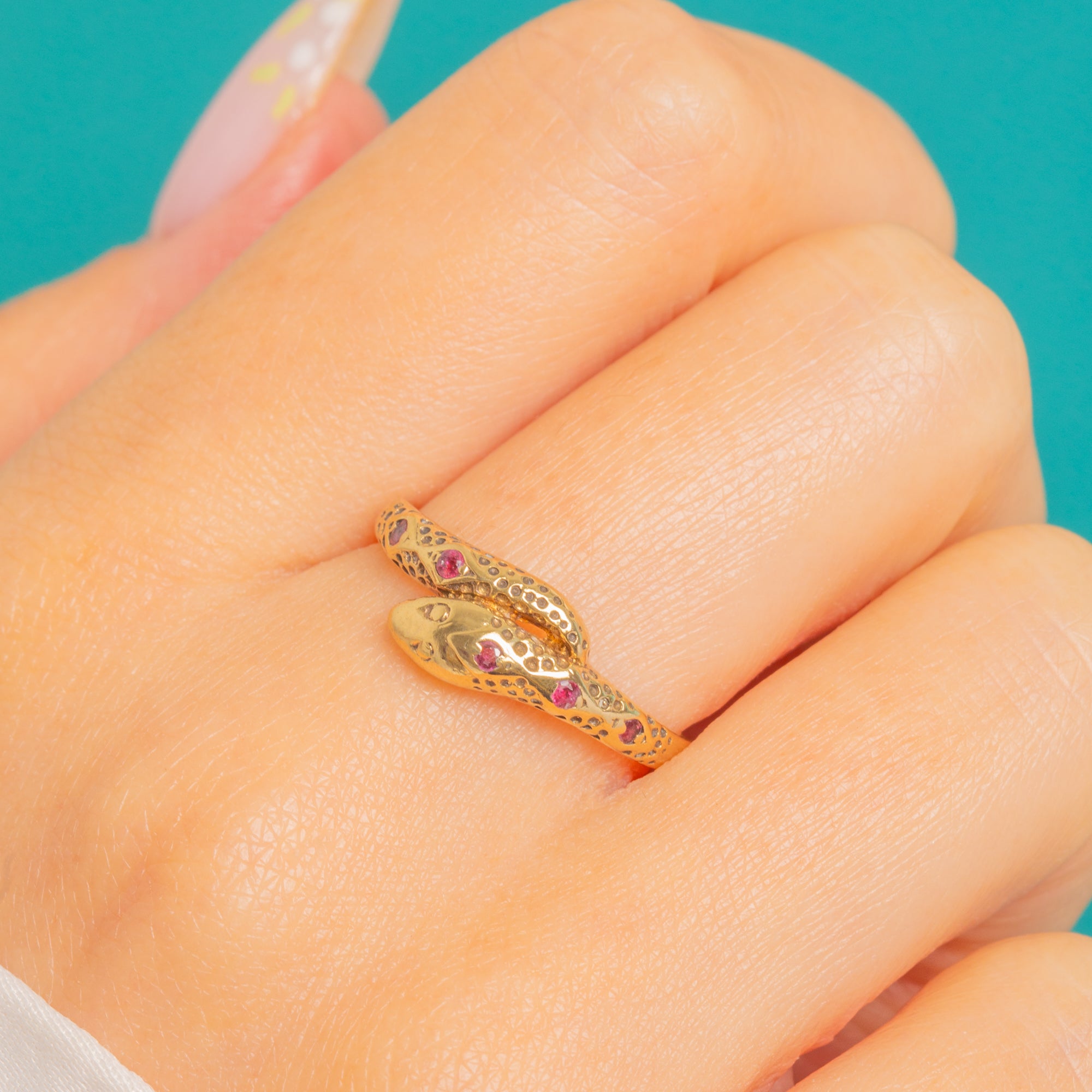 A timeless serpent motif, coiled in gleaming 9ct Gold and dappled with tiny Rubies, this Vintage ring captures the allure of a classic icon with a chic 1980s twist. The snake’s textured scale detailing shimmers as it wraps gracefully around the finger, while the petite Rubies add a discreet flash of colour and intrigue.