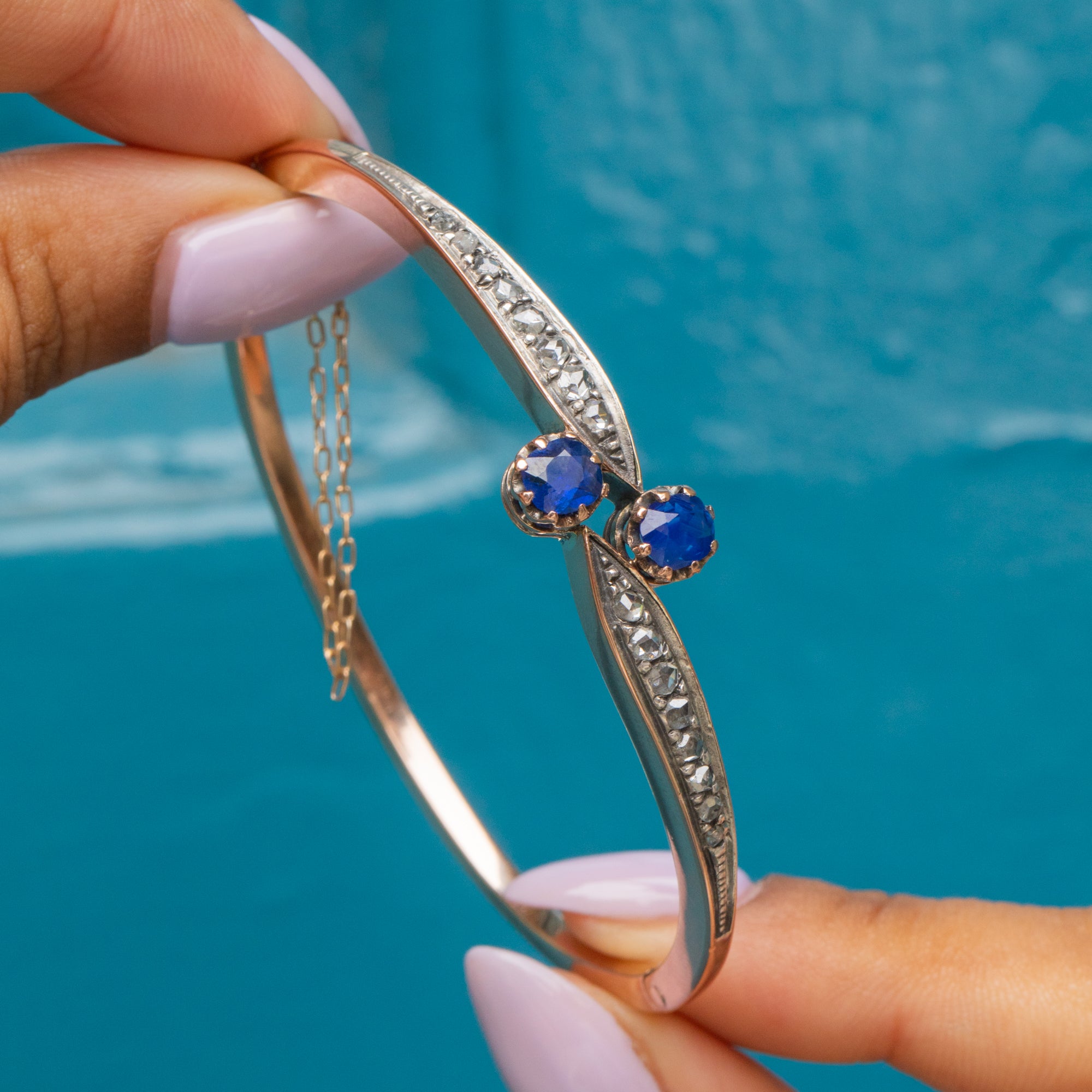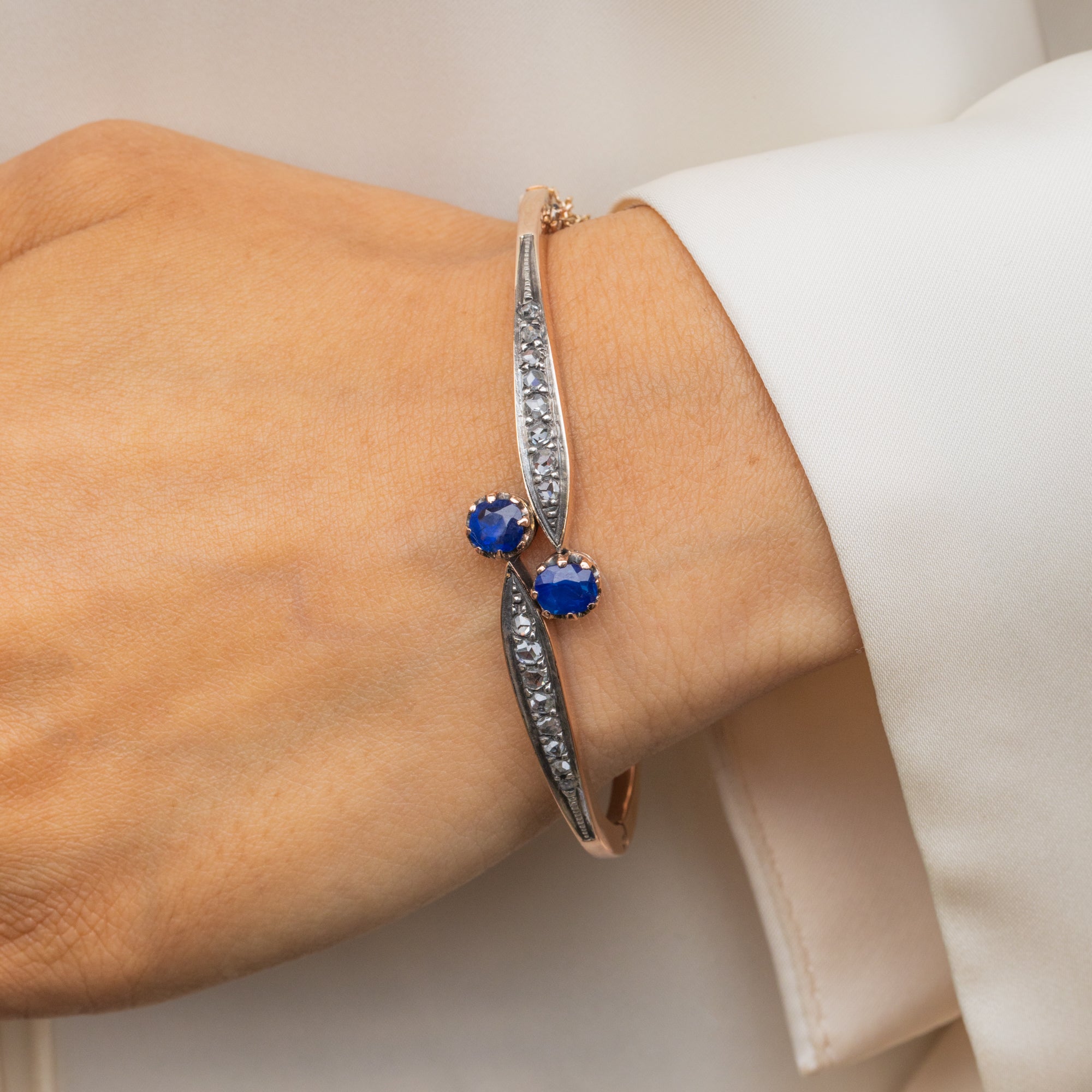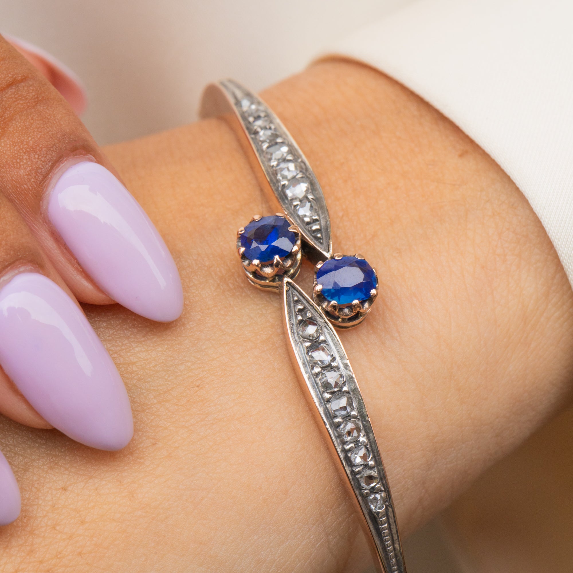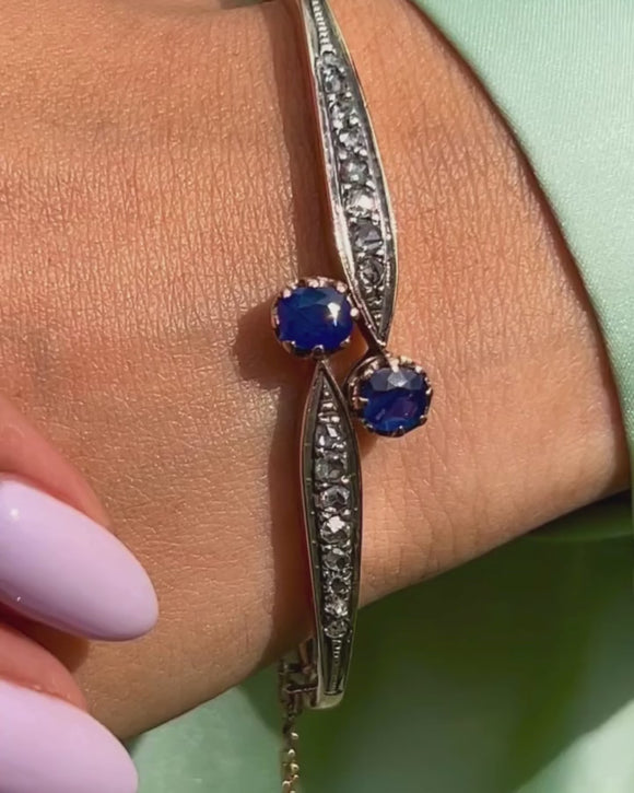 EXCELLENT. This antique 18ct Gold Sapphire Diamond Toi Et Moi bangle is offered in excellent condition. The Sapphires are securely held within their setting, and have the most impeccable royal blue hue. The 18ct Gold exhibits a minor ding on the surface, however, it's not noticeable when worn and maintains its shine and glow. The Diamonds are sparkly and secure in their Silver settings. The bangle features a barrel clasp with a safety chain, providing you with a comfortable and secure closure. With proper care and maintenance, this bracelet will last for generations to come!