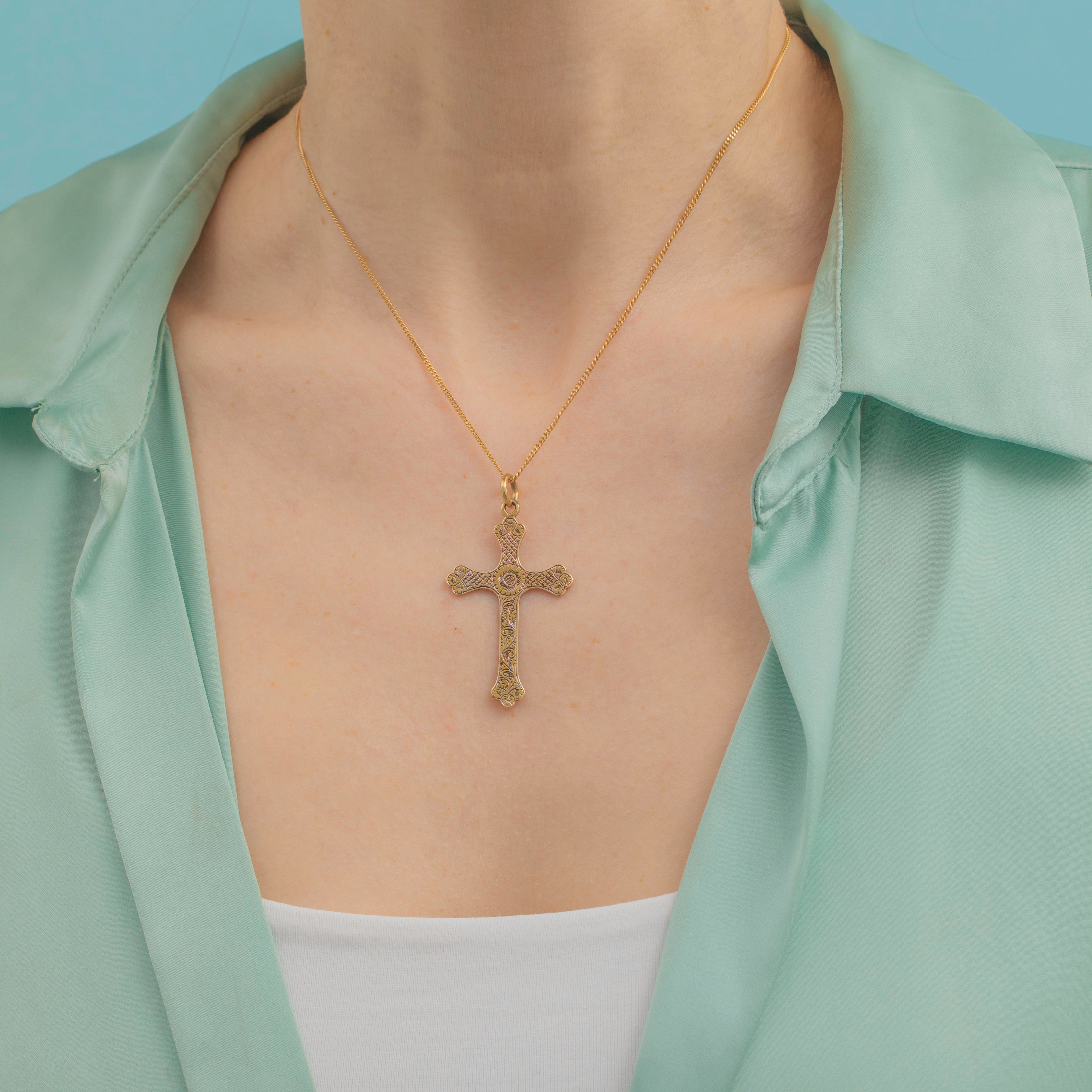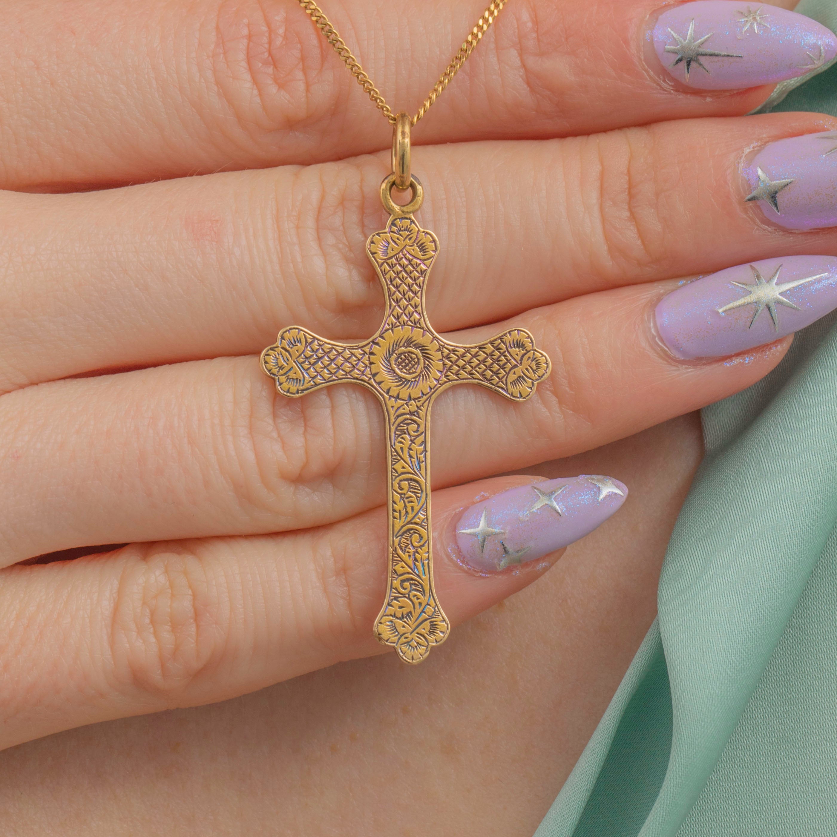 EXCELLENT. This Victorian 15ct Gold cross pendant is in excellent condition. The engravings are gorgeous on both sides and the piece has aged beautifully.