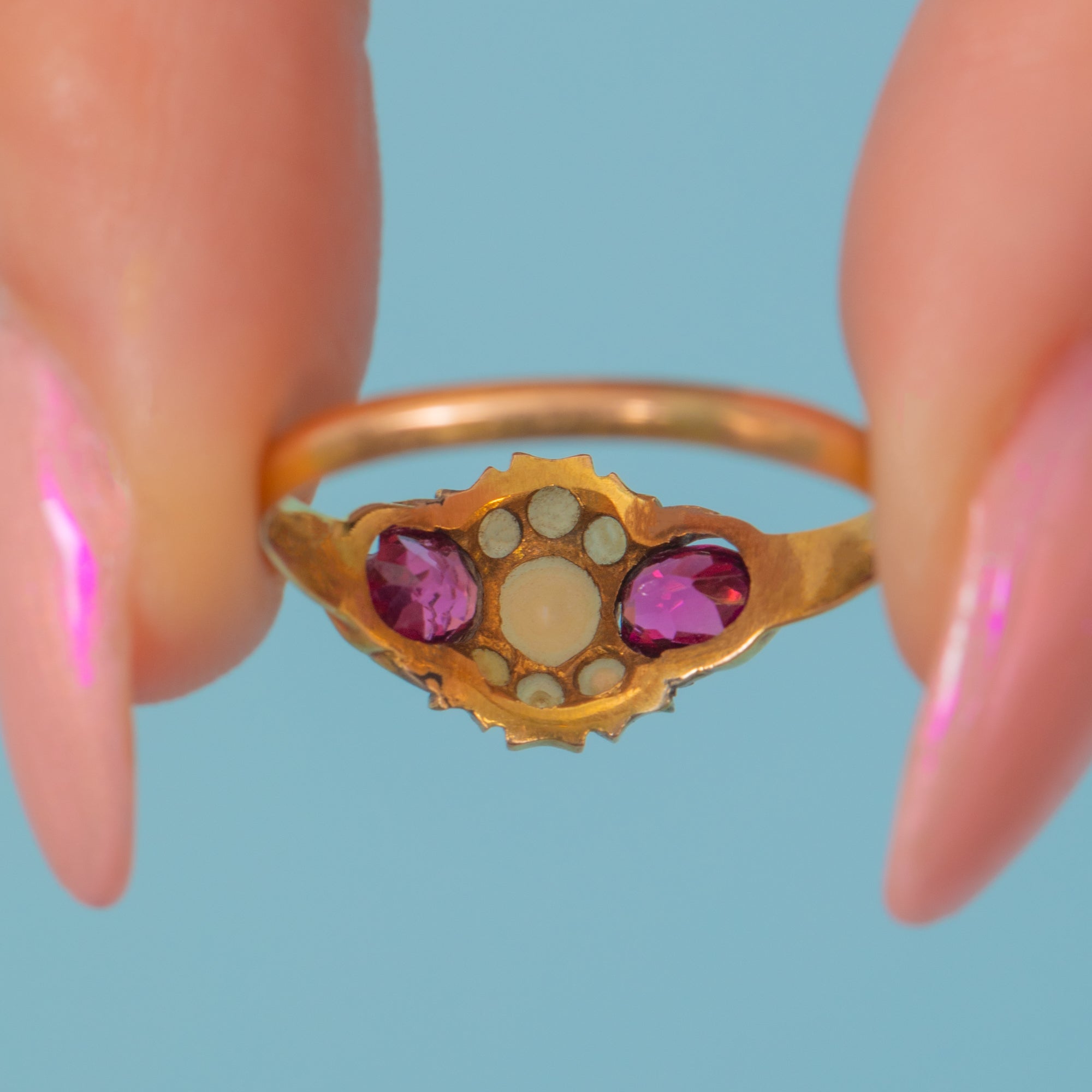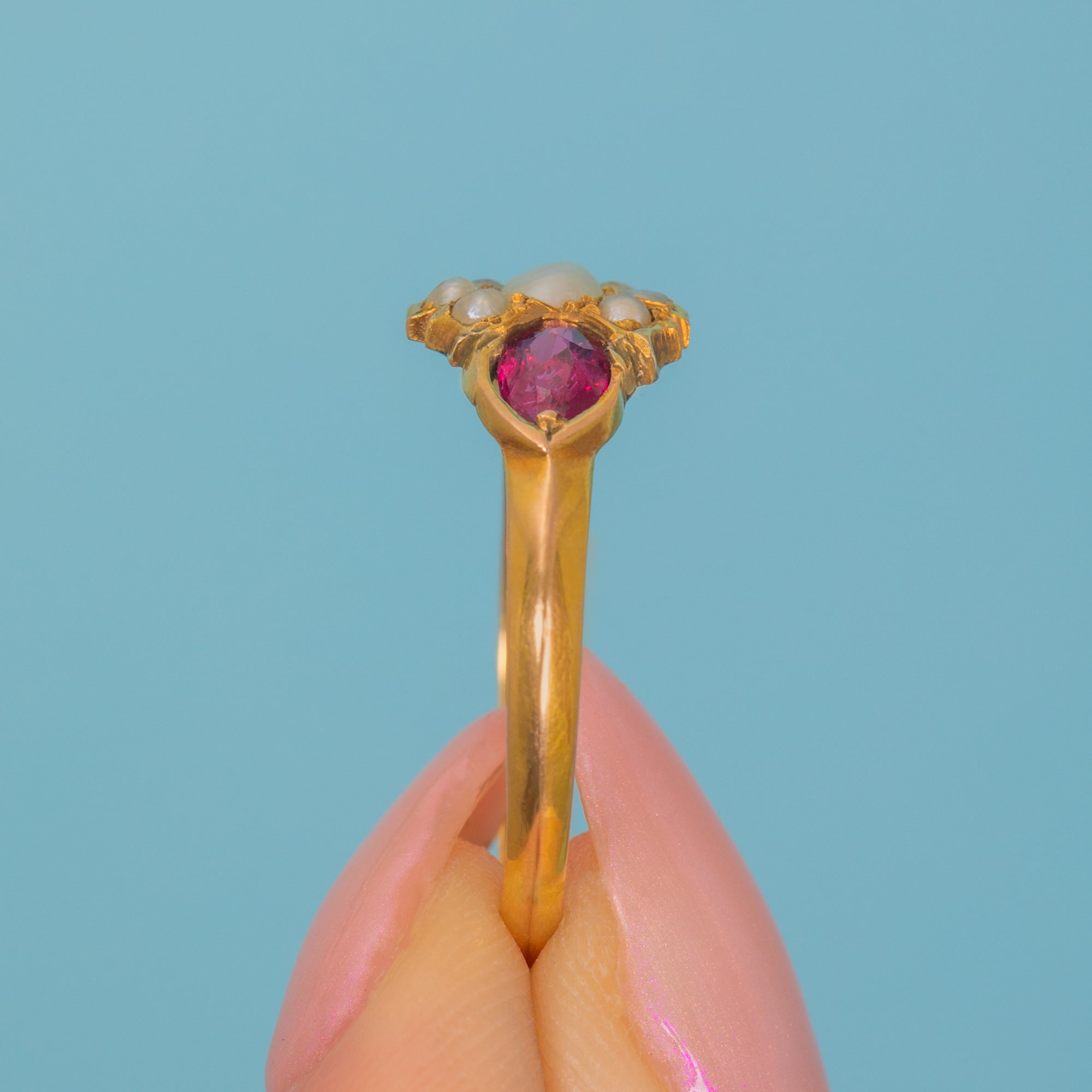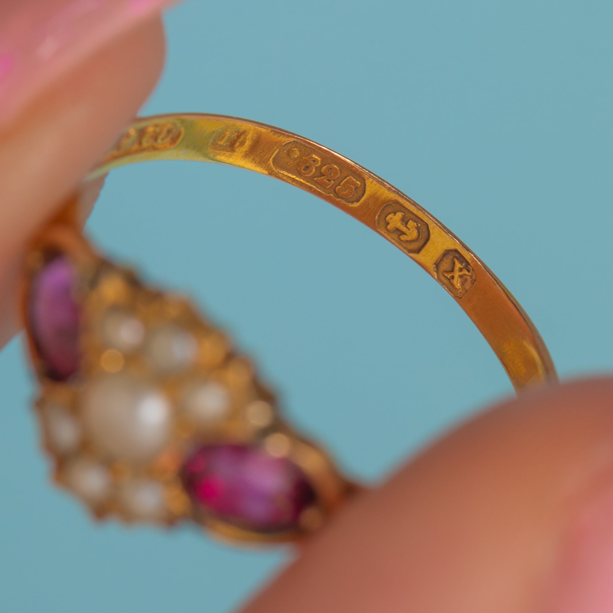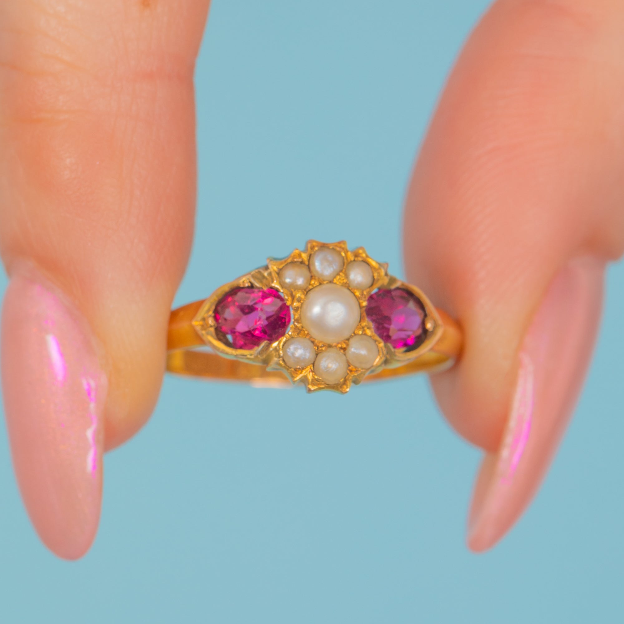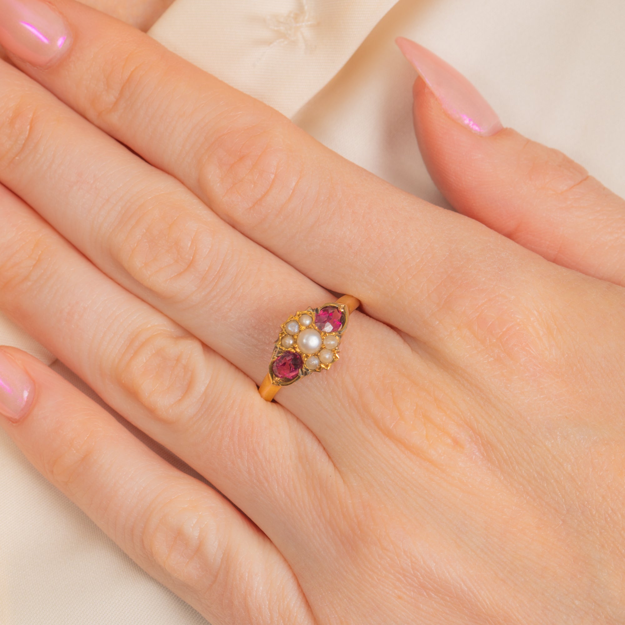 Victorian 15ct Gold Garnet Pearl Cluster Ring, 1872