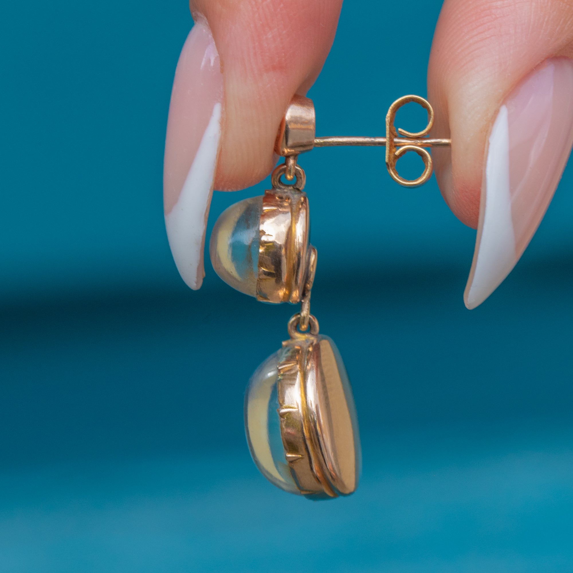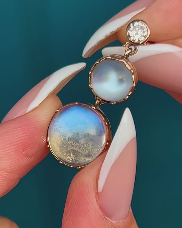 A luminous pair of Victorian drop earrings, each set with glowing Moonstones and accented by sparkling Old European Cut Diamonds. The Moonstones display a magical blue adularescence, glowing from within as the light shifts across their high-domed cabochons. Their ethereal beauty is perfectly offset by the crisp sparkle of the Diamonds above.