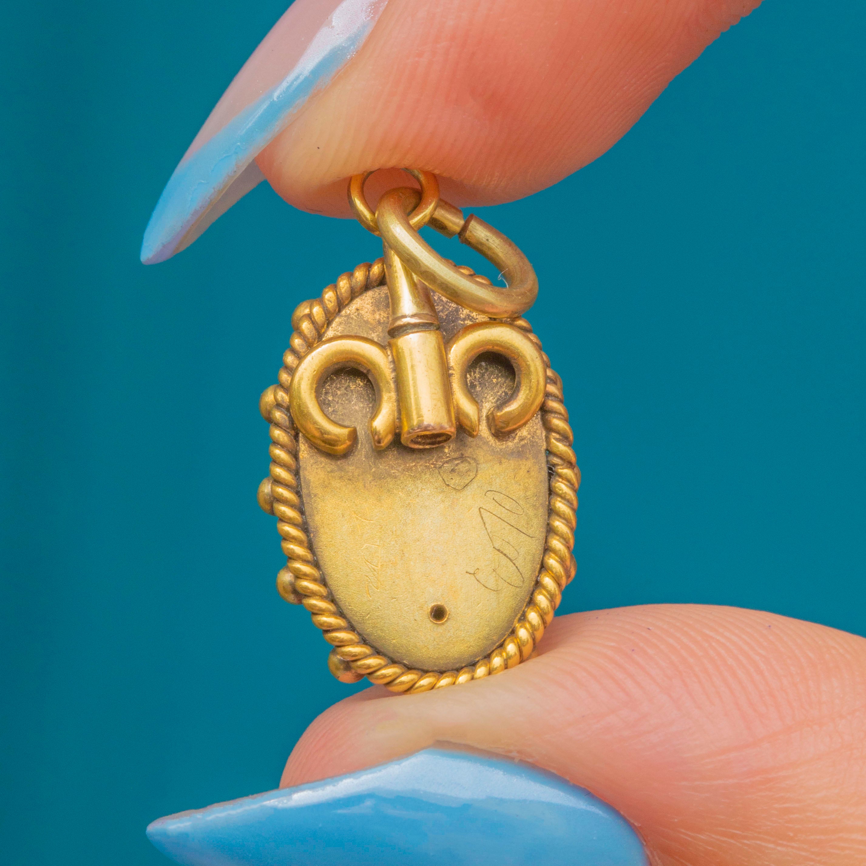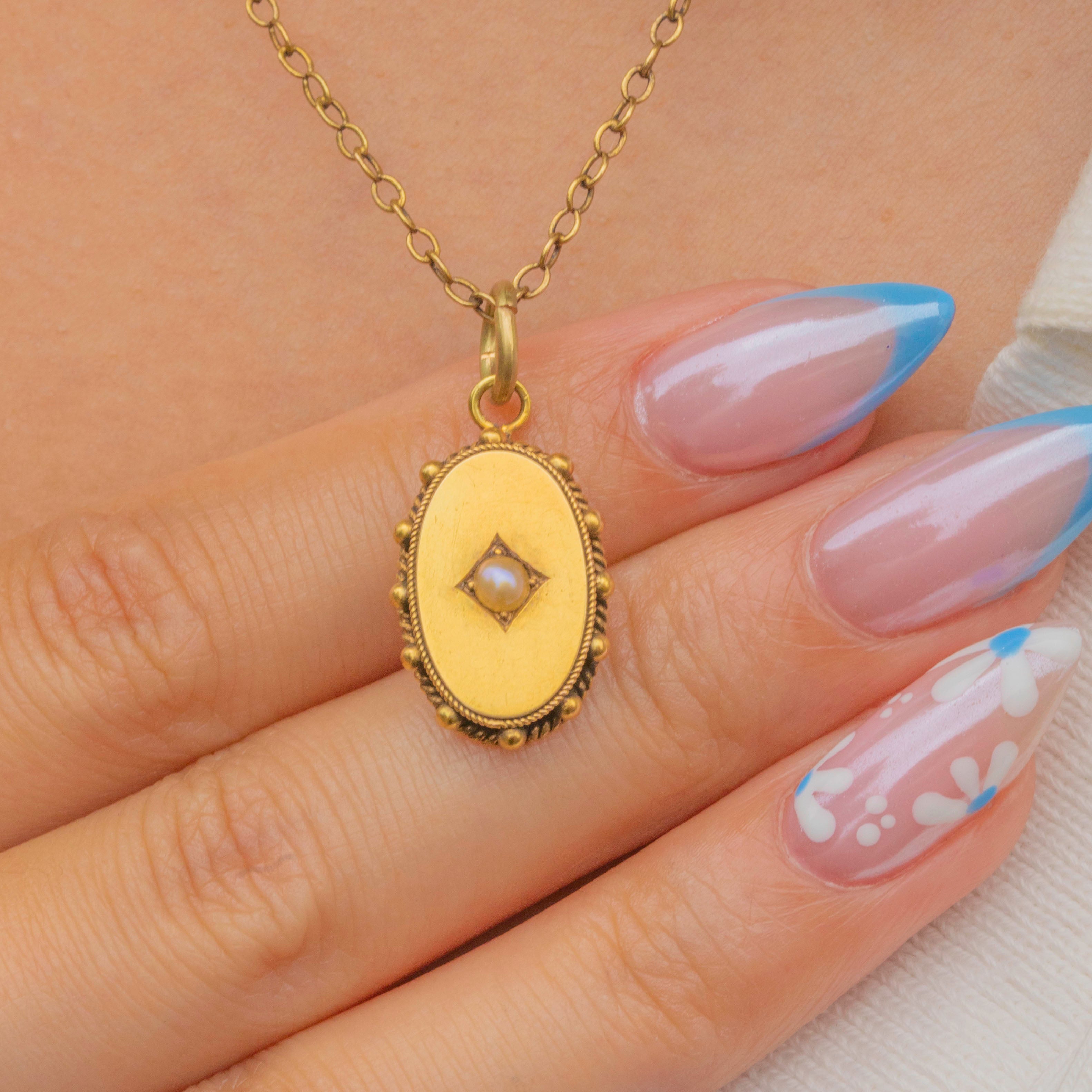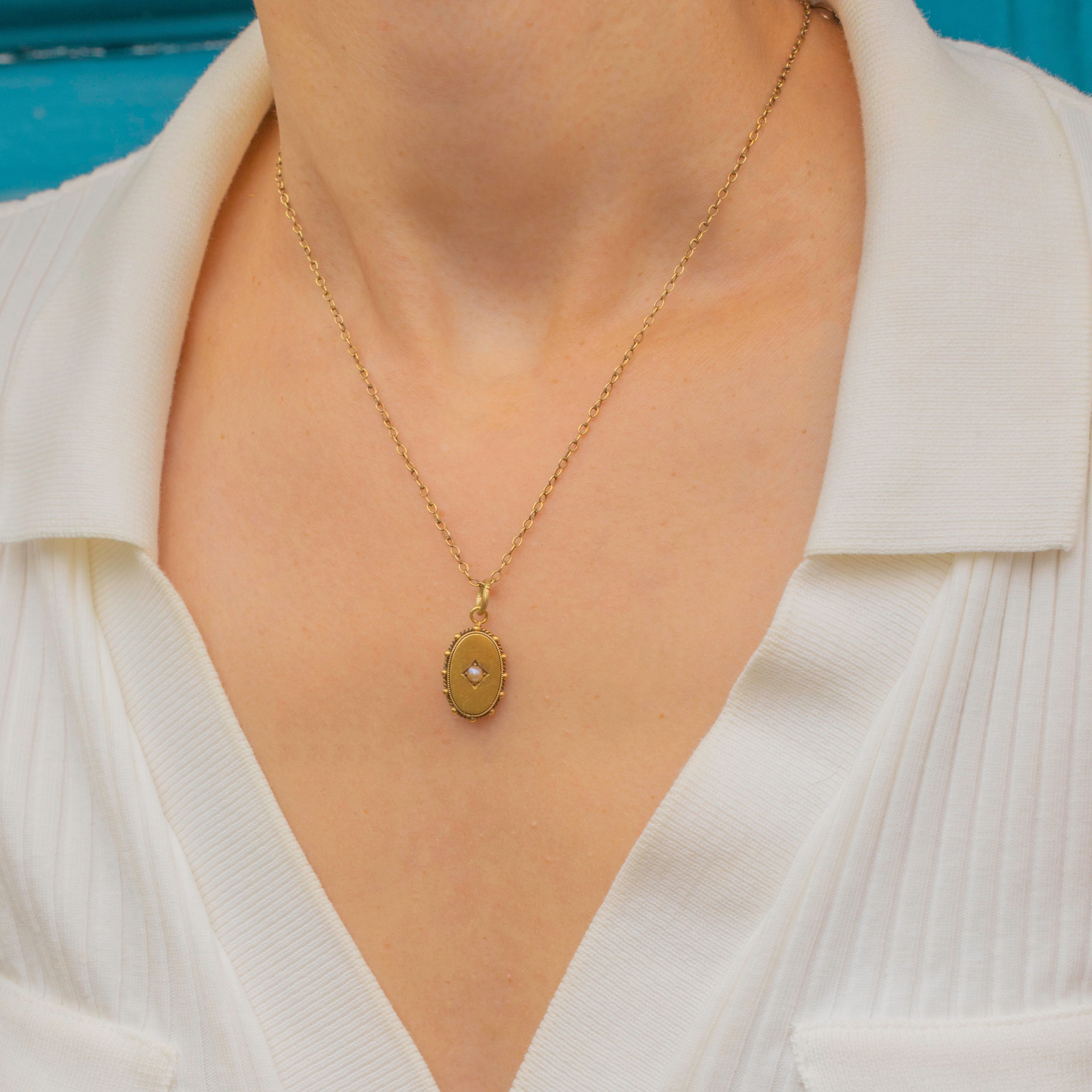 This charming antique pendant is crafted from saturated 15ct Gold with a rich satin finish, its smooth oval form adorned by a rope border and pretty beaded details.