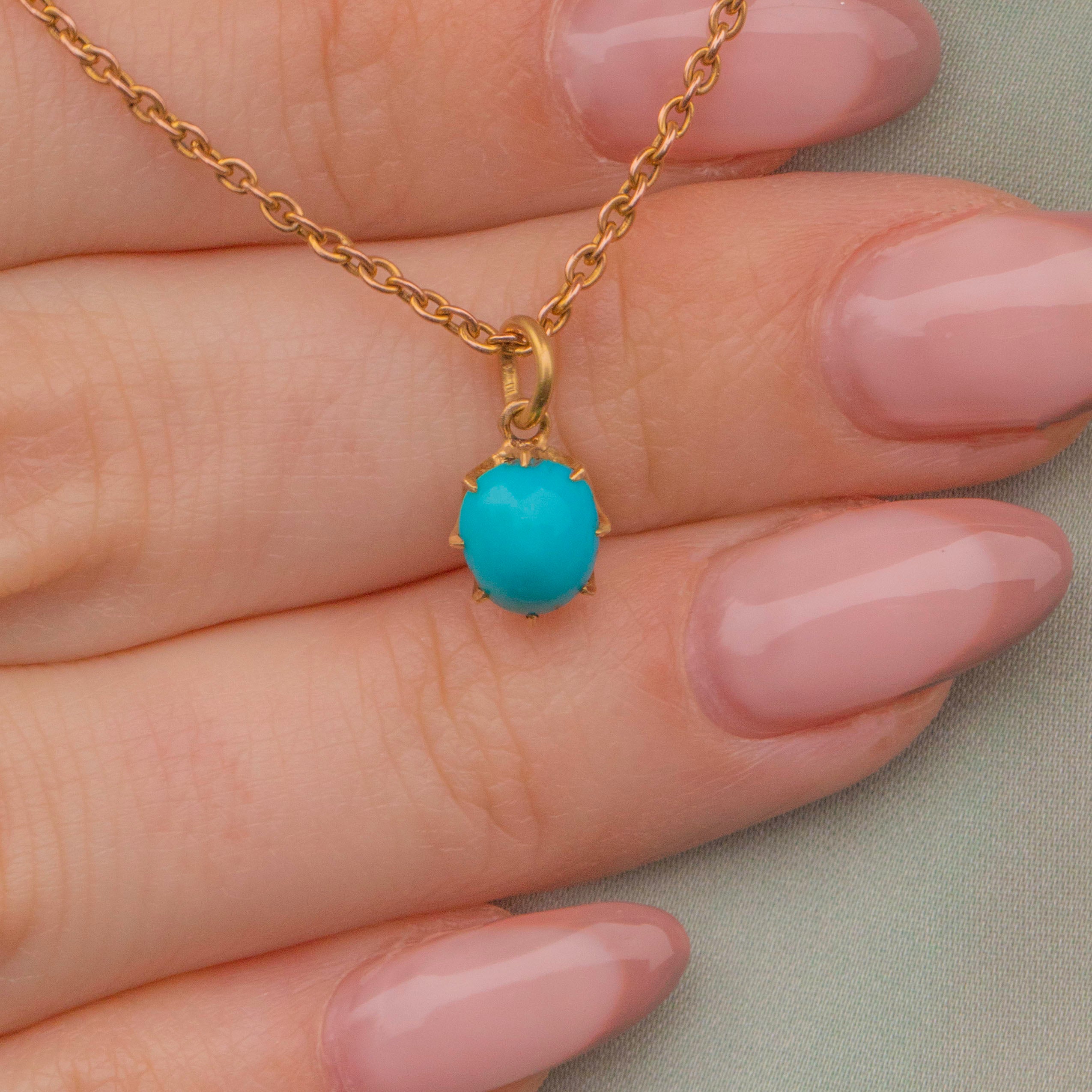 This sweet Victorian 15ct Gold Persian Turquoise charm will bring a welcome pop of colour to your necklace stack! This antique pendant features a vibrant sky-blue Turquoise cabochon displayed within a sumptuous 15ct Gold crown setting, and is the perfect dainty size for everyday wear.