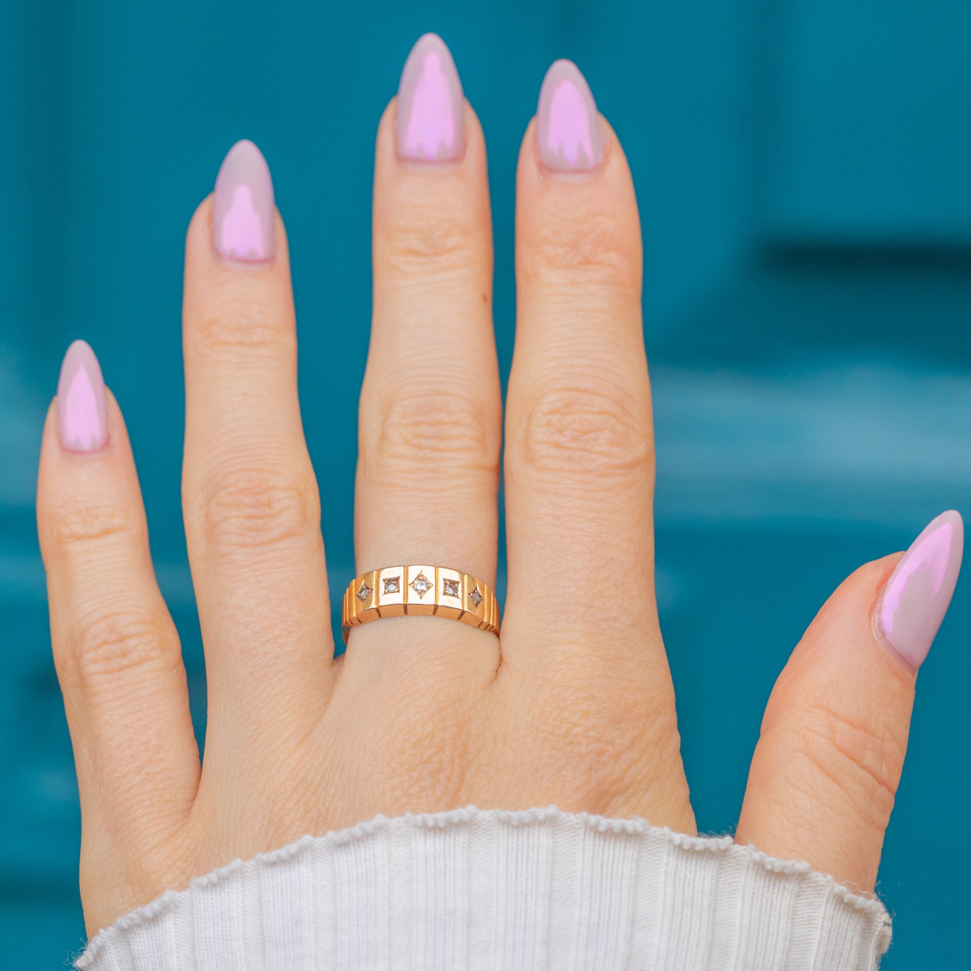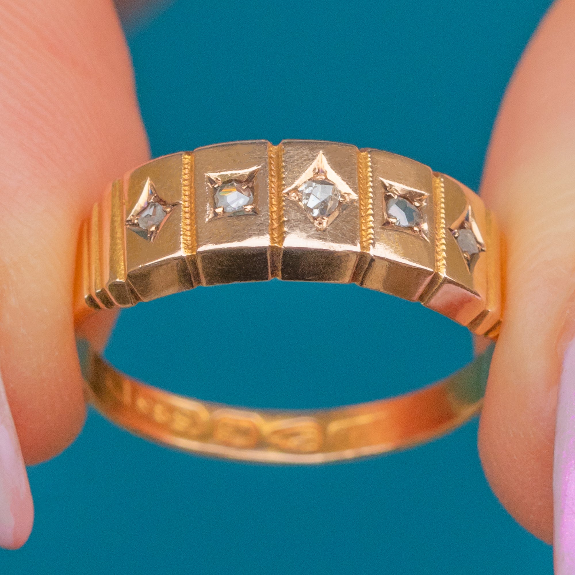 A charming Victorian “Gypsy” ring crafted in glowing 15ct Gold, set with twinkling rose-cut Diamonds that graduate gently across the front. The softly domed band and star-set Diamonds create a beautiful play of light, with a classic design that remains effortlessly wearable today.