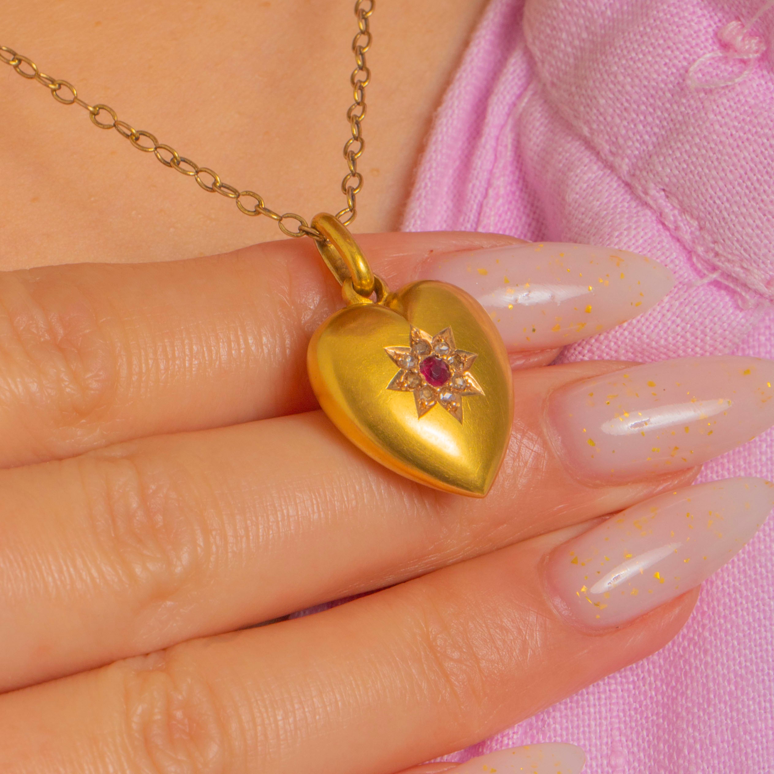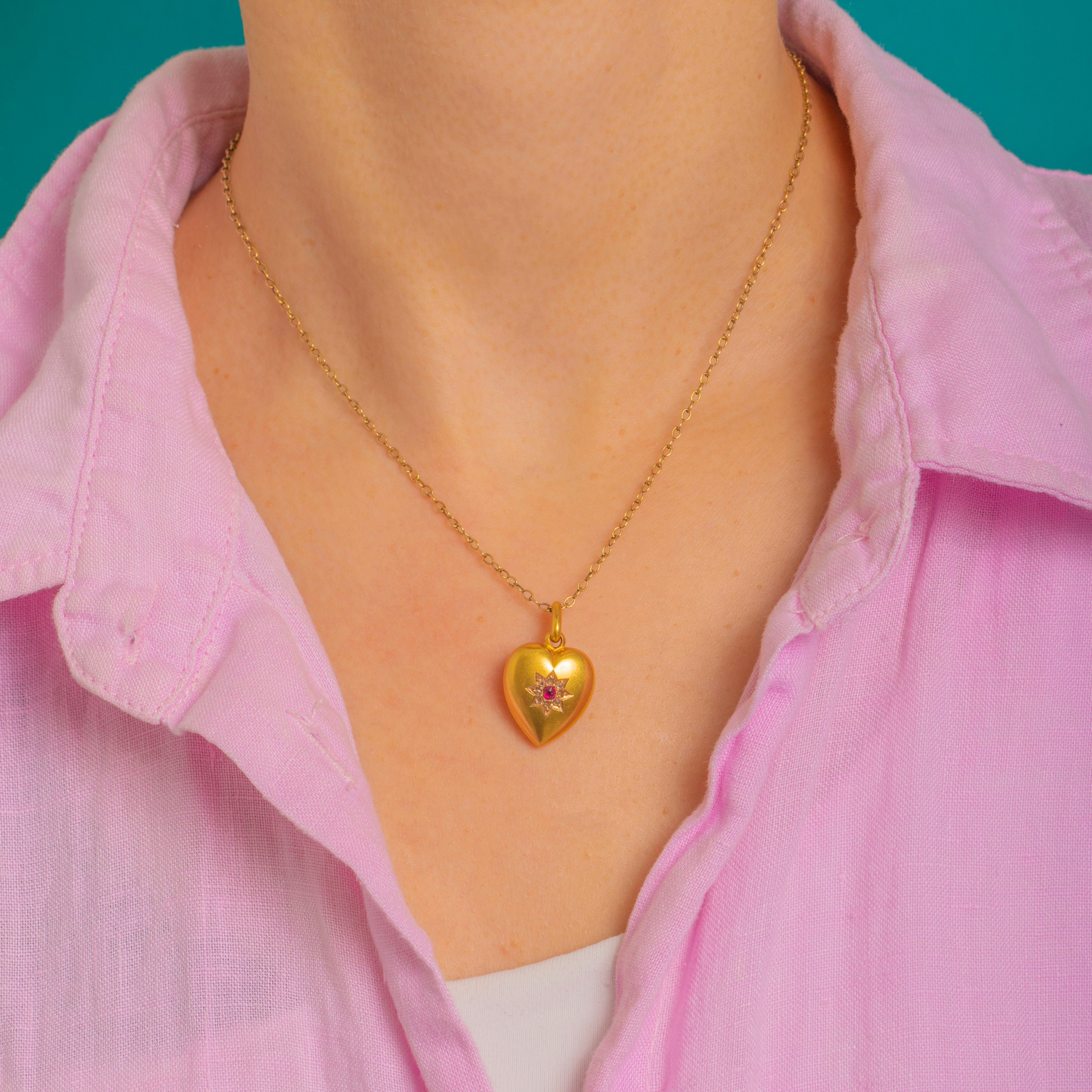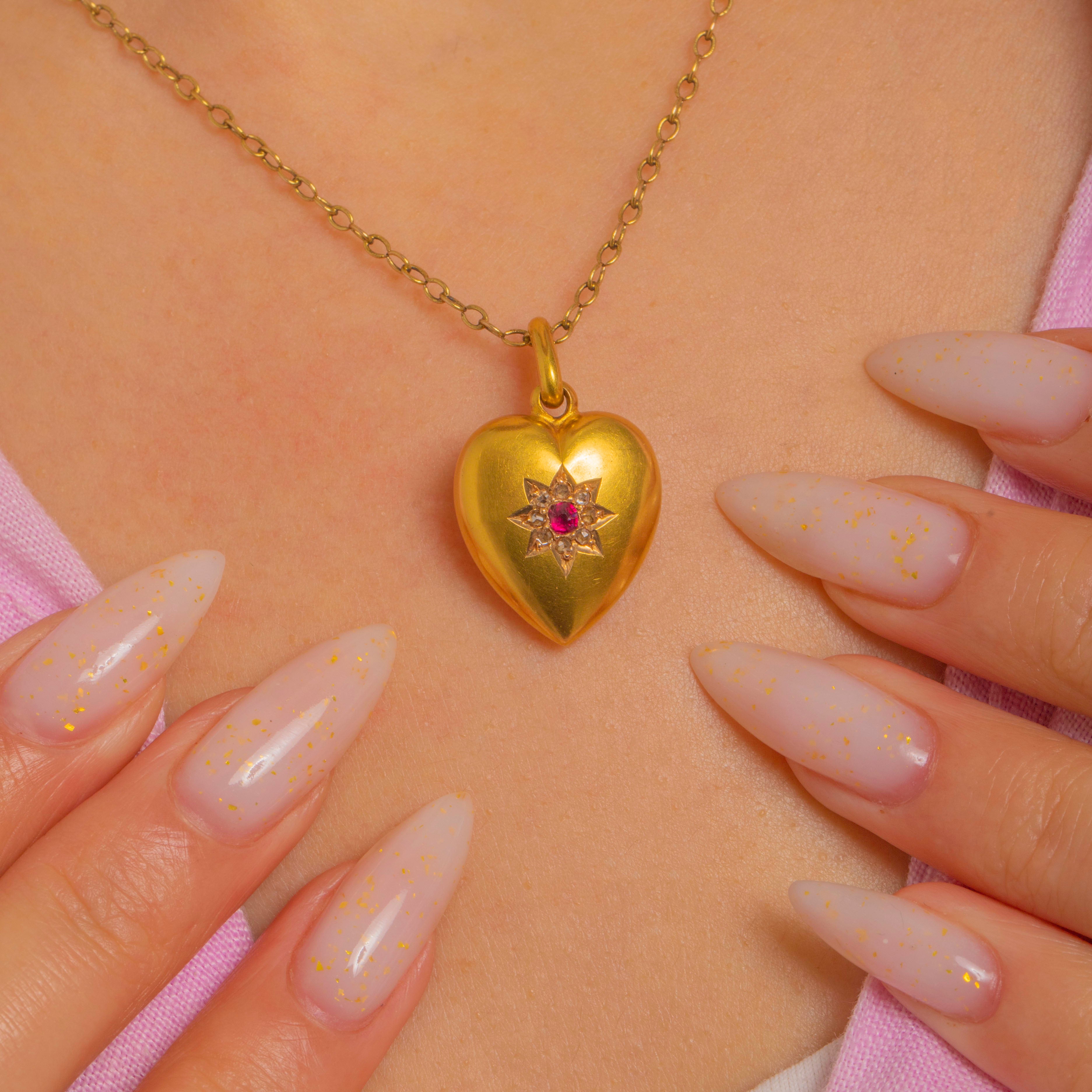 A sweet Victorian treasure, this puffy heart pendant is crafted in richly hued 15ct Gold and sprinkled with romantic sparkle. The gently domed heart is starburst‑engraved to the centre, where a round Ruby glows a vivid red, framed by dainty Diamond accents set flush for a sleek finish.