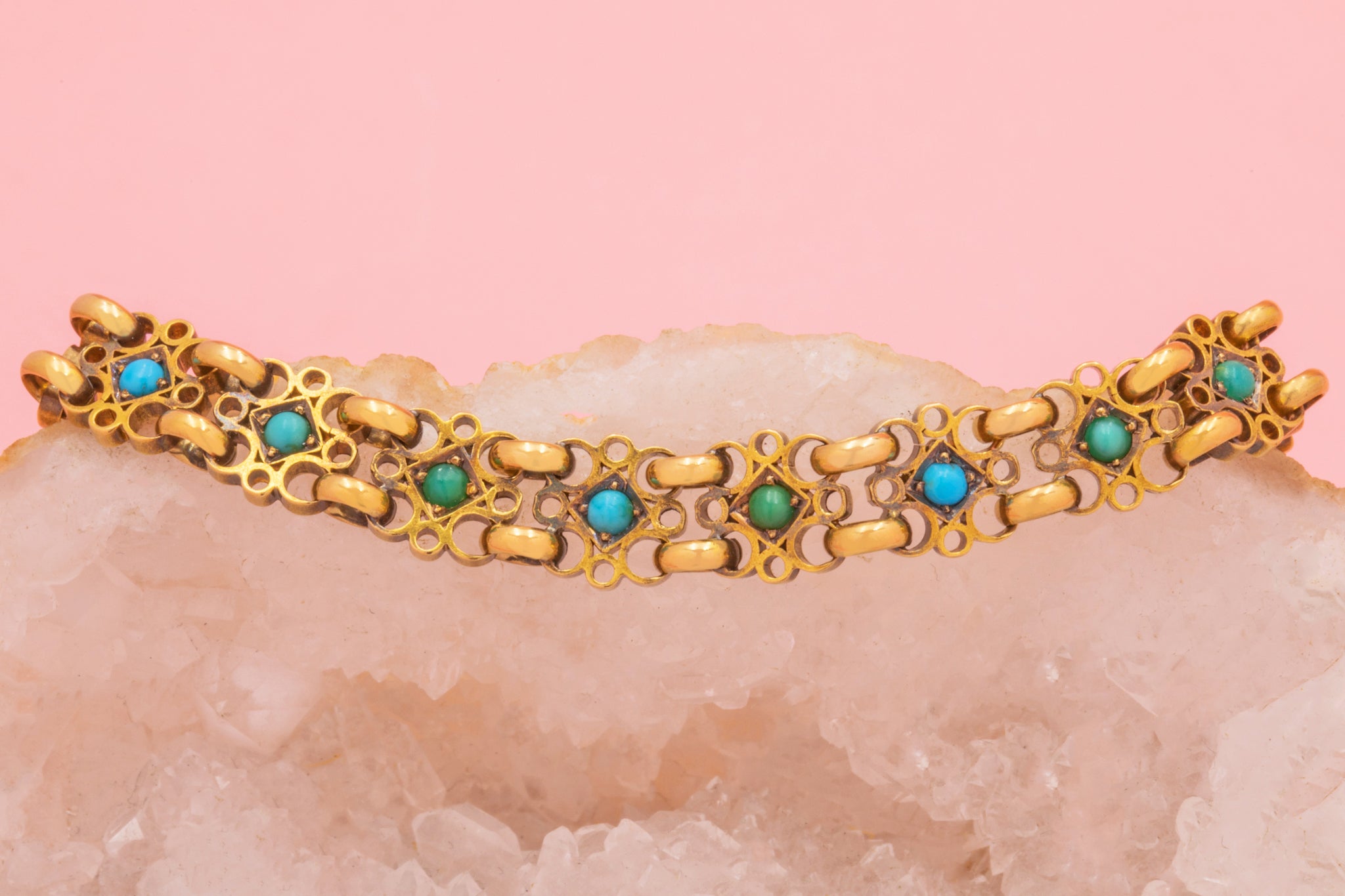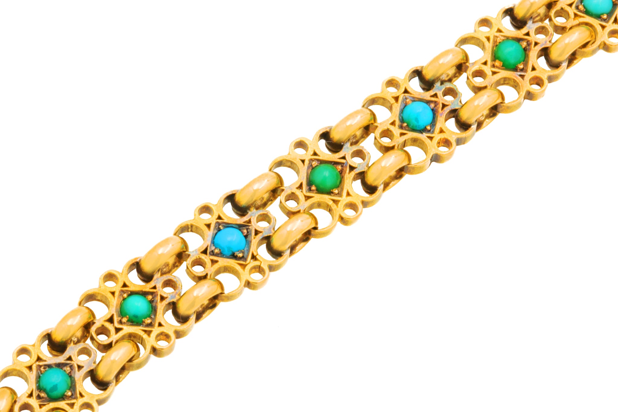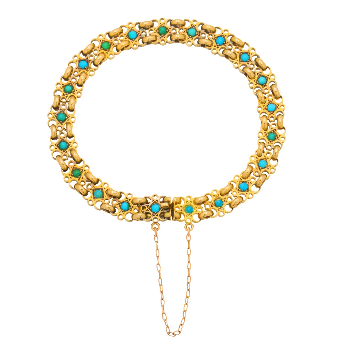 How delightful is this Victorian 15ct Gold Turquoise bracelet! Each geometric link is formed of filigree-inspired wirework crafted from honey-hued 18ct Gold. At the centre of each link sits a Turquoise cabochon flaunting a spectrum of blues between them, they stand out from afar contrasting against the glossy Gold.