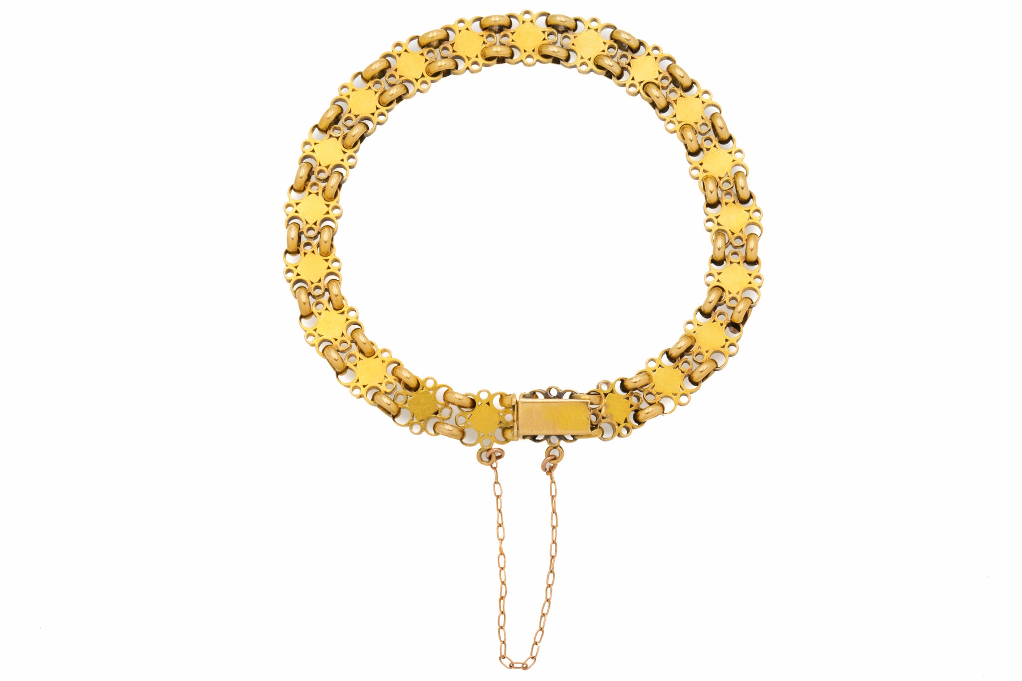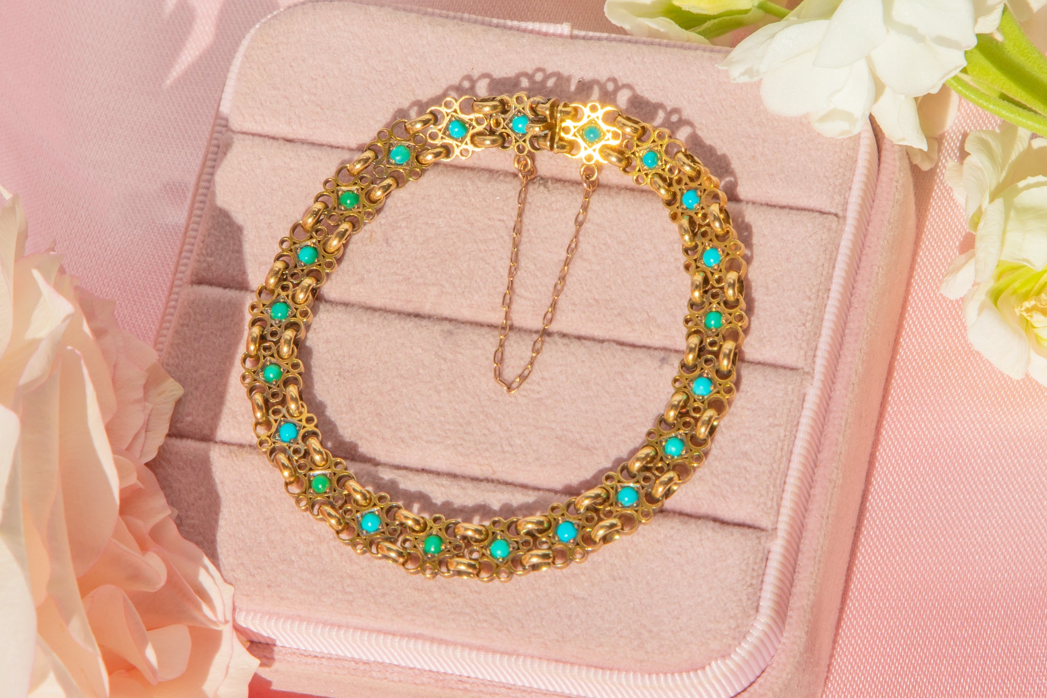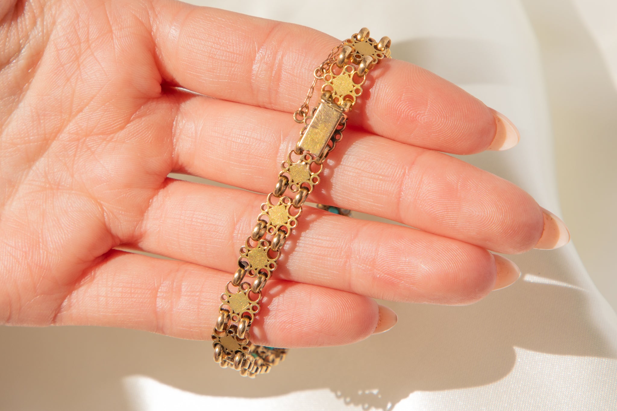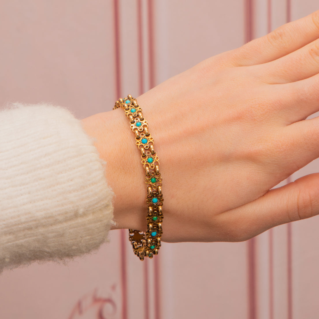 How delightful is this Victorian 15ct Gold Turquoise bracelet! Each geometric link is formed of filigree-inspired wirework crafted from honey-hued 18ct Gold. At the centre of each link sits a Turquoise cabochon flaunting a spectrum of blues between them, they stand out from afar contrasting against the glossy Gold.
