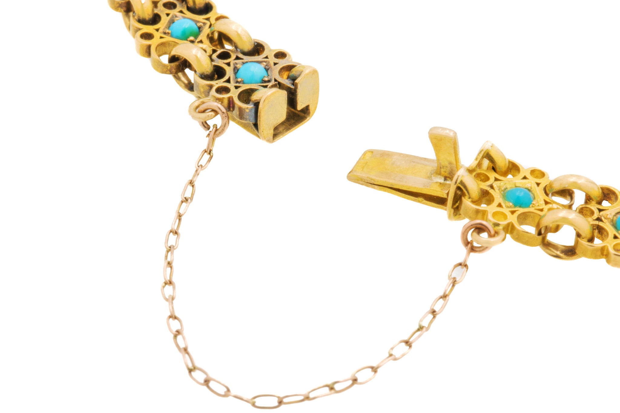 MATERIALS:  Tests as  18ct Gold bracelet, 15ct Gold tongue, 12ct Gold safety chain, Turquoise.