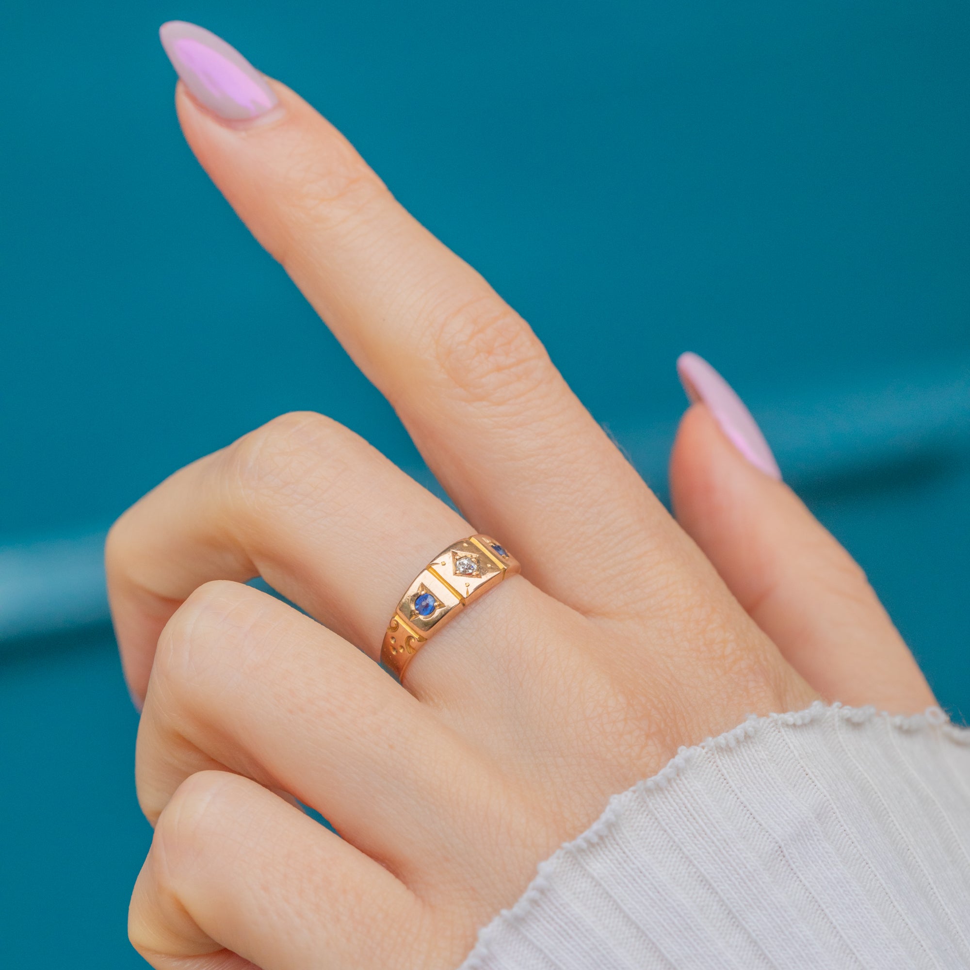 A classic Victorian “gypsy” ring in rich 15ct Gold, star-set with a sparkling Diamond flanked by vivid blue Sapphires. The smooth domed band and crisp geometric settings give this piece that quintessential late-19th-century look—chic on its own and perfect for stacking.