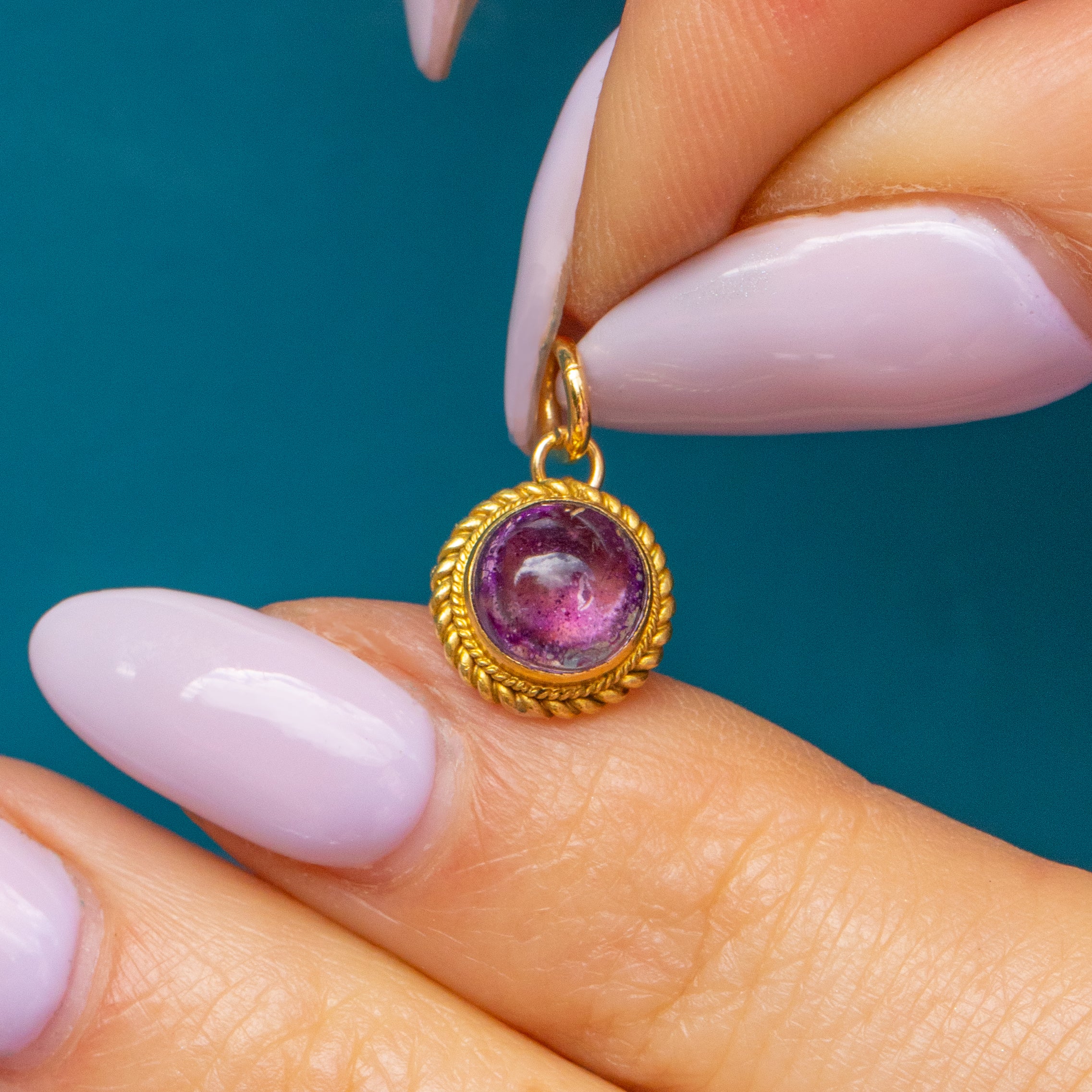 VERY GOOD-EXCELLENT. This Victorian 18ct Gold Amethyst charm is in very good to excellent condition. From the front, this Amethyst charm is in fabulous condition with a plump Amethyst cabochon and pristine rope details bordering it. To the back there is some subtle wear from a previous conversion from a stick pin, however, carried out expertly this has caused minimal damage. A new treasure ready to become a part of your jewellery collection.