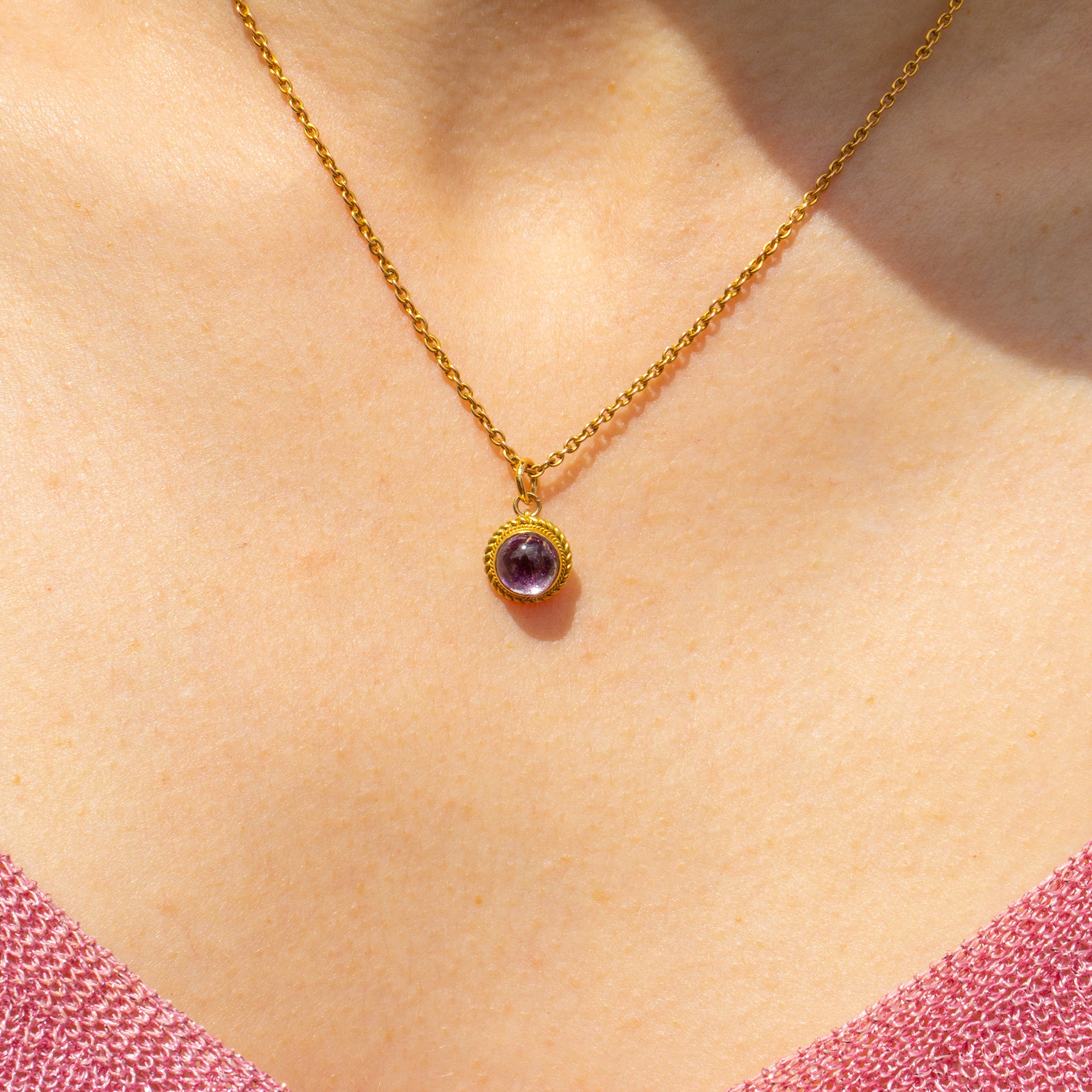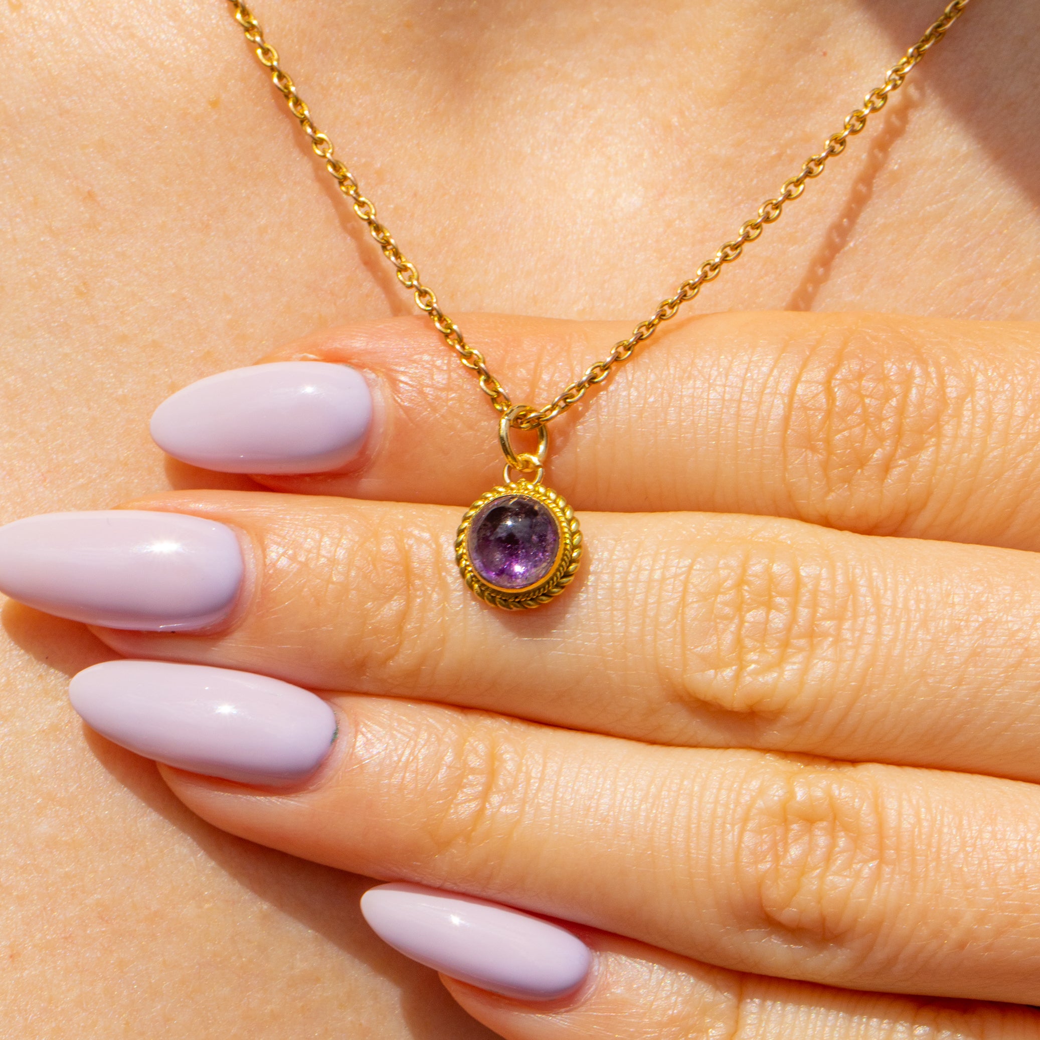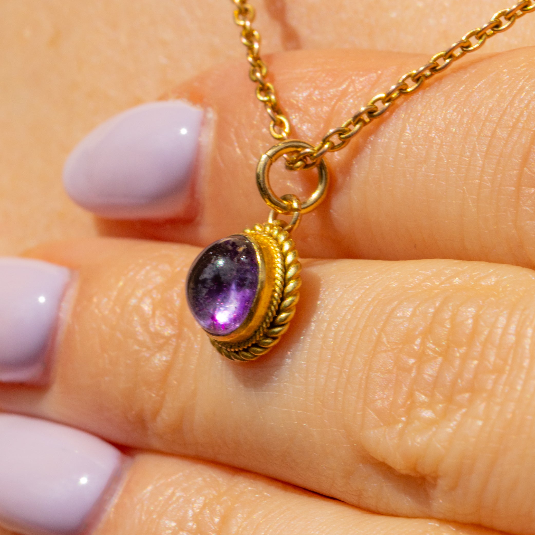 Deep violet hues sit at the core of her Amethyst cabochon, encased by a buttery 18ct Gold setting. Once suspended from an antique Gold chain, she will become a firm favourite within your jewellery collection!