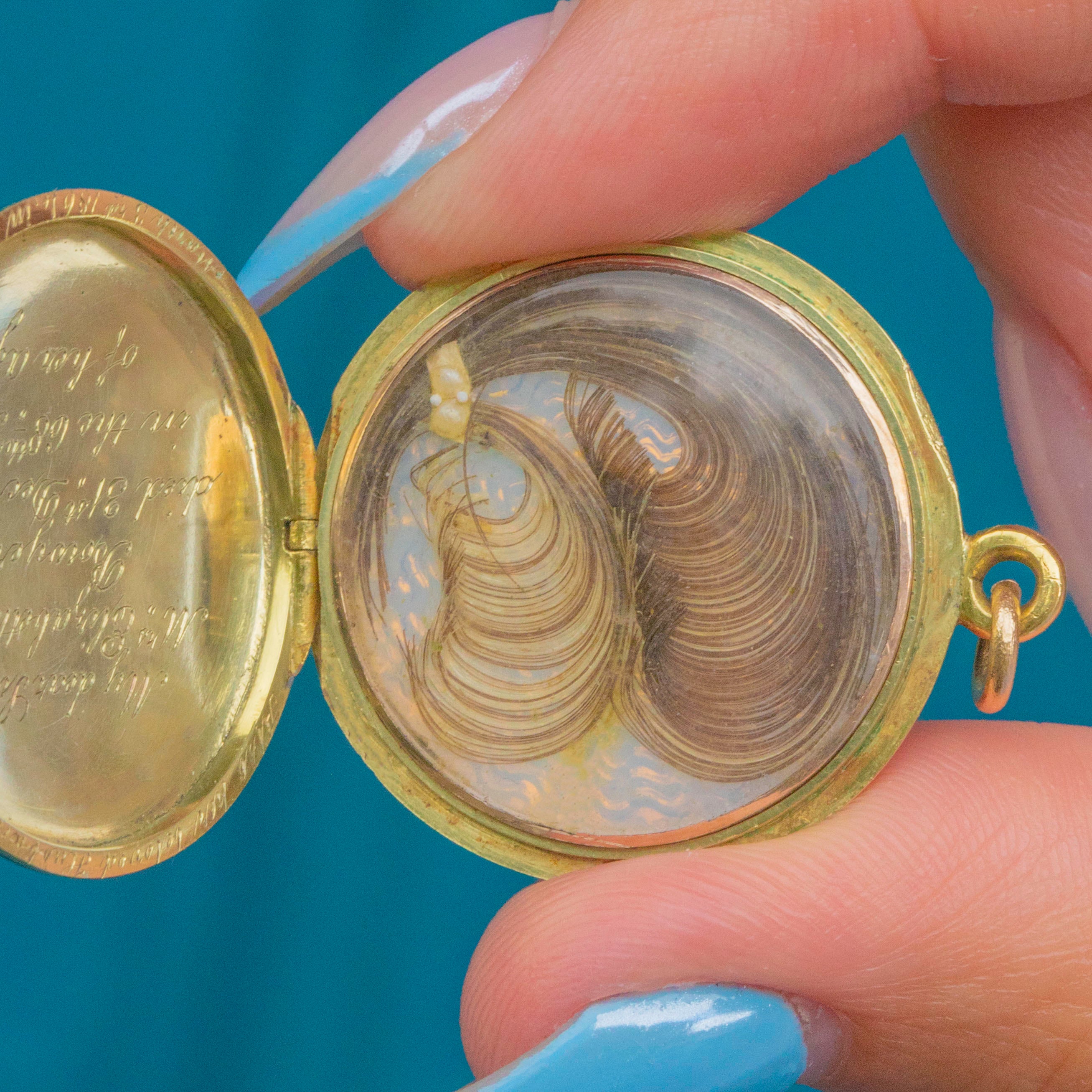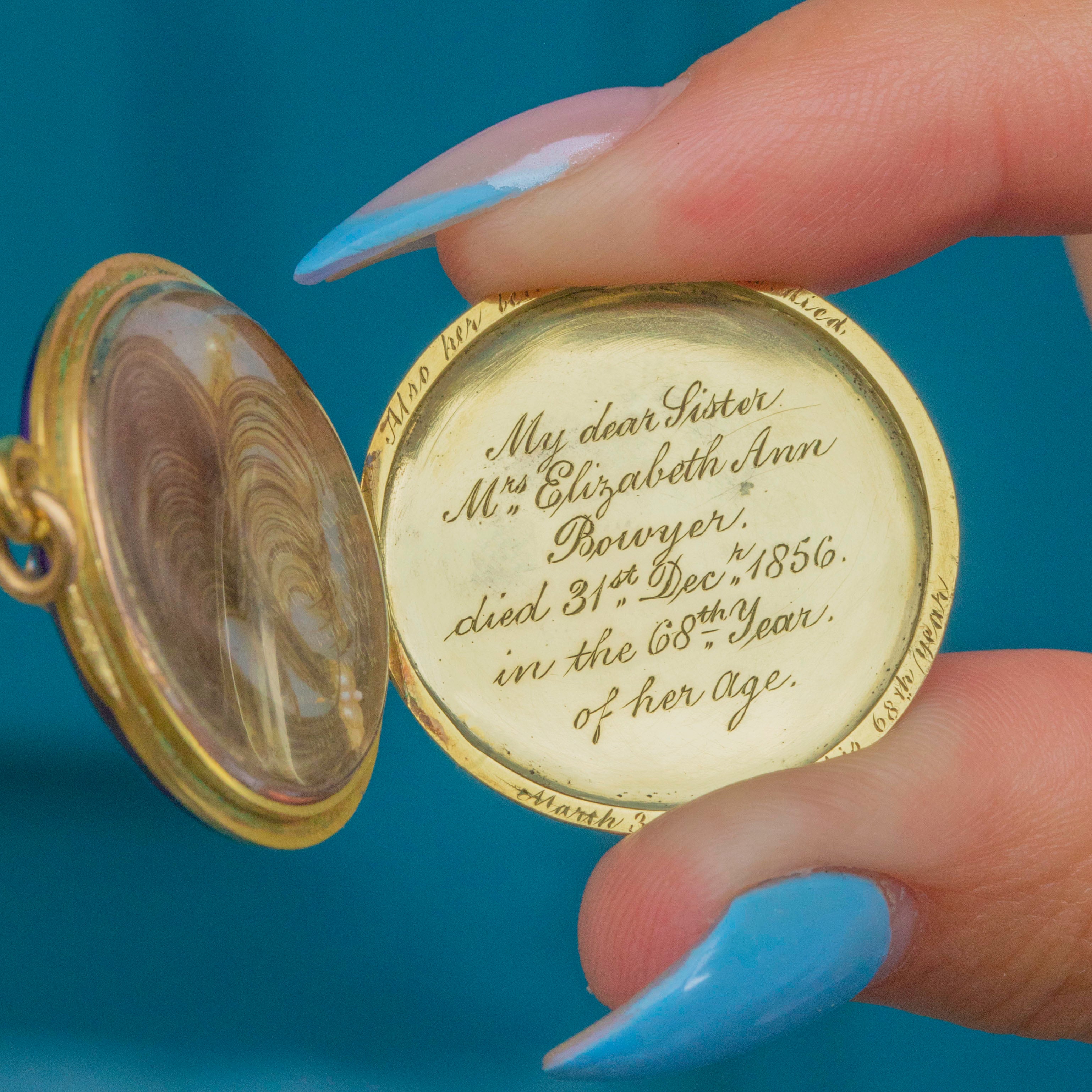 EXCELLENT: This antique Victorian 9ct Gold mourning hair locket is in exquisite condition for its long life. The Enamel has kept in pristine condition with no dinks or dents to note. Her Pearls are all present and secure and have a delightful lustre with minimal wear. Equally her wonderful engravings are immaculate and the lock of her well in place. Presented in her original box, she will be worn and adored for generations to come.