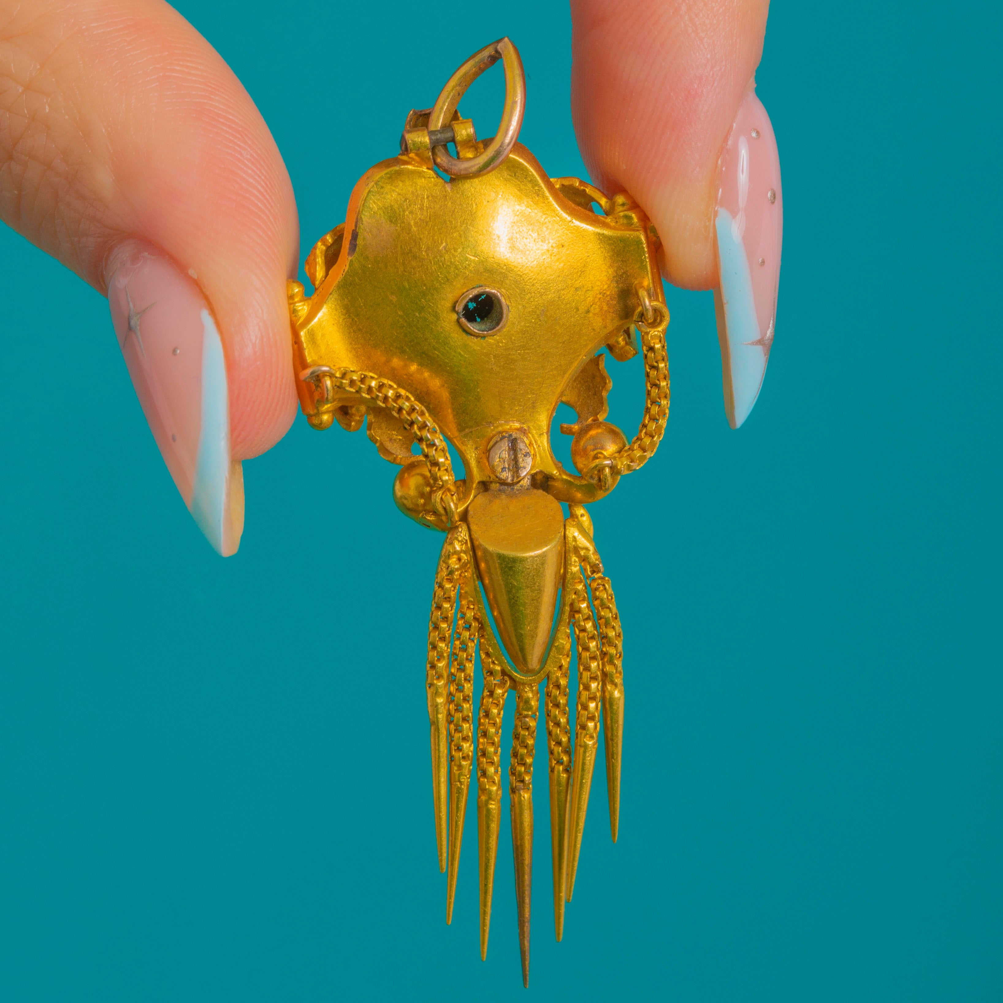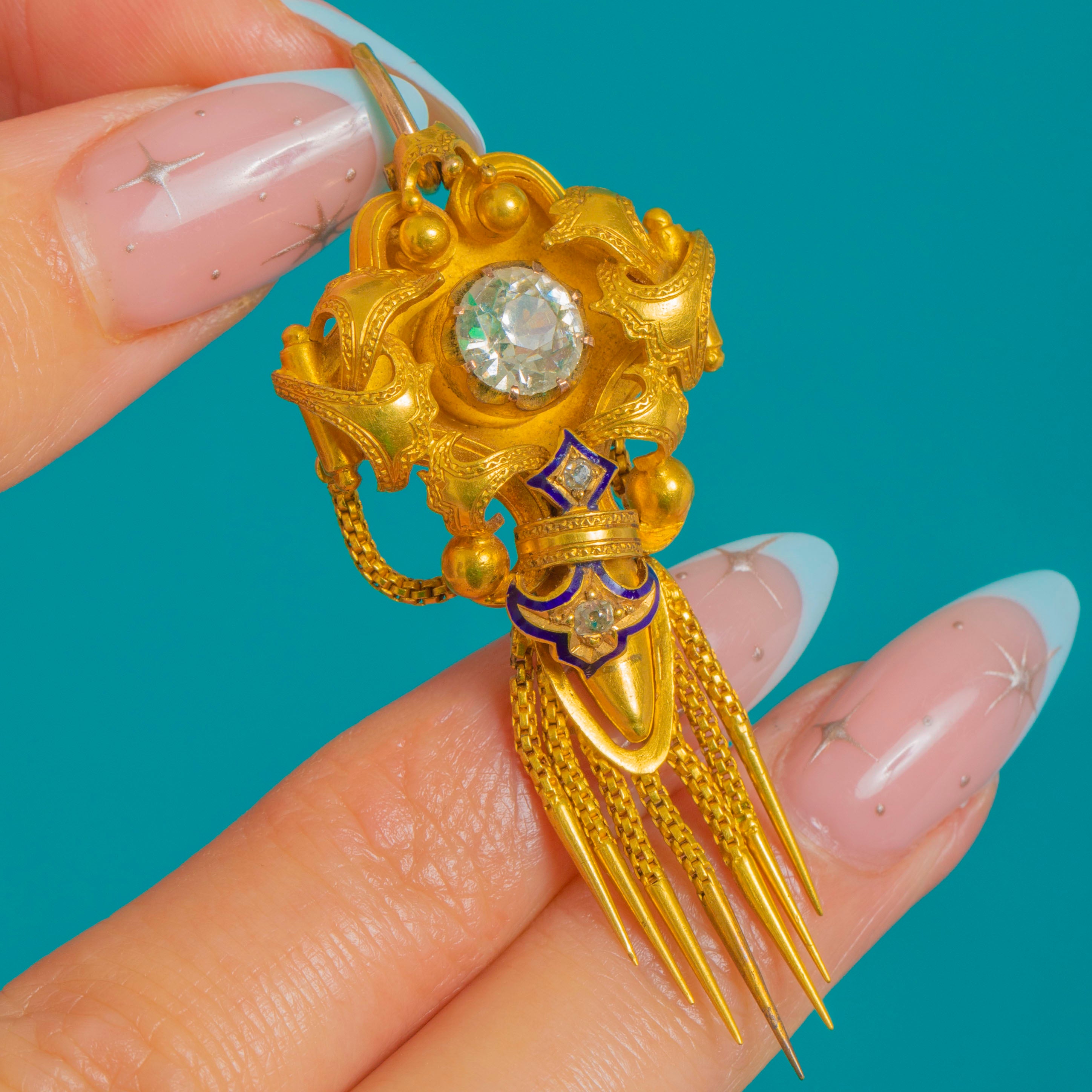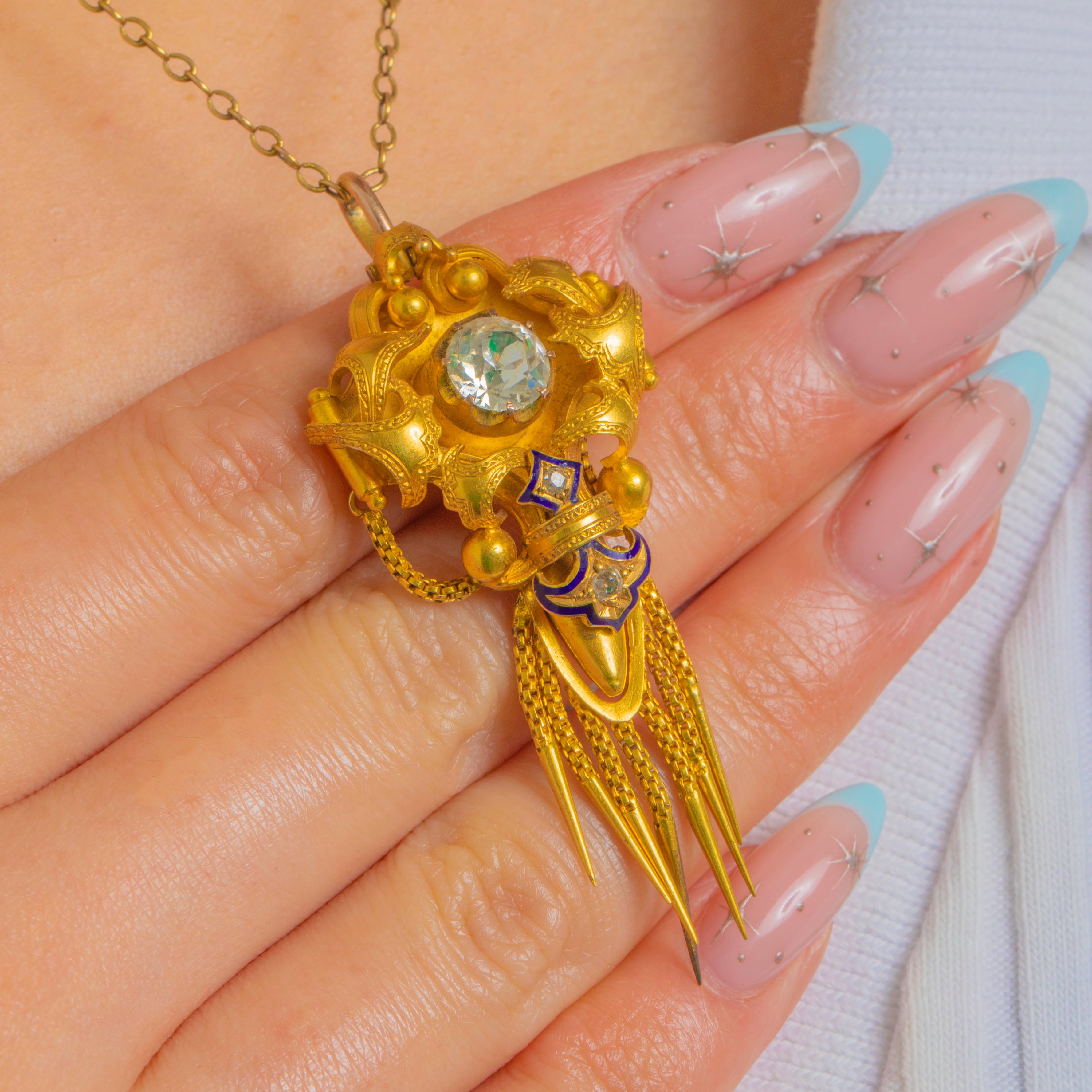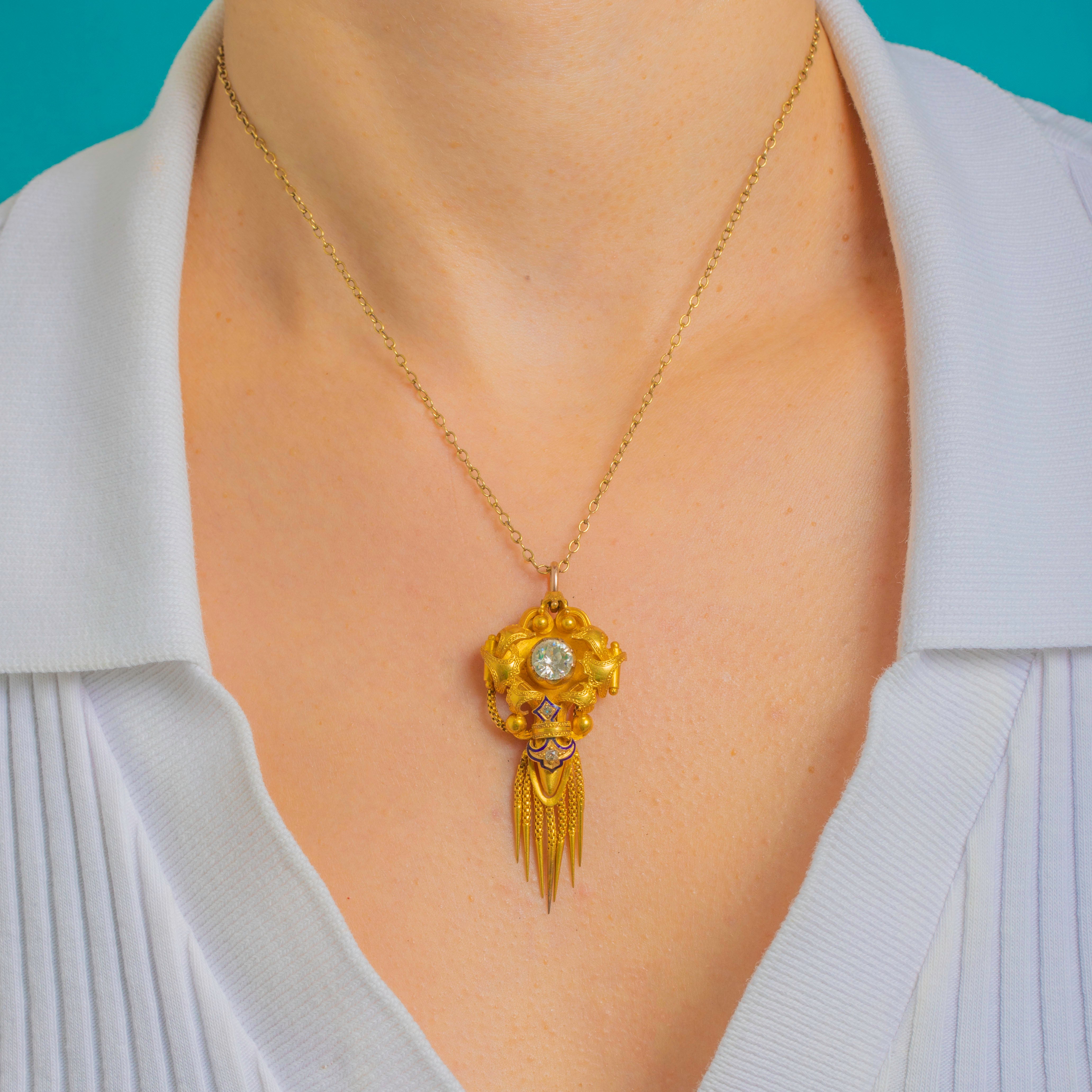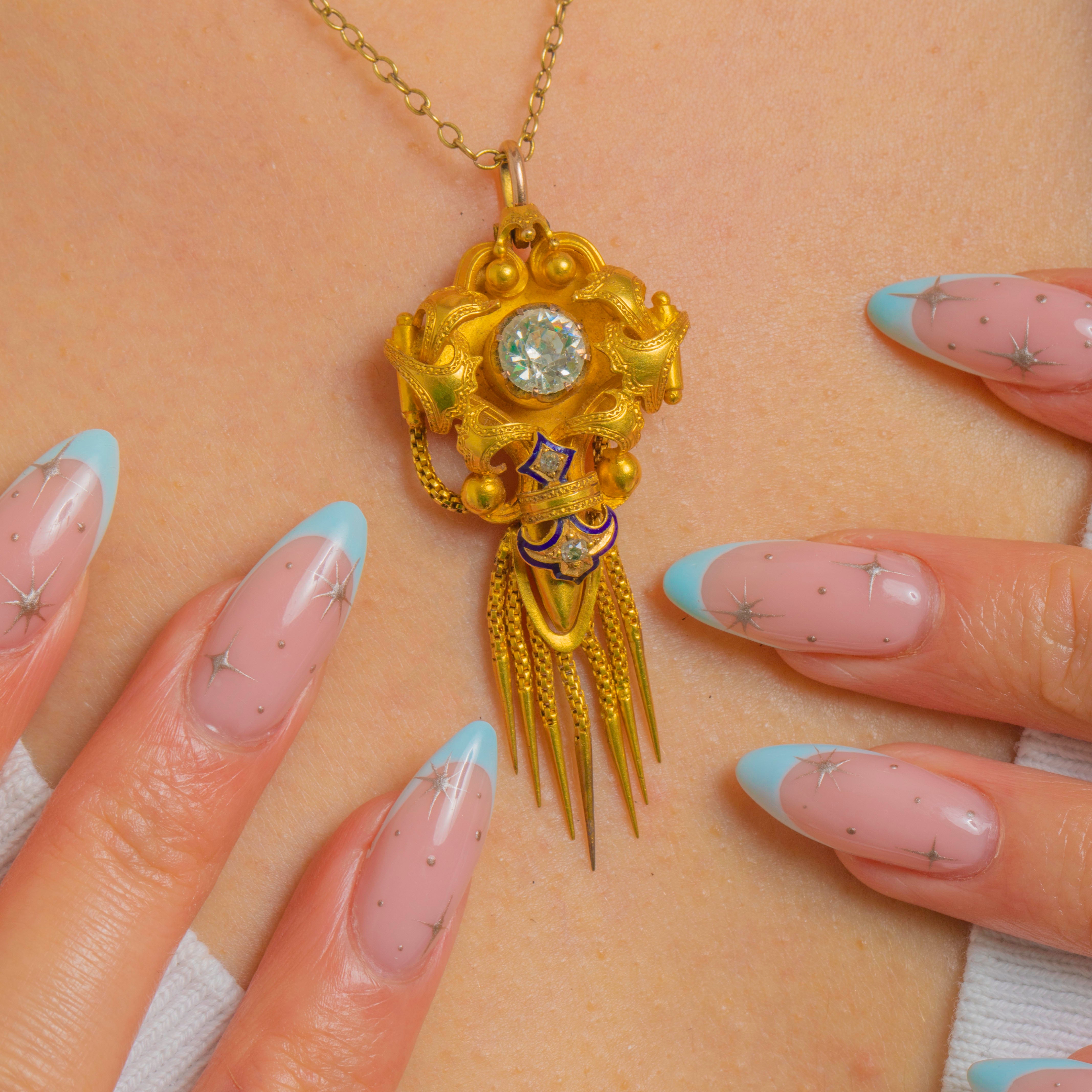 Sumptuous Victorian design meets Archaeological Revival allure in this exquisite antique pendant, crafted in richly hued 18ct Gold and accented with deep cobalt-blue Enamel. The sculptural, multi-part silhouette is centred by a raised round Rock Crystal in a high collet, framed by applied bead “granulation” and elegant scrolls. A lively articulated fringe of fine fox chain tassels with conical drops lends movement and drama, while a petite chain swag and star detail add a charming, classical touch.