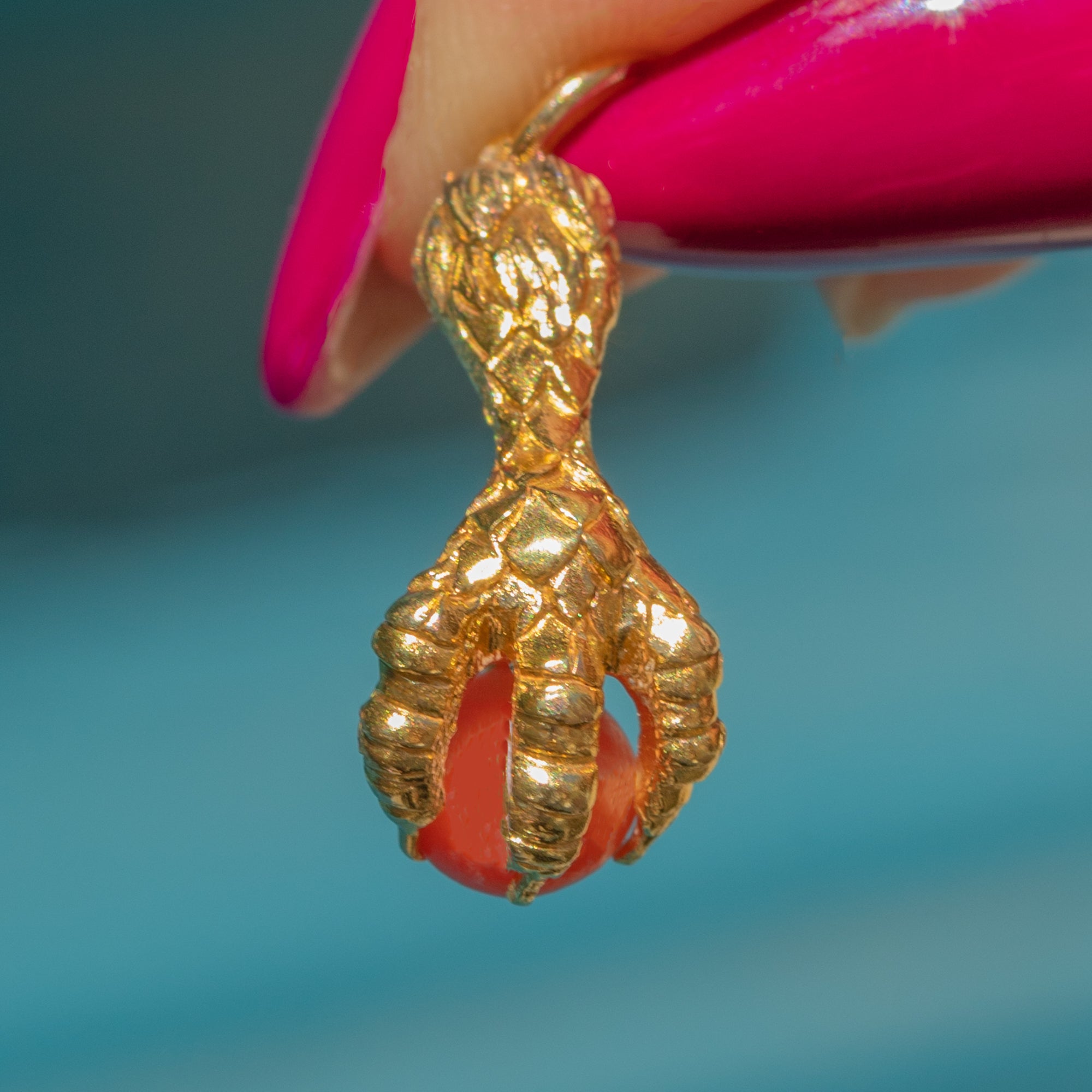 This eagle claw charm will set your jewellery collection apart from the crowd. Within the four claws of this charm lies a striking Coral, held by intricately formed 18ct Gold, allowing you to admire the pendant from every angle.