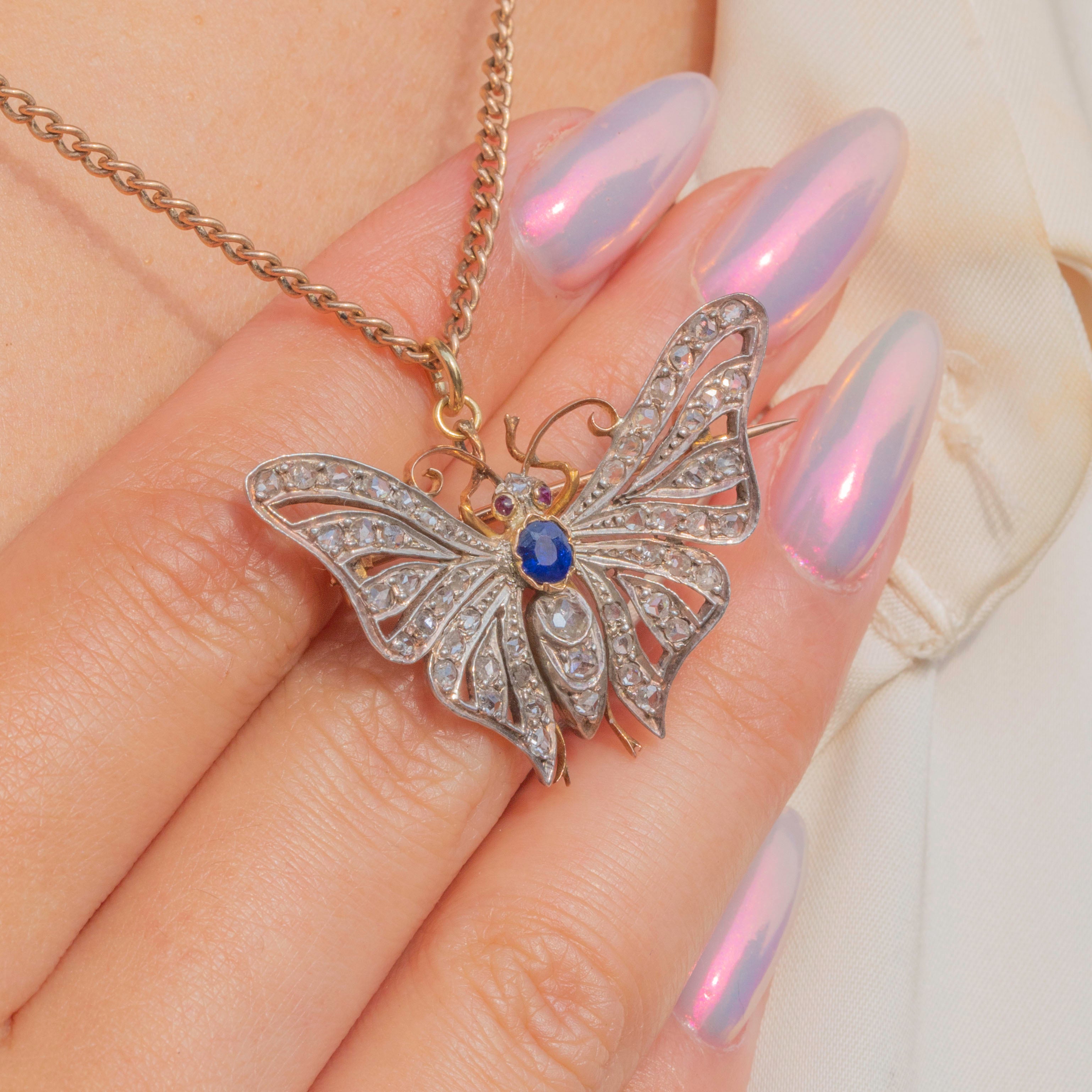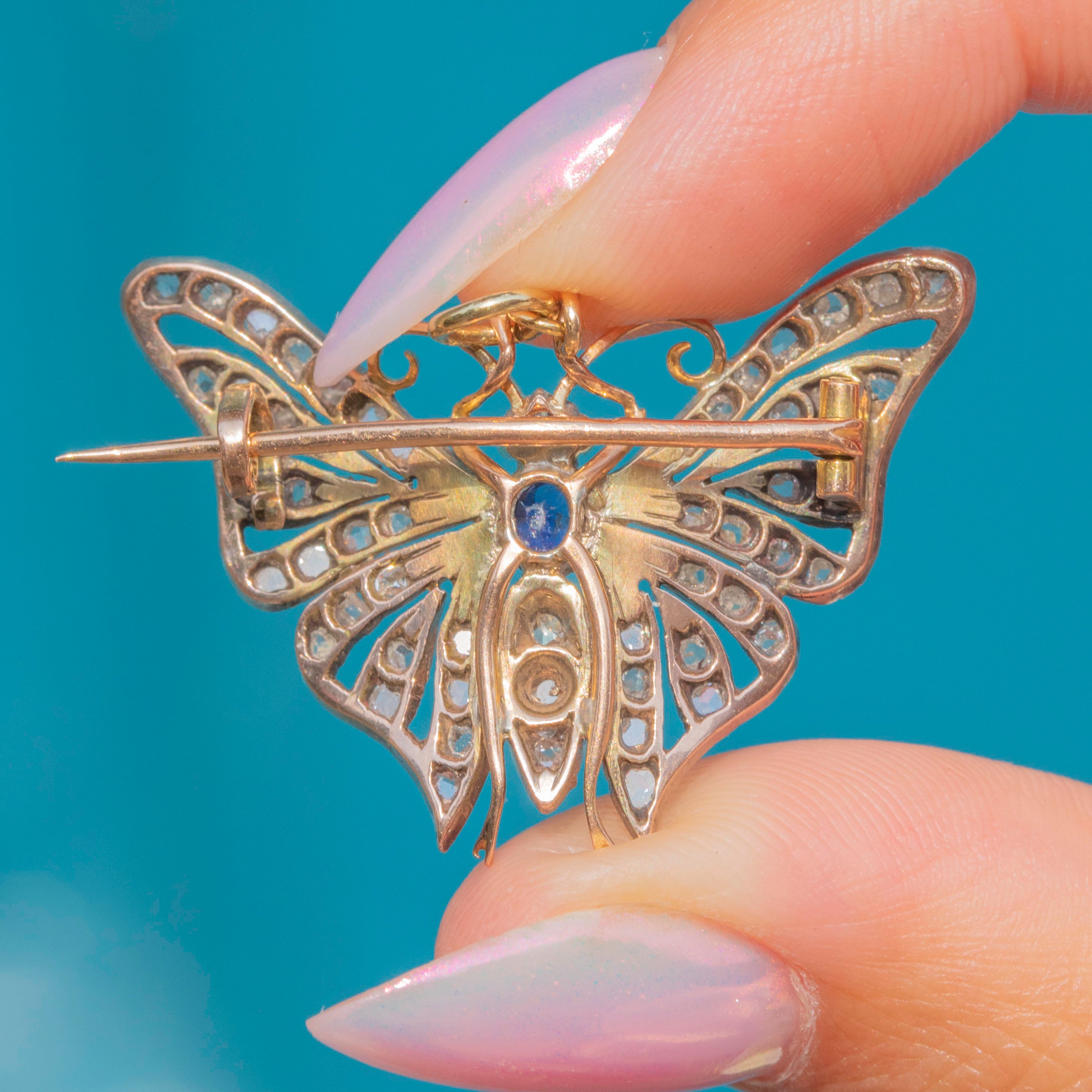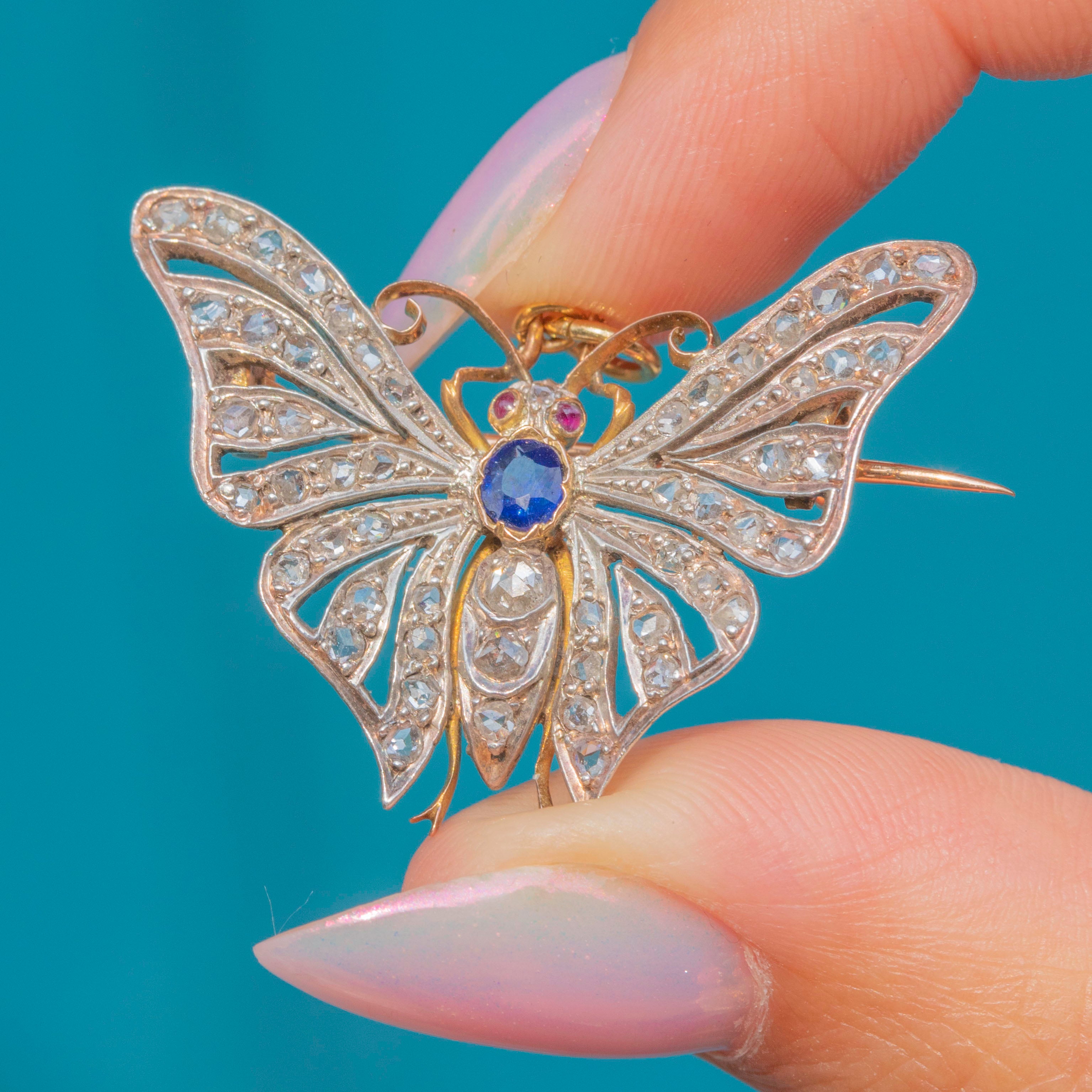 EXCELLENT: We are pleased to present this Victorian 18ct Gold Diamond Sapphire butterfly pendant in excellent condition. Each of her Diamonds are radiant and set securely within their settings. There are some small inclusions in the Sapphire - a little nod to Mother Nature -  and her Rubies are radiant. Her brooch fittings are in perfect working order and with a securely soldered jump ring, you can wear this antique butterfly with utmost confidence!