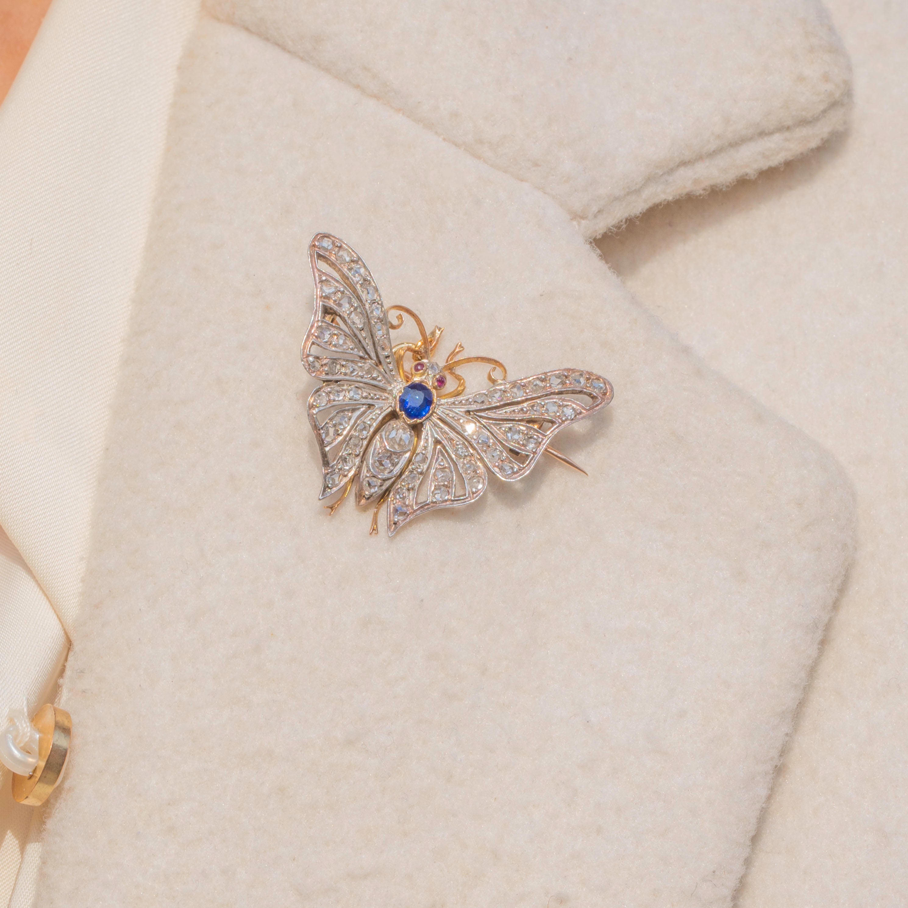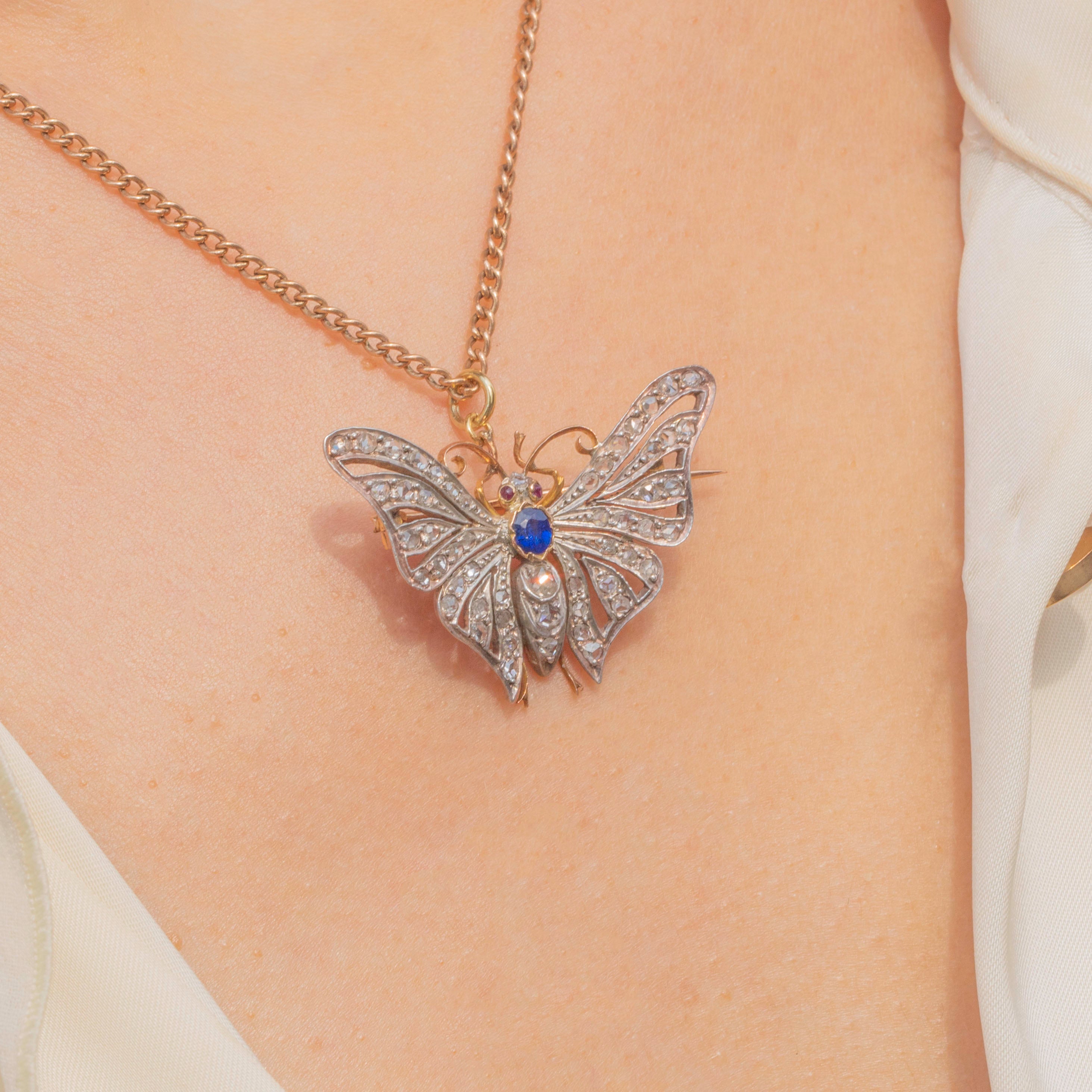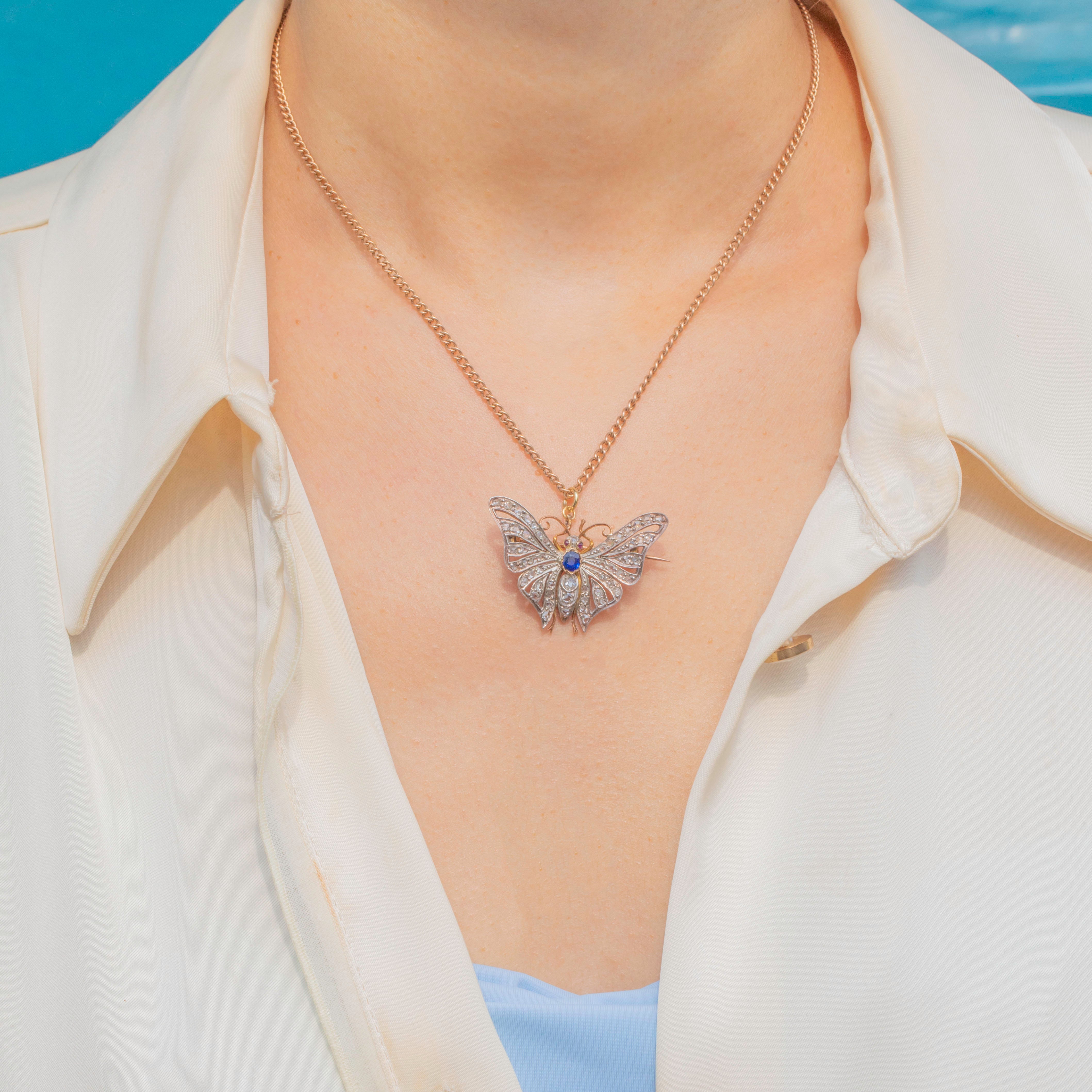 EXCELLENT: We are pleased to present this Victorian 18ct Gold Diamond Sapphire butterfly pendant in excellent condition. Each of her Diamonds are radiant and set securely within their settings. There are some small inclusions in the Sapphire - a little nod to Mother Nature -  and her Rubies are radiant. Her brooch fittings are in perfect working order and with a securely soldered jump ring, you can wear this antique butterfly with utmost confidence!