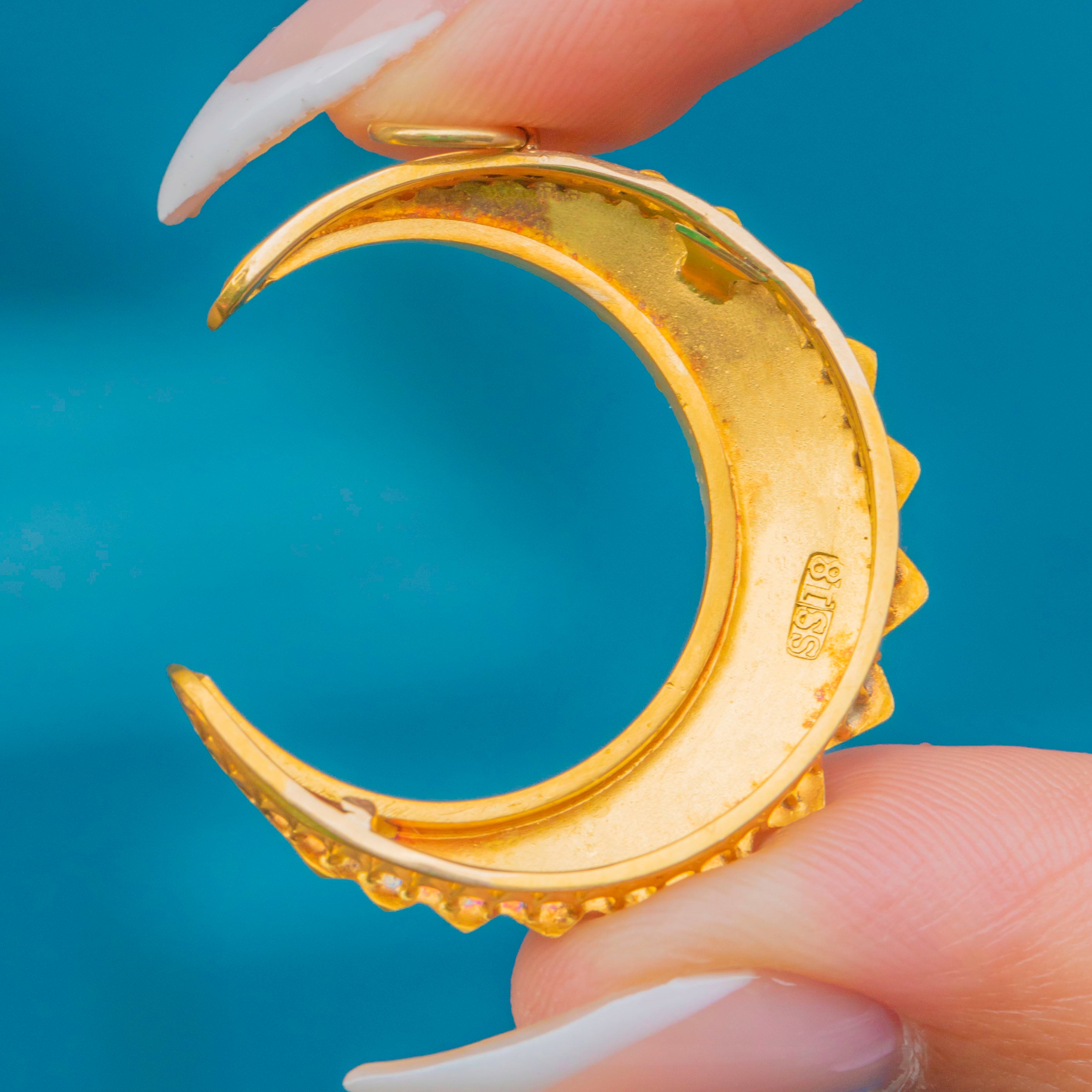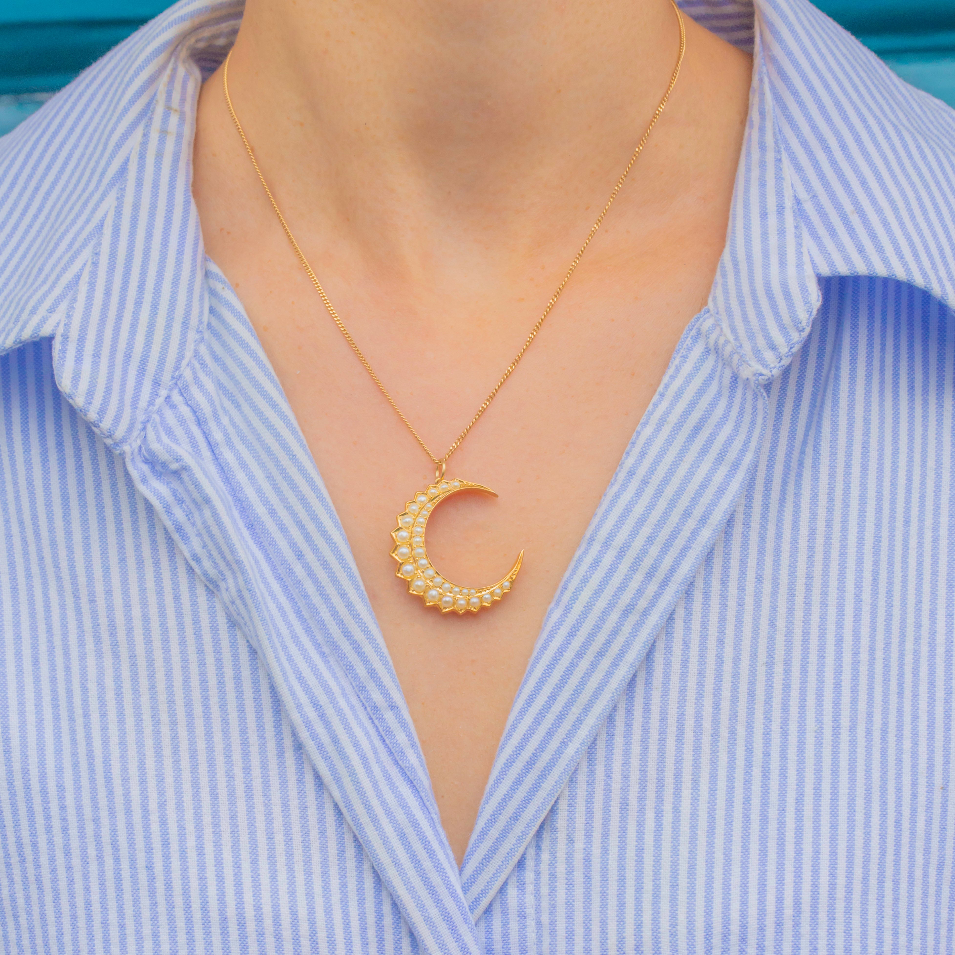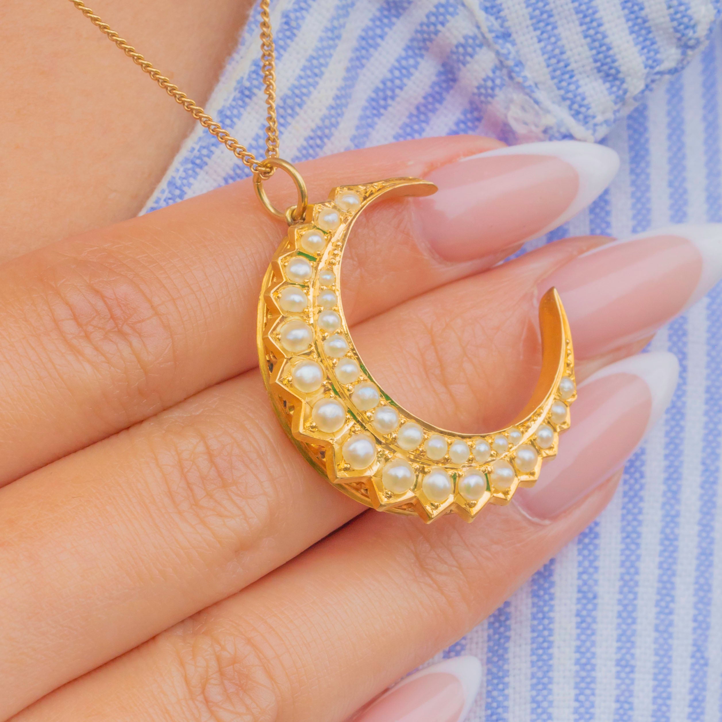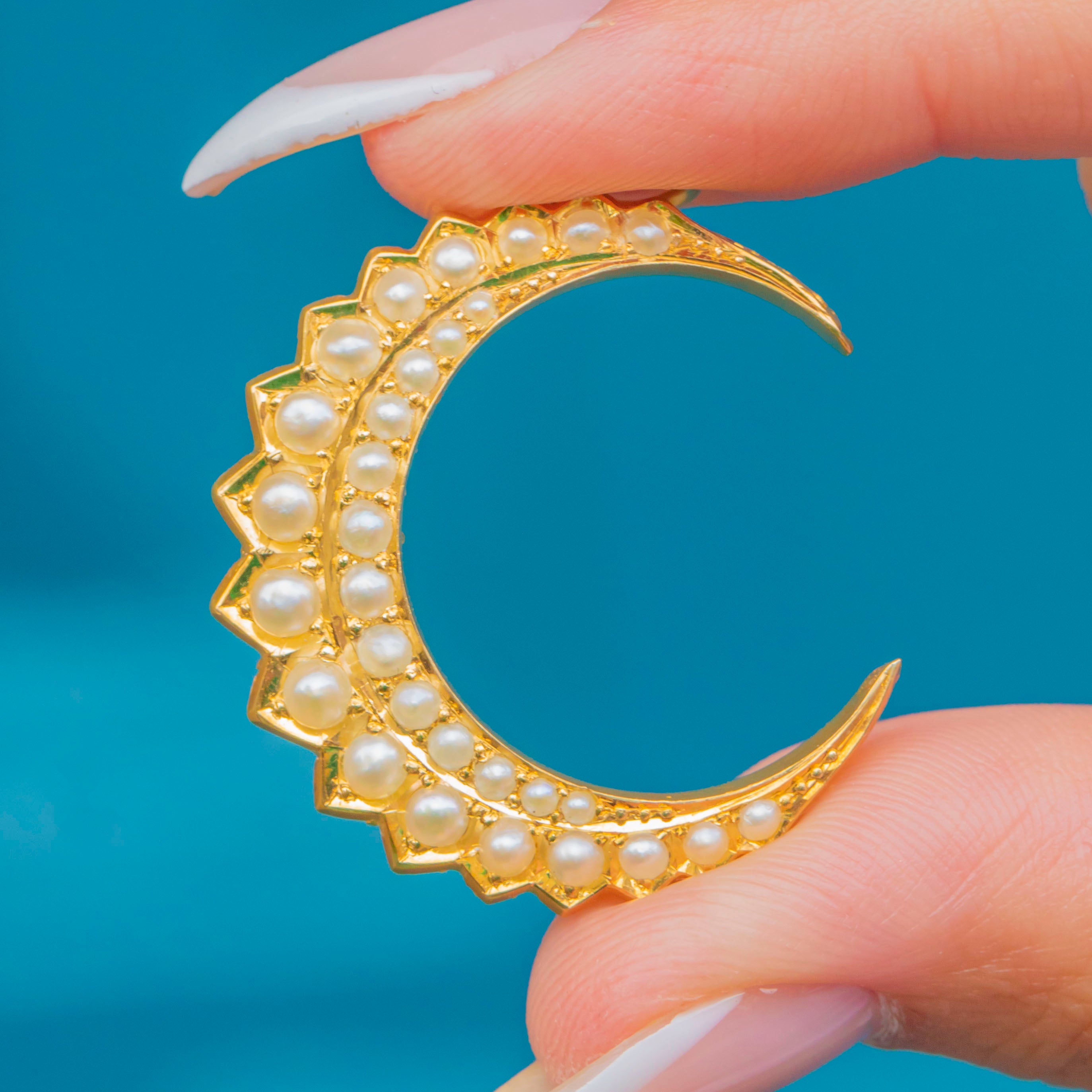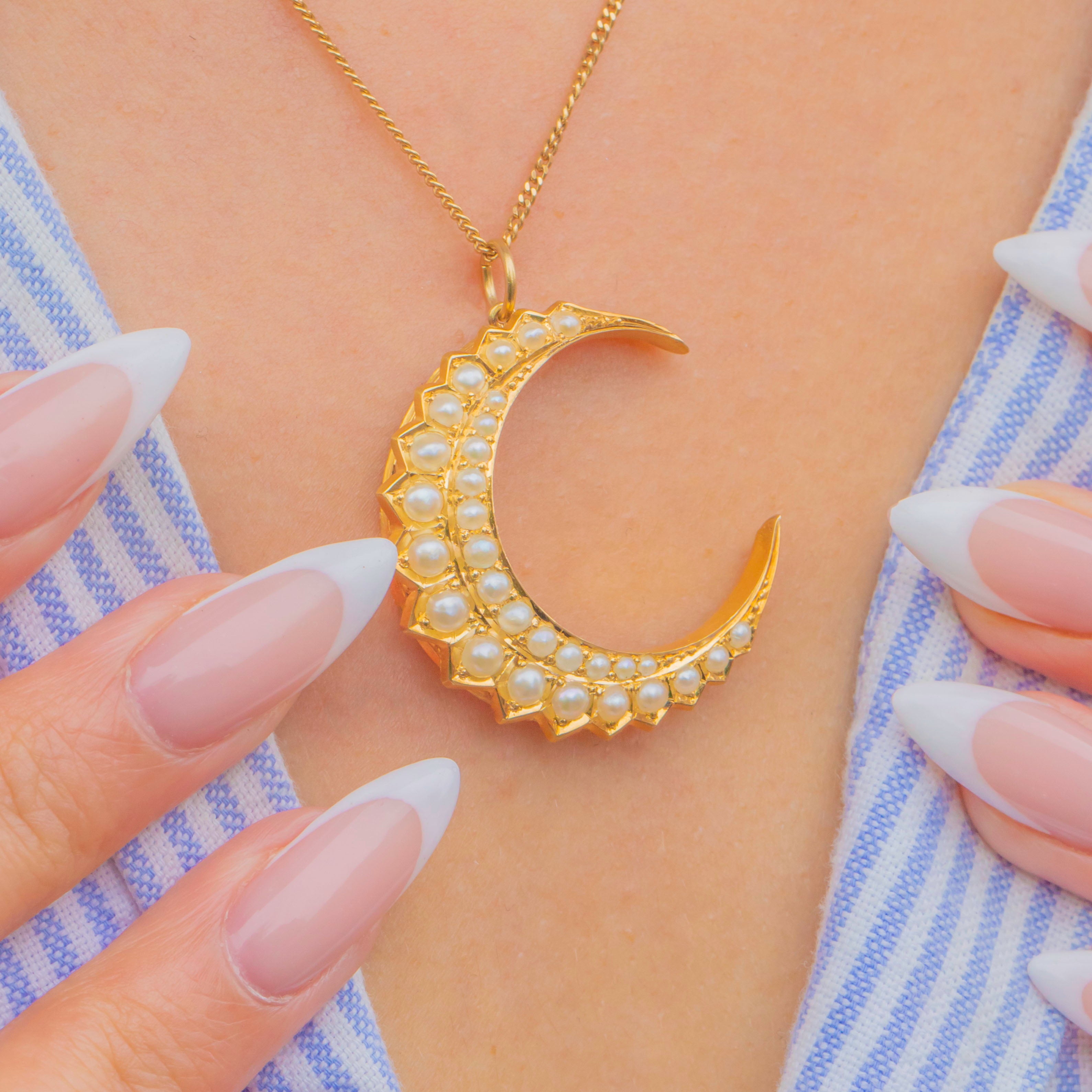A glorious late Victorian crescent moon pendant in rich 18ct Gold, set with two rows of beautifully graduated Pearls. The outer edge is crisply scalloped, giving the moon a bold, graphic outline, while the Pearls glow with creamy nacre against bright, buttery Gold. A classic celestial jewel with impressive presence and timeless romance.