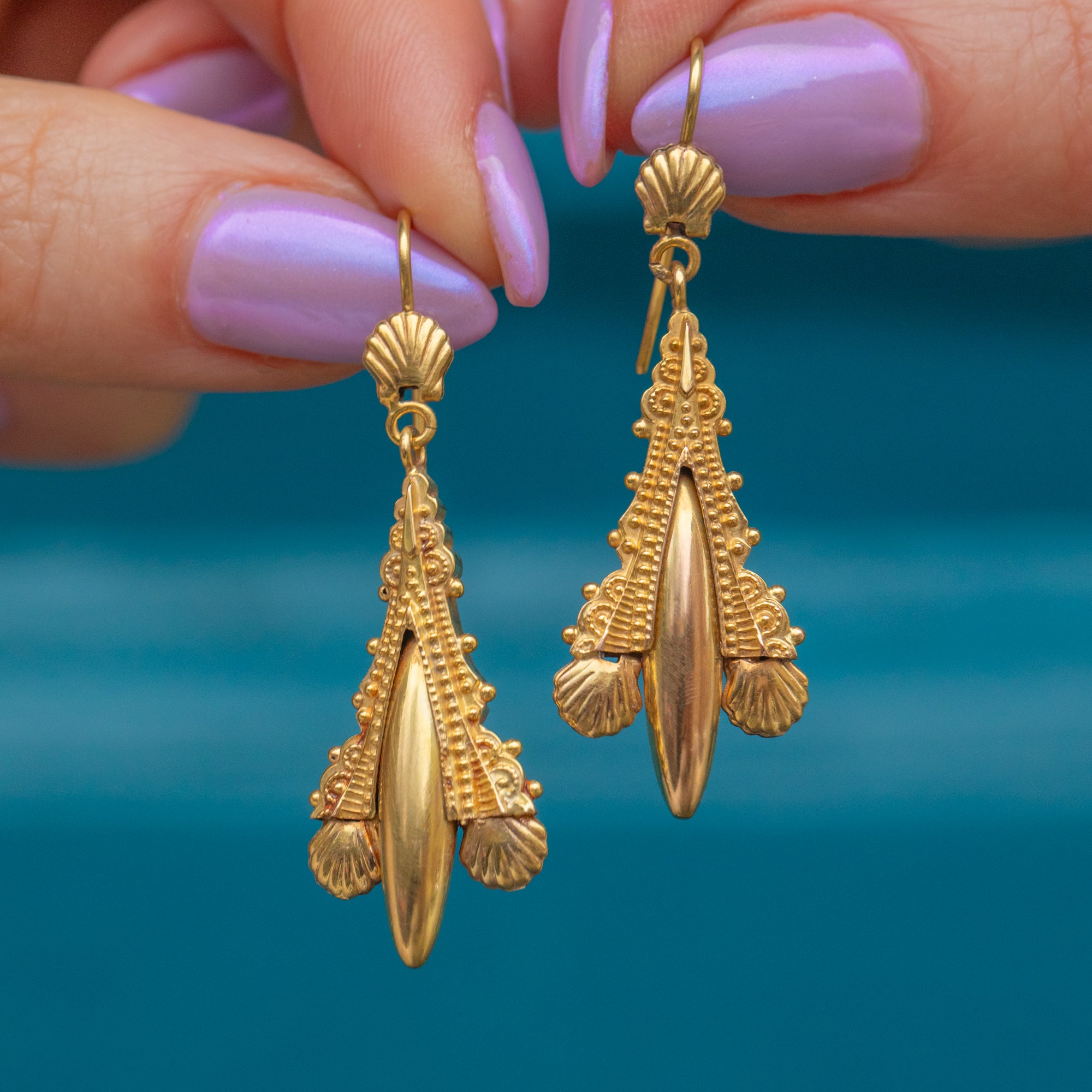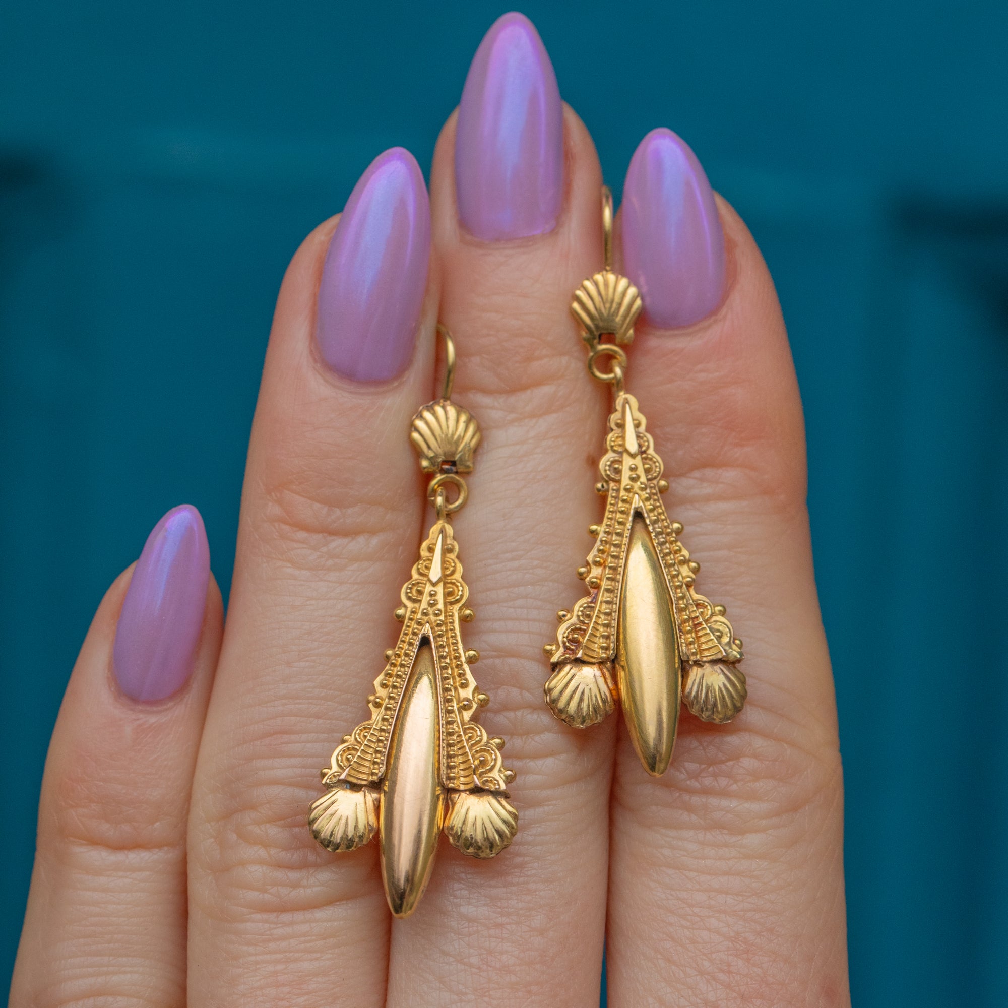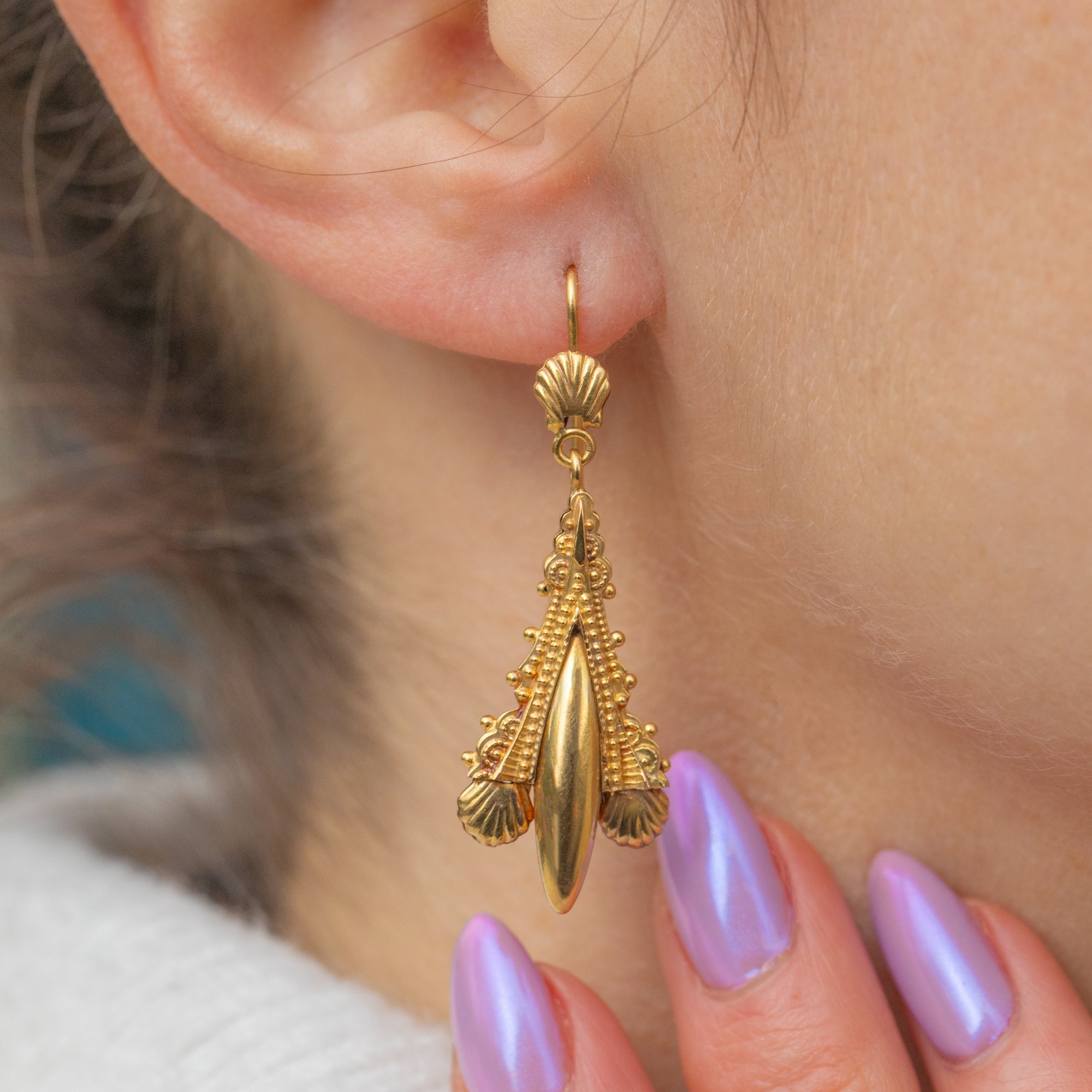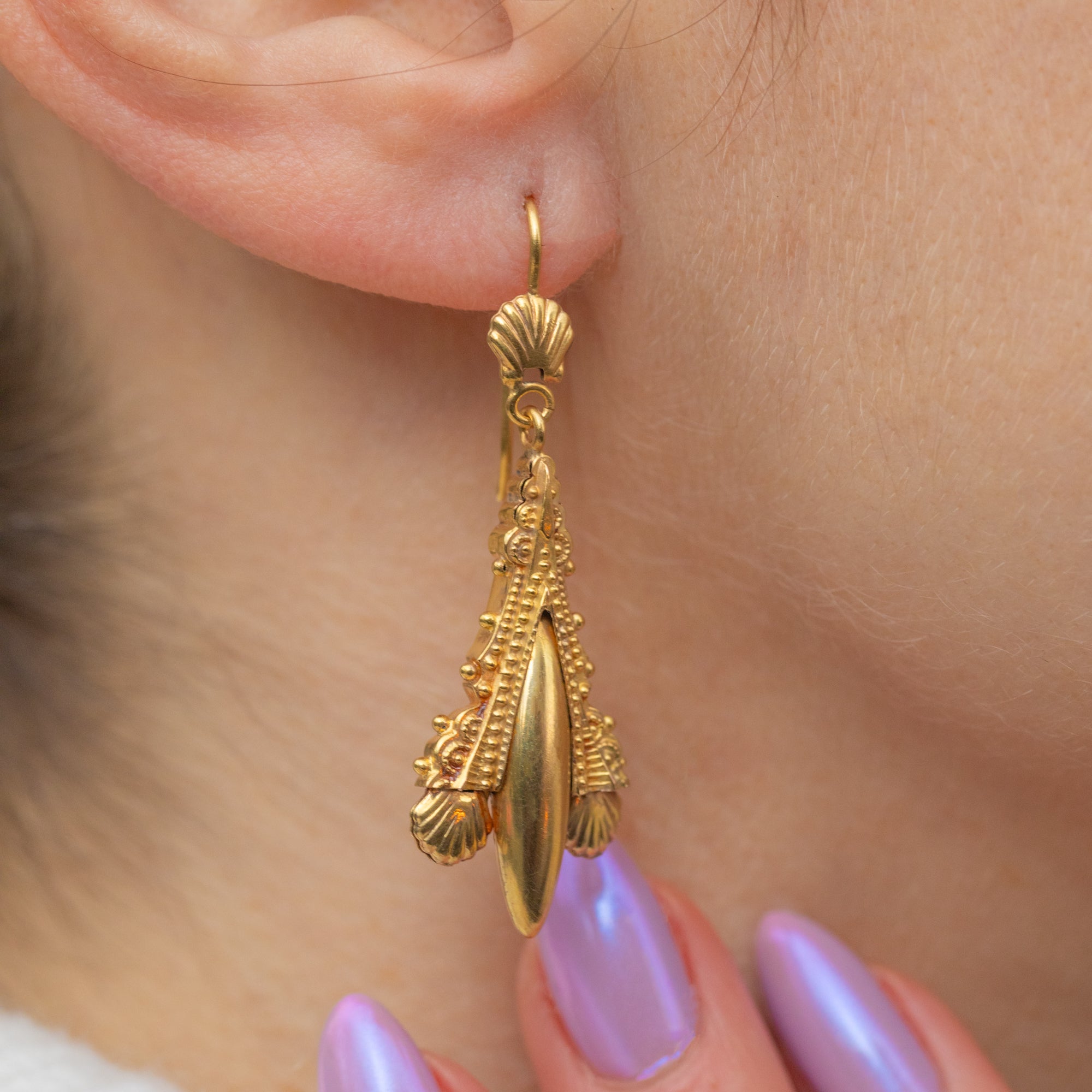 These Victorian 18ct Gold fancy clam-shell drop earrings perfectly capture the ornate designs of the archaeological revival era! The saturated 18ct Gold has a luxurious satin finish and has been formed into exquisitely detailed torpedo drops, displaying sumptuous curves, the characteristic beaded cannetille details and dainty shells.