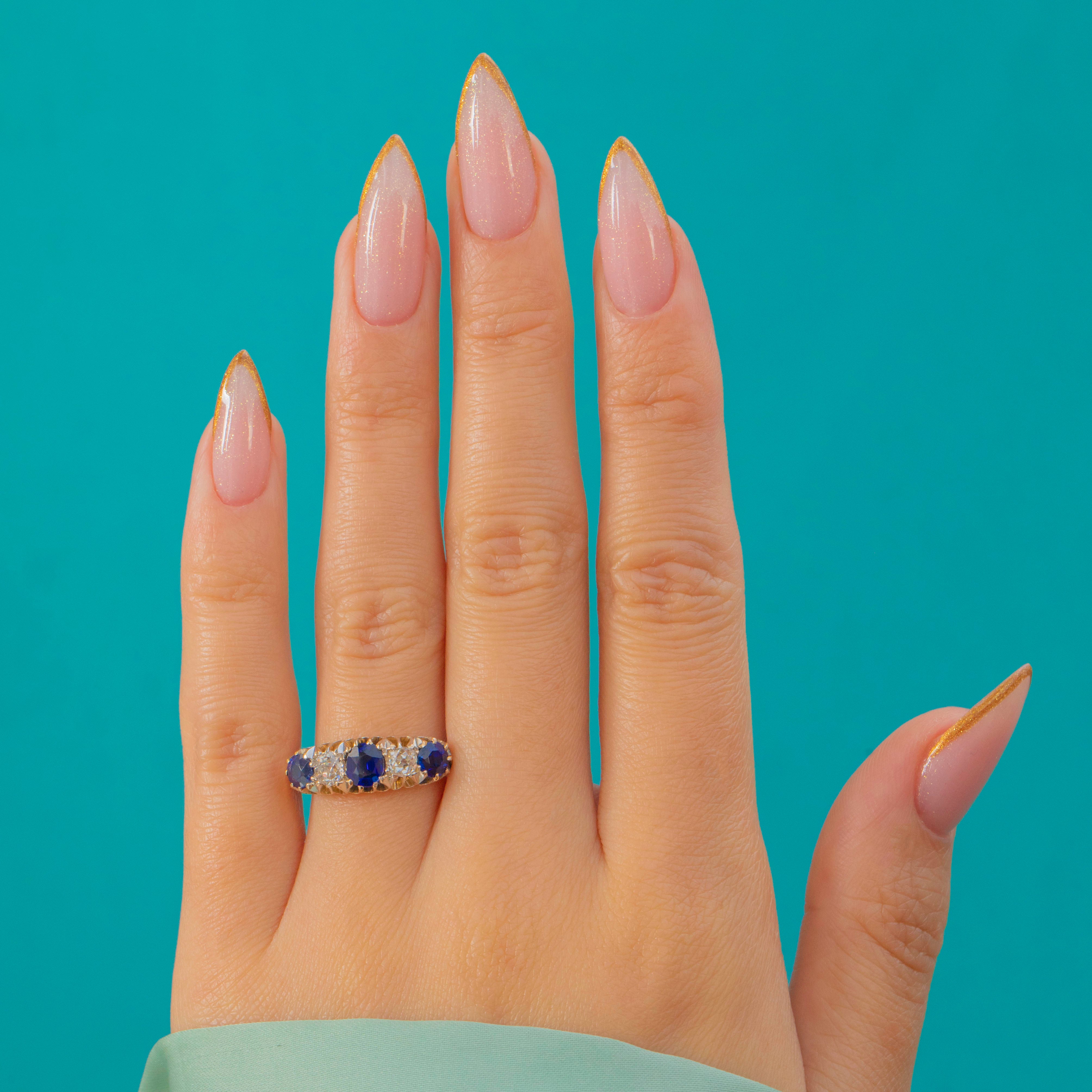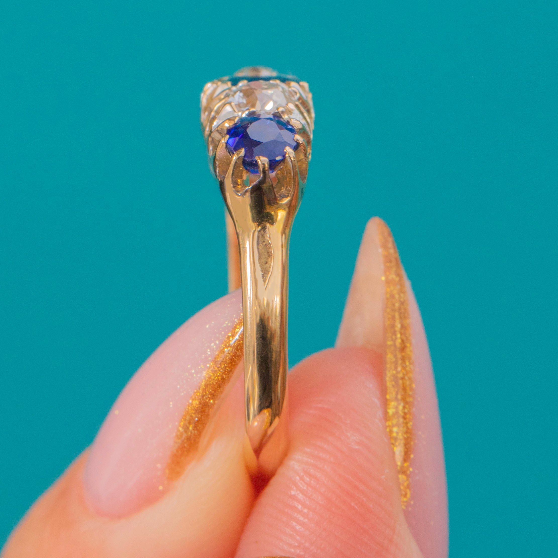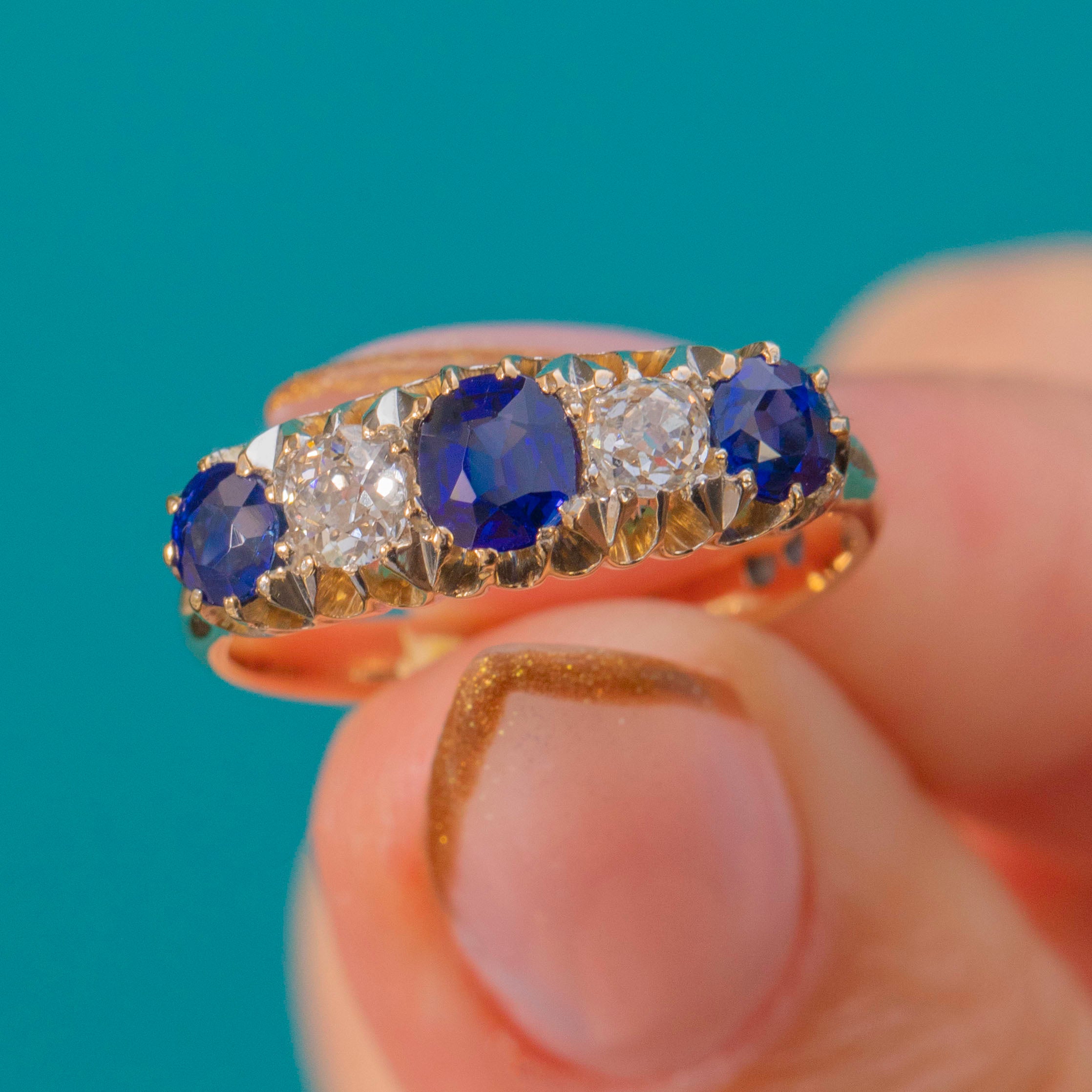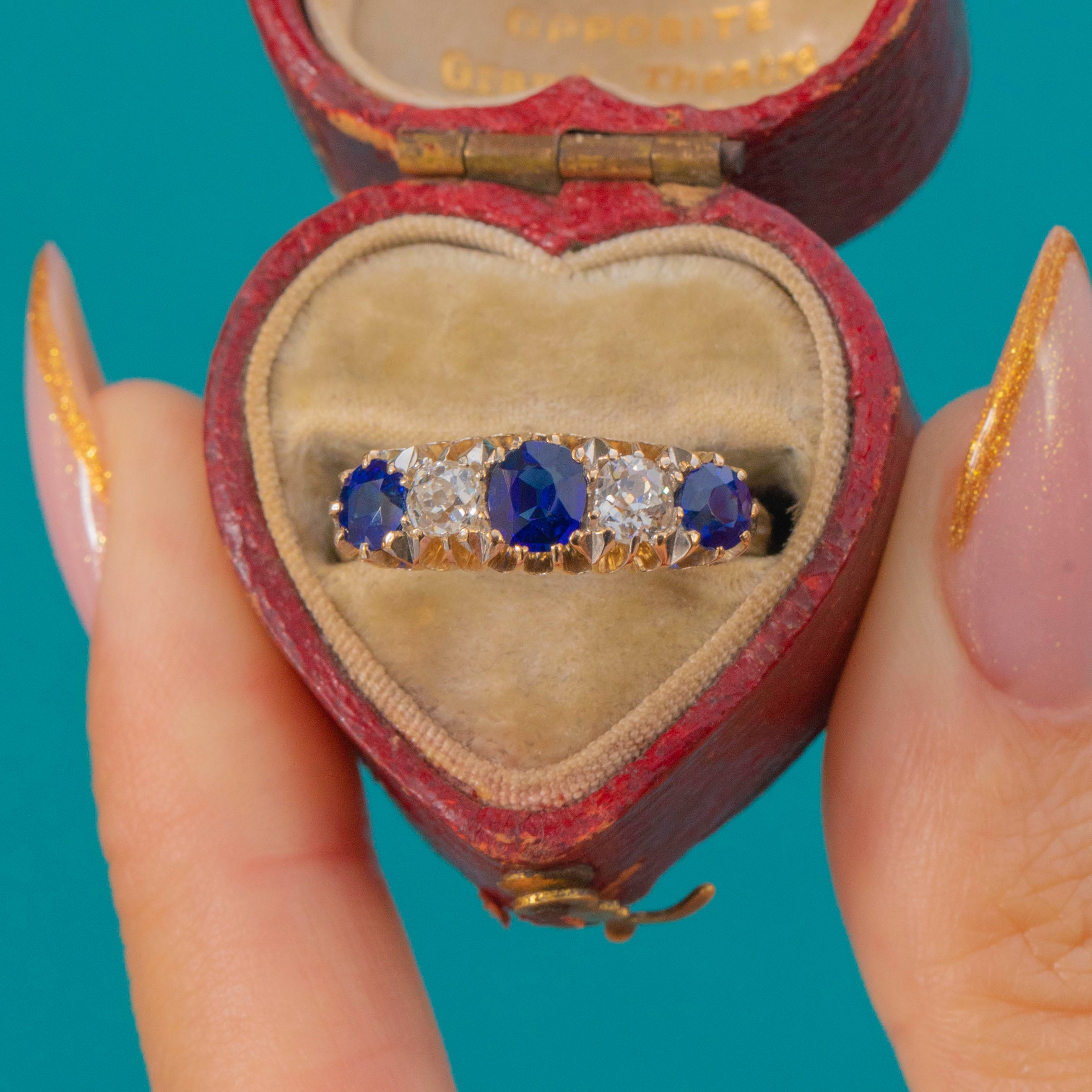 This exquisite late Victorian five-stone ring showcases a stunning trio of deep royal blue natural Sapphires interspersed with bright, sparkling Old Mine Cut Diamonds. The gemstones are beautifully claw-set in a traditional boat-shaped gallery, crafted in rich 18ct Yellow Gold that has mellowed to a soft antique glow.