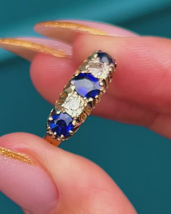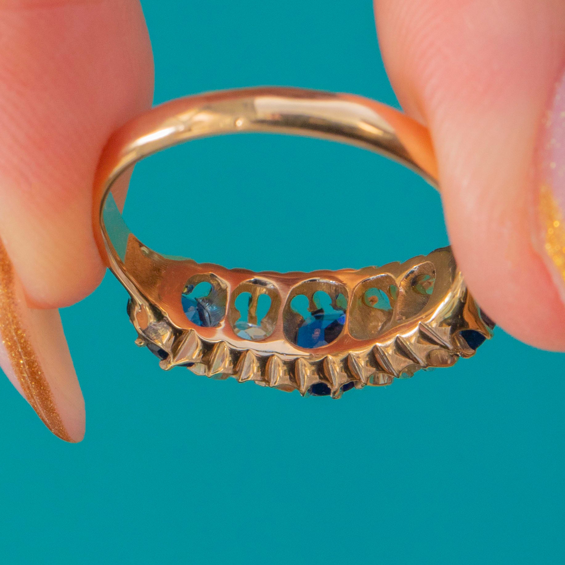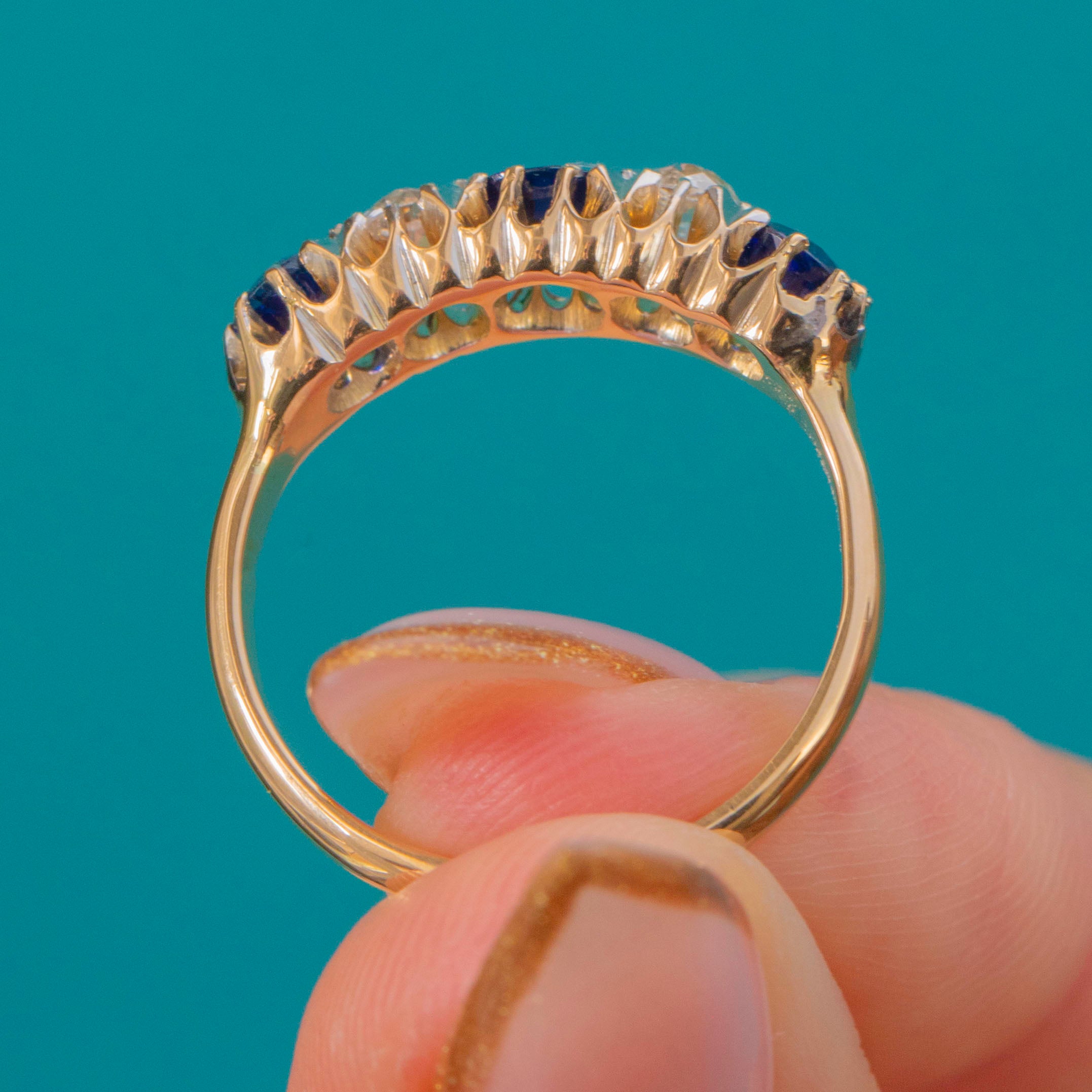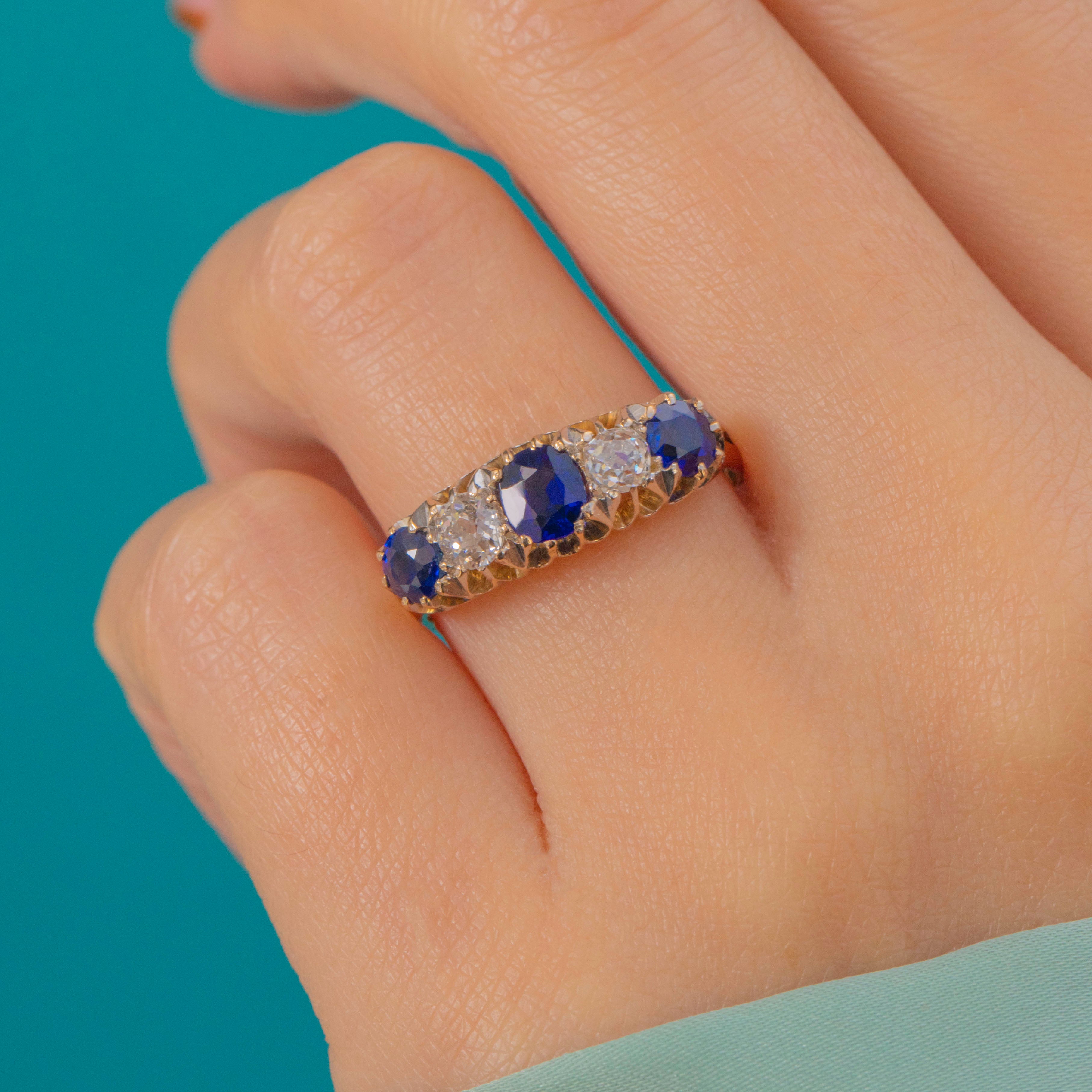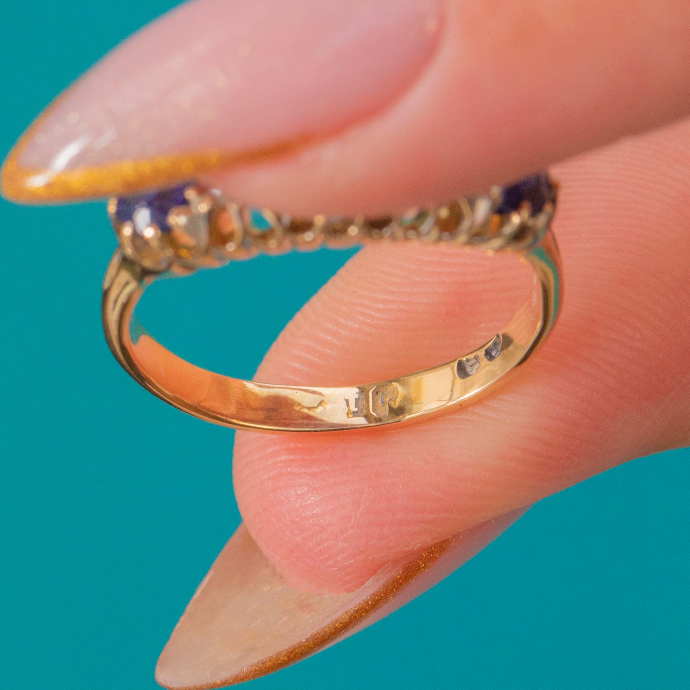 This exquisite late Victorian five-stone ring showcases a stunning trio of deep royal blue natural Sapphires interspersed with bright, sparkling Old Mine Cut Diamonds. The gemstones are beautifully claw-set in a traditional boat-shaped gallery, crafted in rich 18ct Yellow Gold that has mellowed to a soft antique glow.