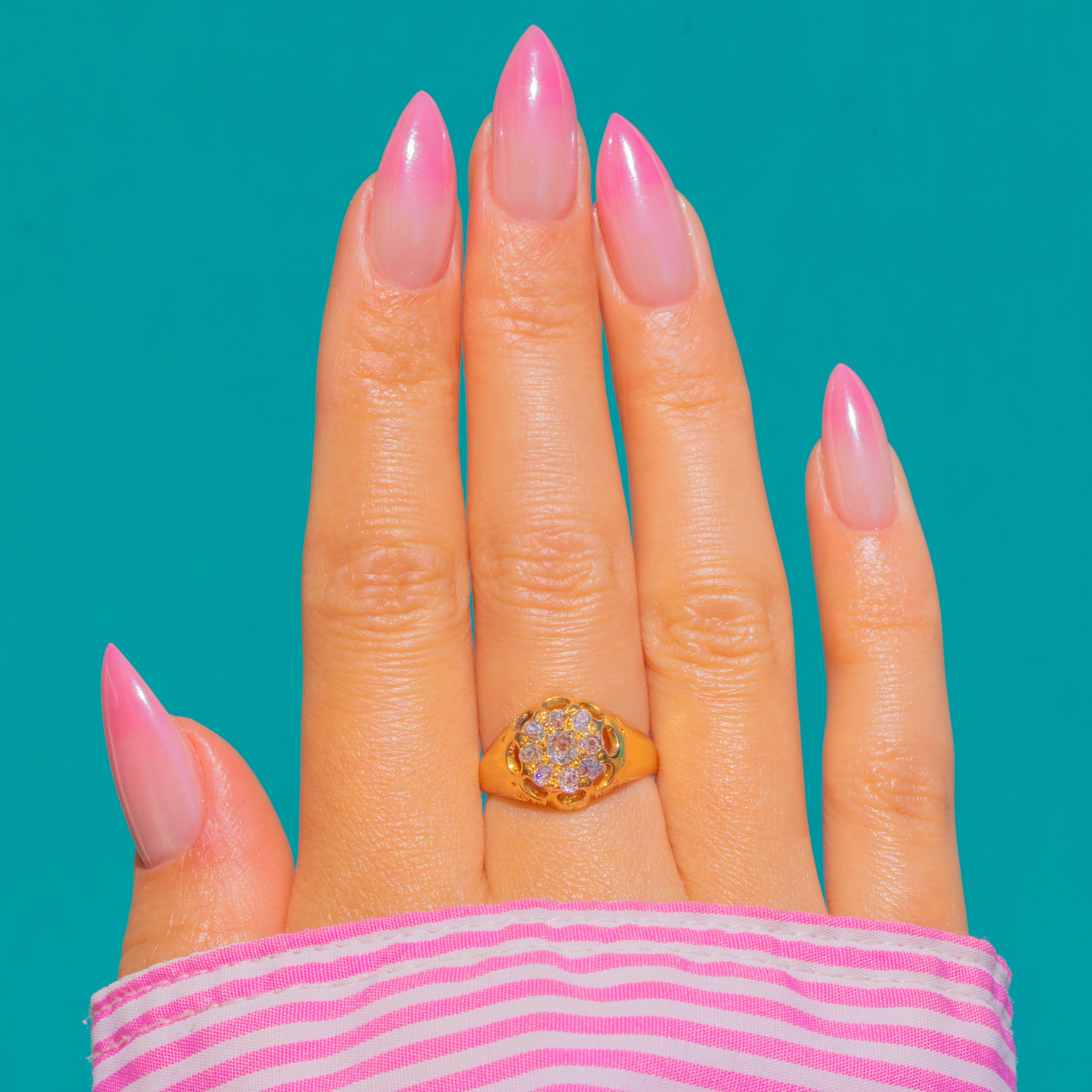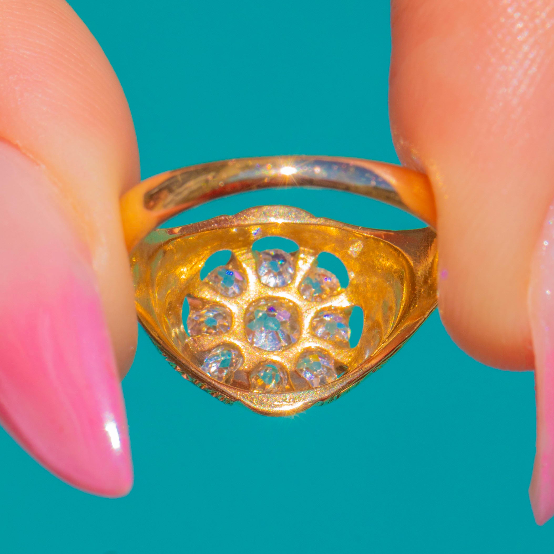 At its heart sits an Old Mine Cut Diamond, encircled by a halo of petite, well-matched Old Mine Cuts for a lively, romantic sparkle. The overall effect is opulent yet refined—classic Victorian craftsmanship with a sumptuous presence and a wonderfully sculptural silhouette in 18ct Gold.