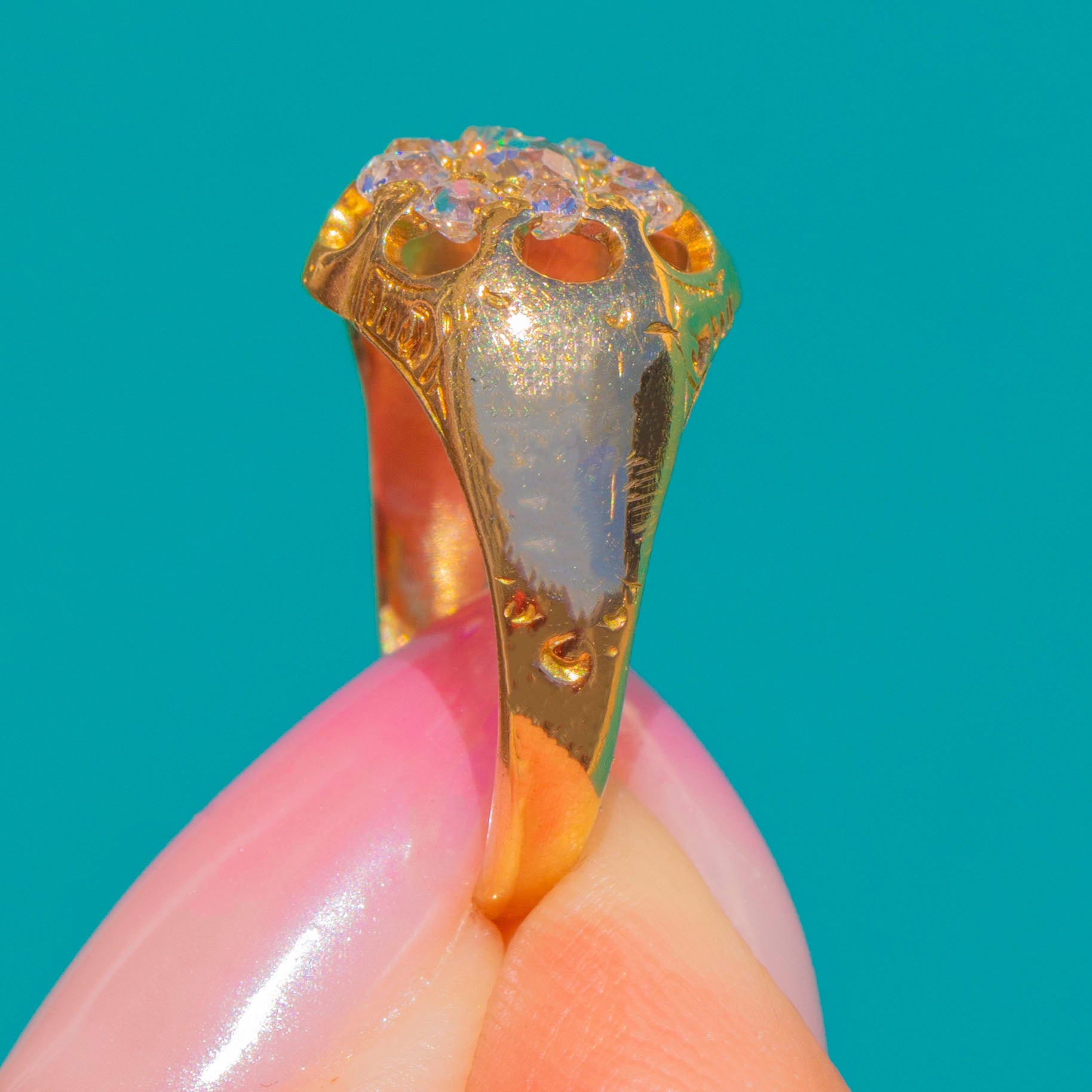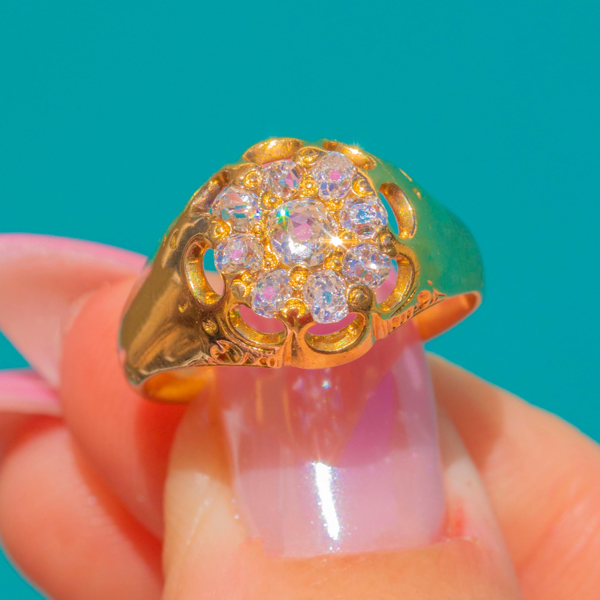 Glittering with antique charm, this Victorian 18ct Gold Old Mine Cut Diamond cluster ring forms a lush, domed rosette on the finger. The floral cluster is elevated by a scalloped, openwork gallery and elegant foliate scrolls along the shoulders, all finished in a rich, high-polish Gold that catches the light beautifully.