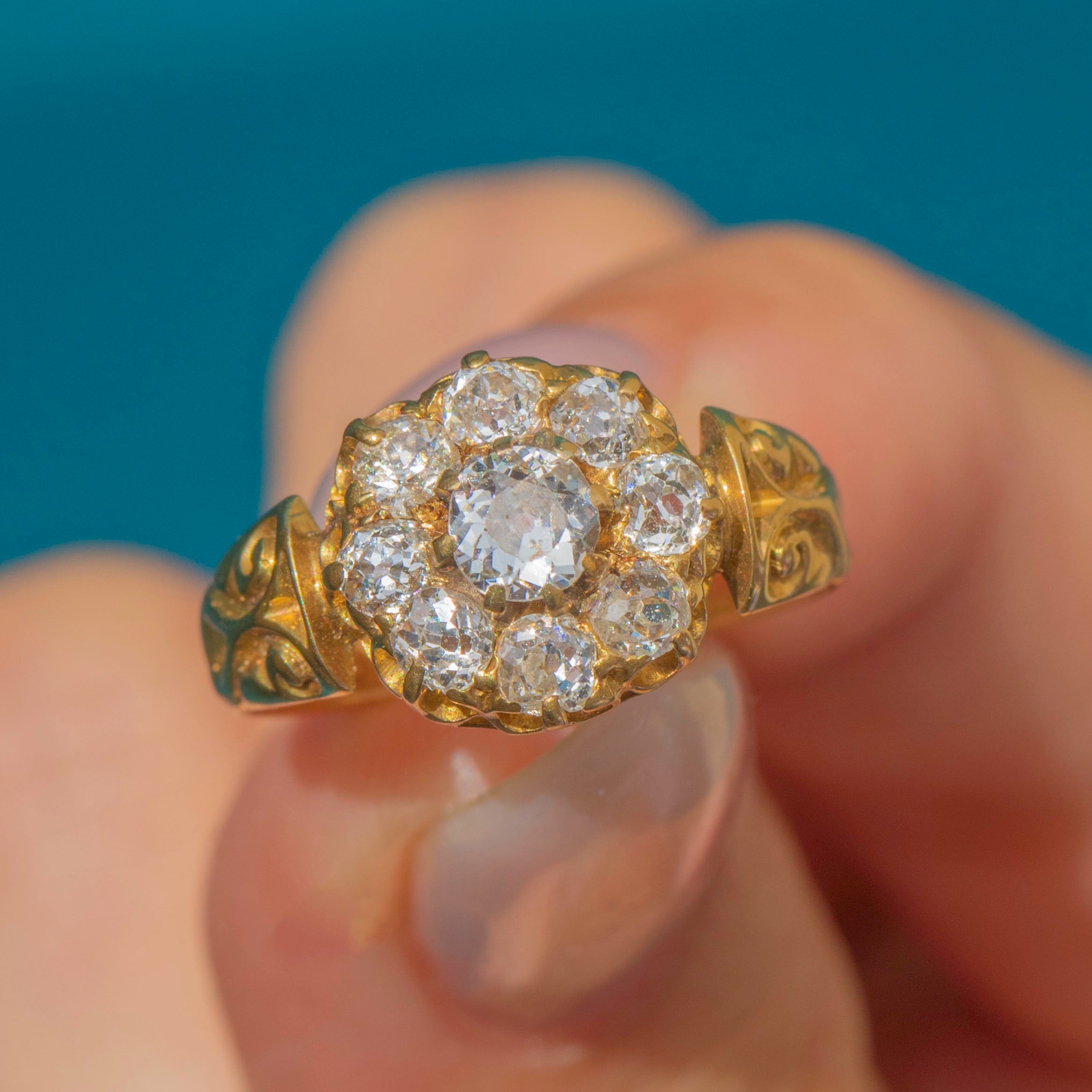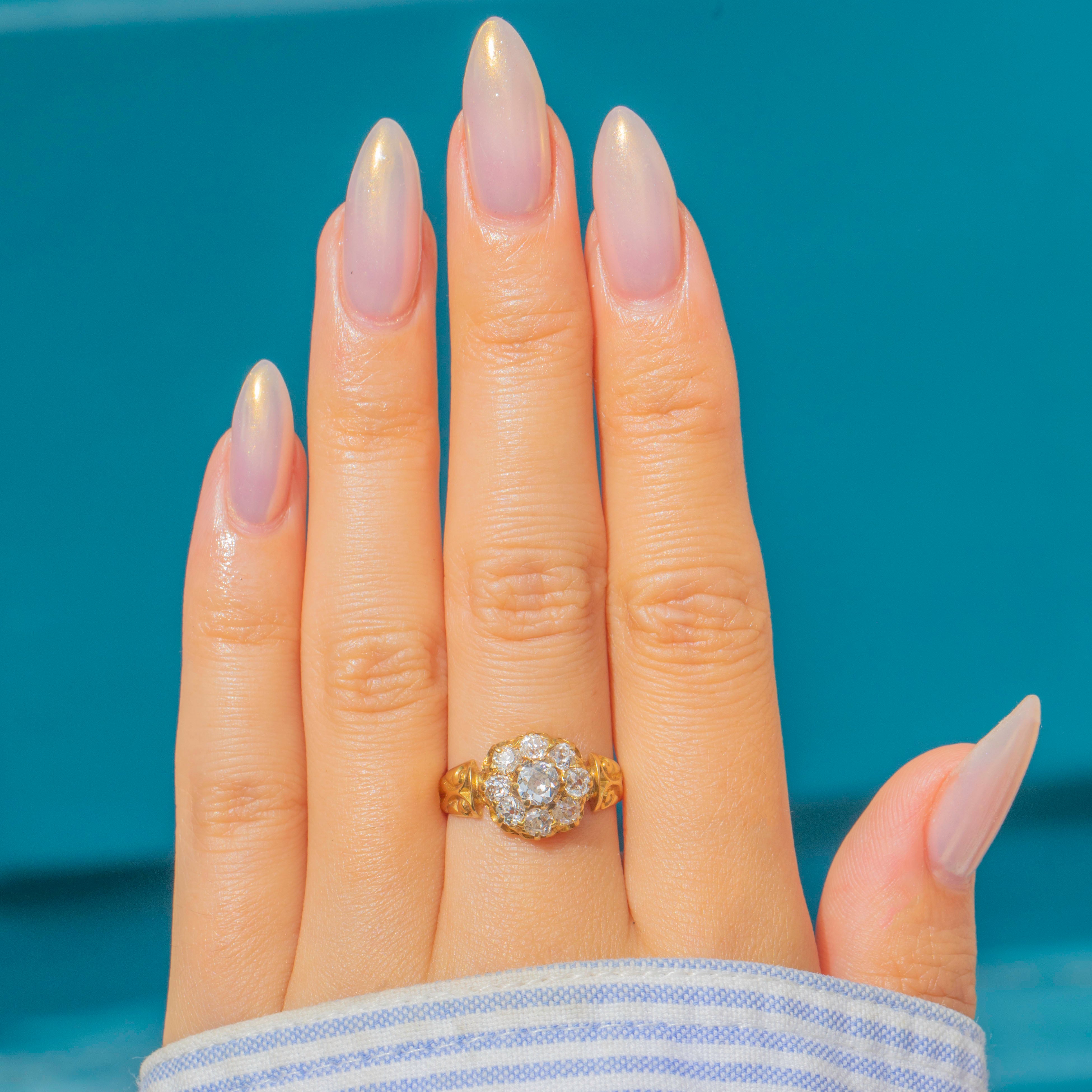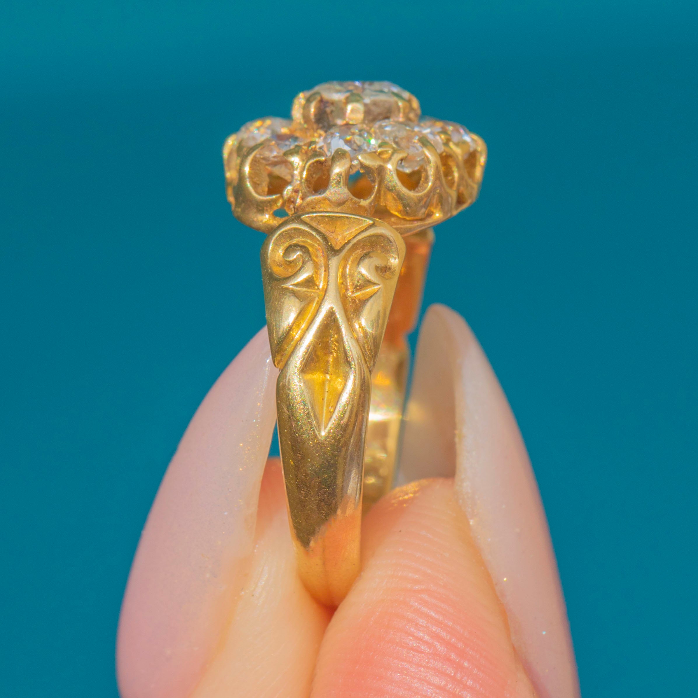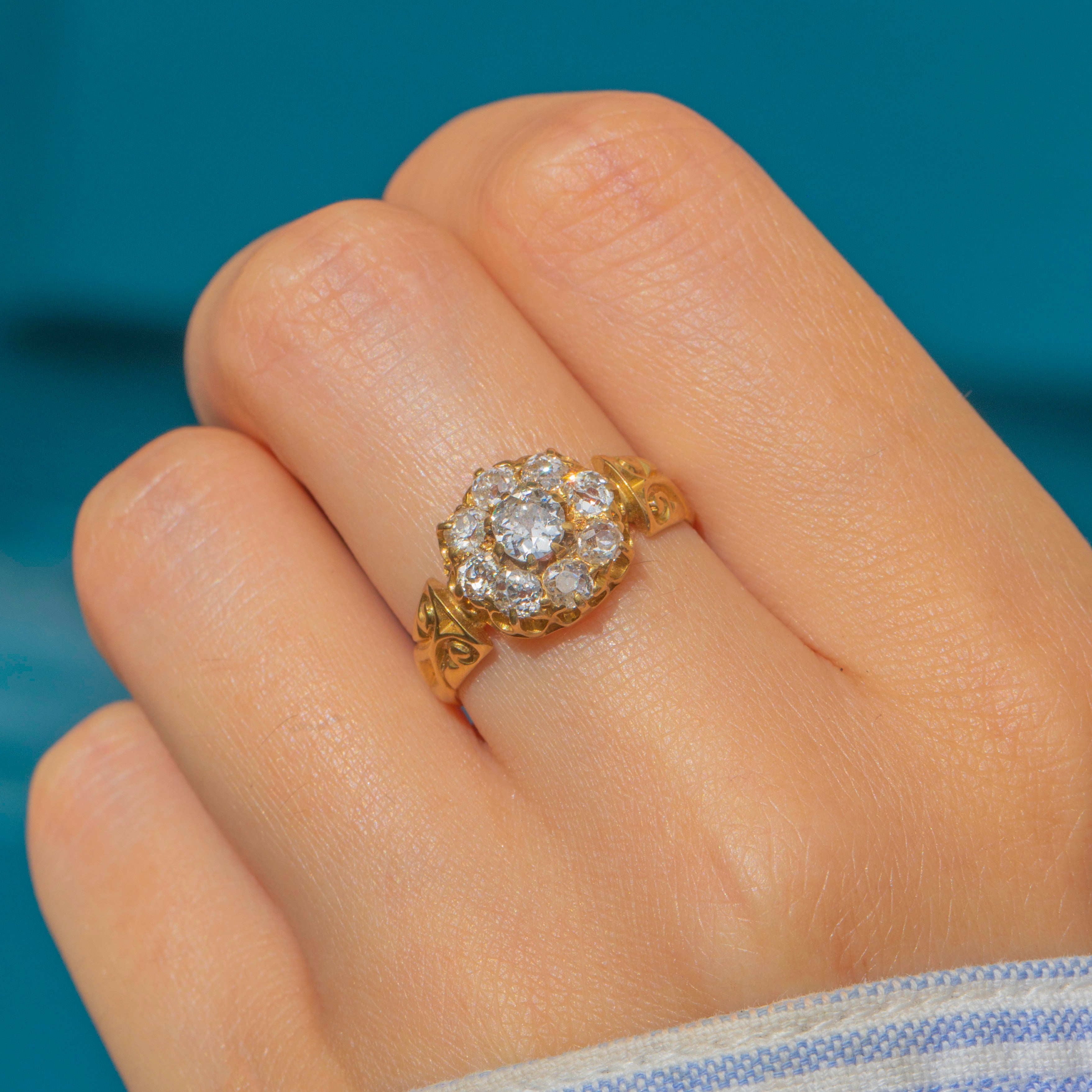 The cluster has excellent presence on the finger at 10mm across, balanced by stylish scrolled shoulders that taper into a solid Gold shank. The detail of the engraving and the raised openwork gallery give the piece a refined antique character typical of the mid-Victorian era.