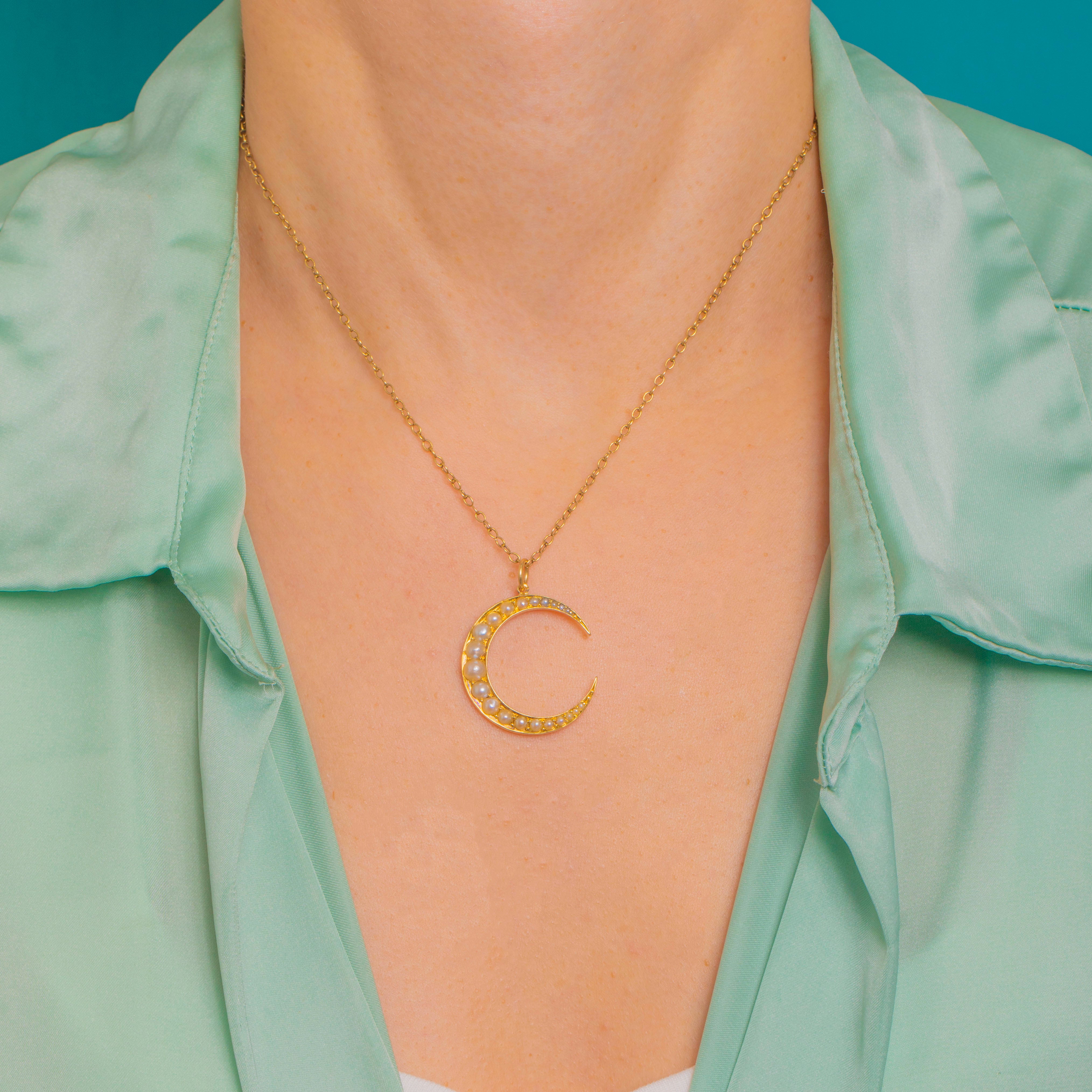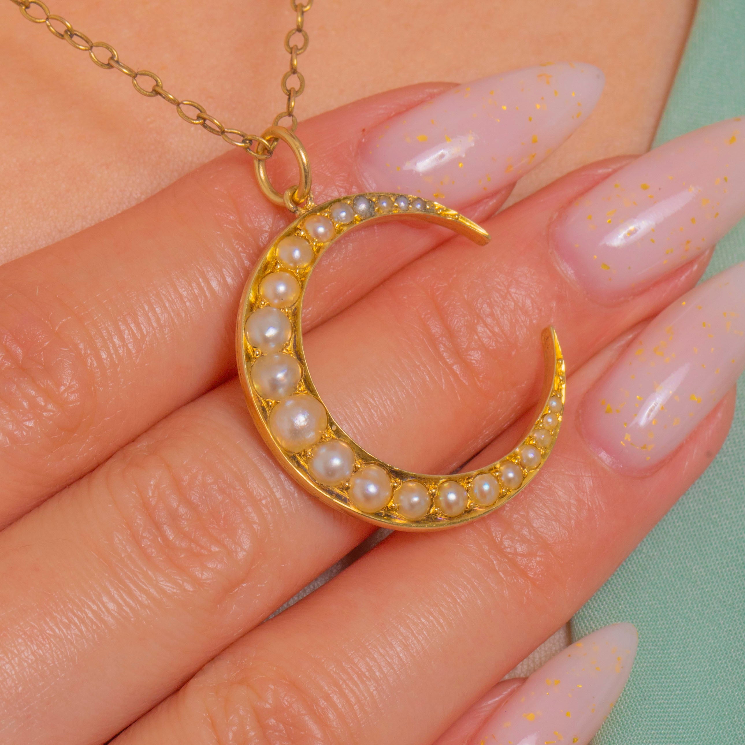 A luminous Victorian crescent moon pendant crafted in rich 18ct Gold, set with a beautifully graduated row of creamy Pearls from 1mm to 3.5mm that taper gracefully to the tips. Romantic and celestial, this classic motif captures the era’s fascination with the night sky, lending an effortlessly elegant glow to any neckline.