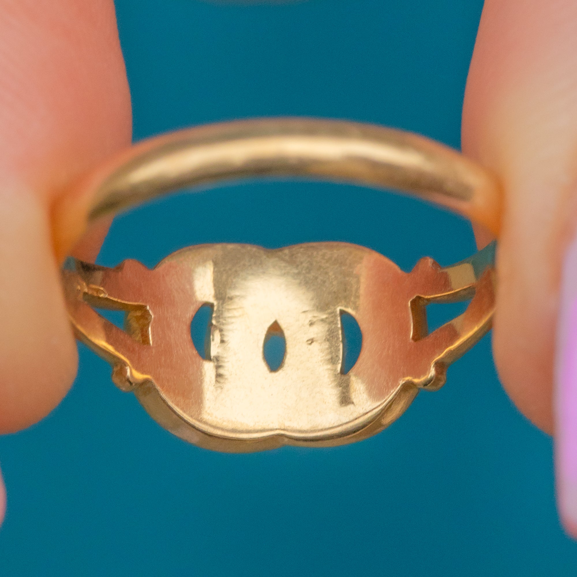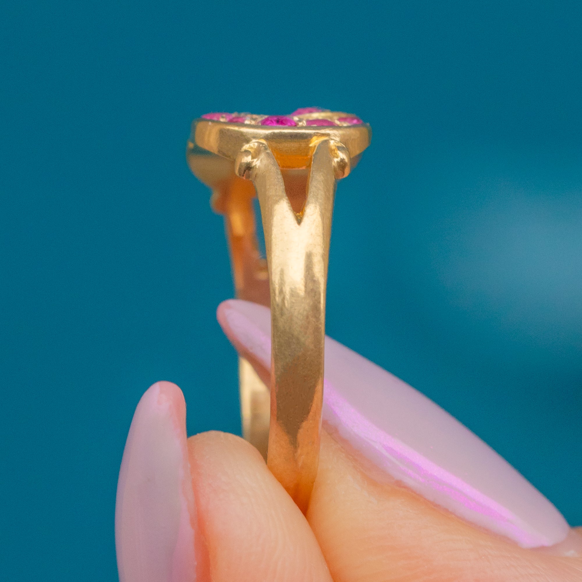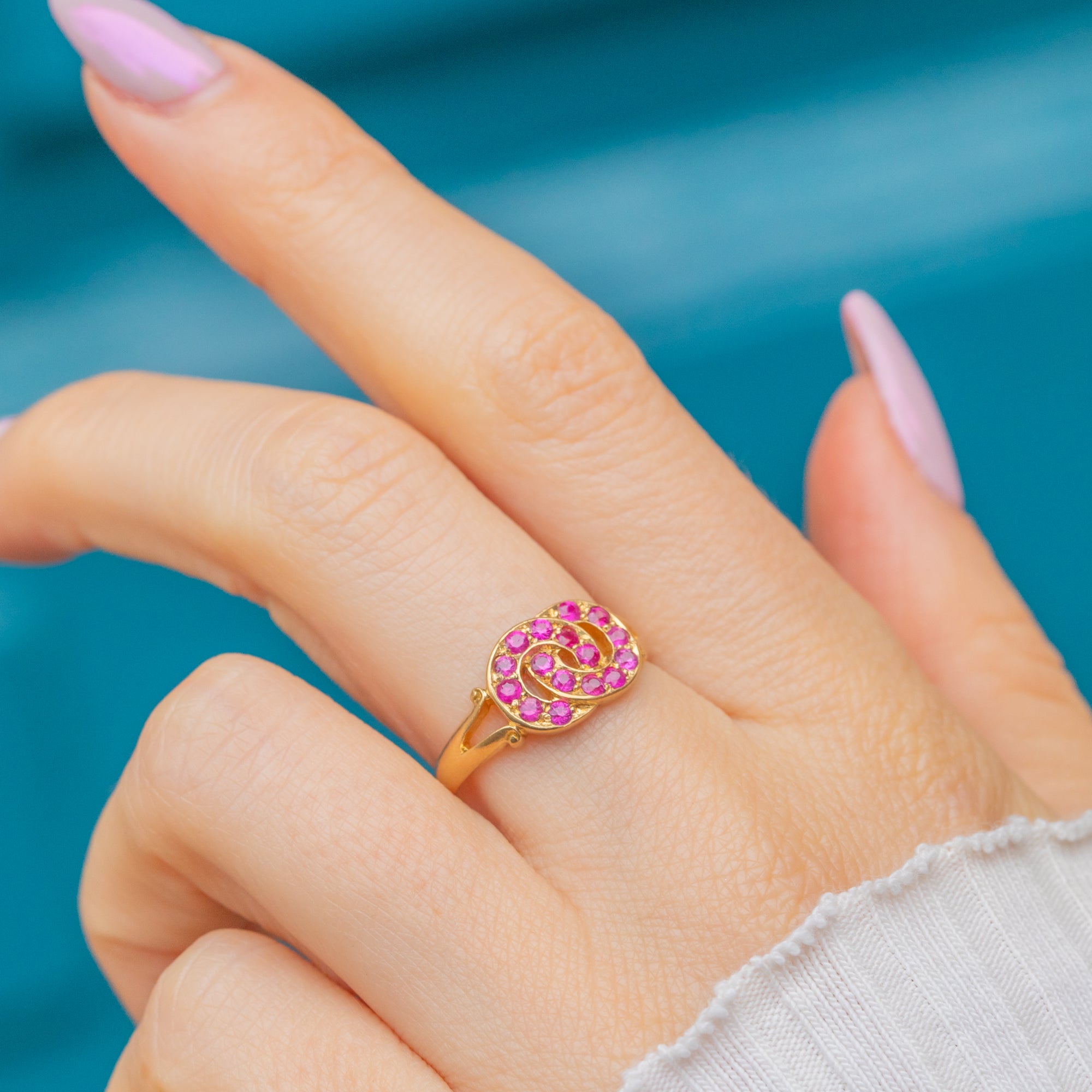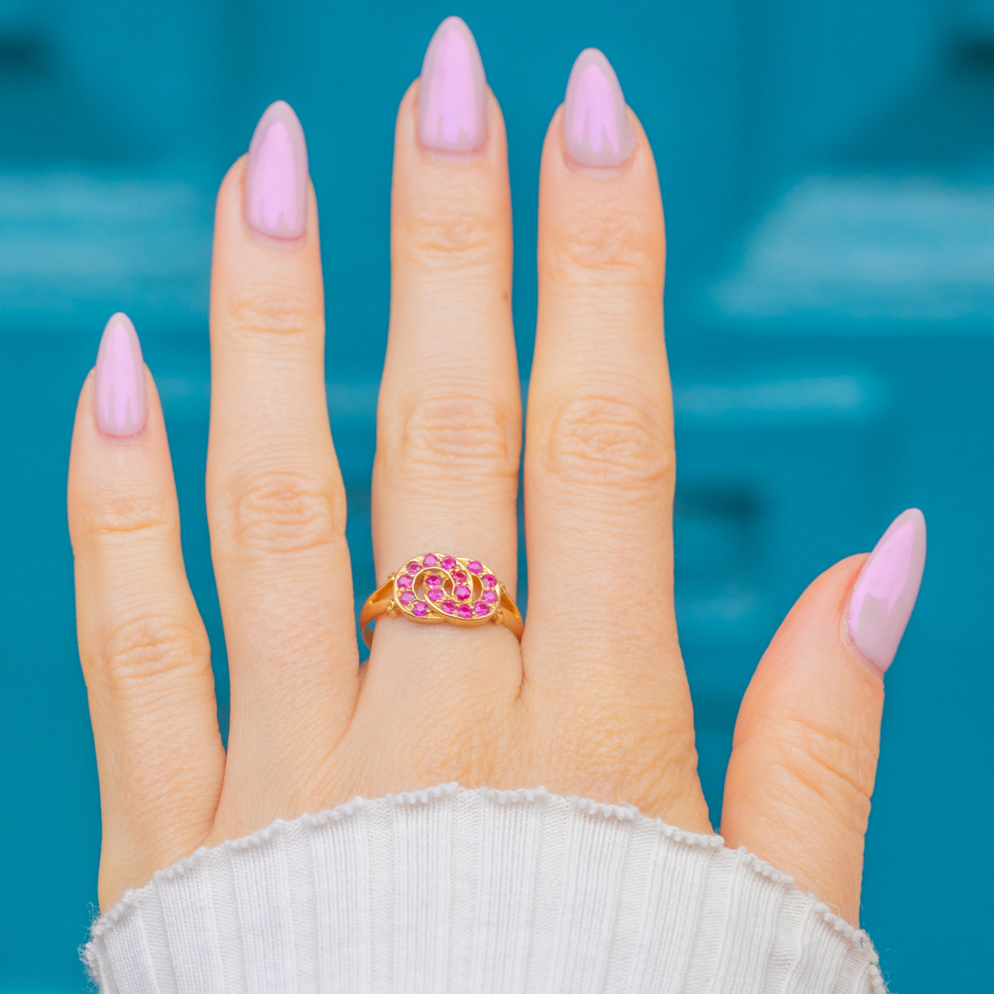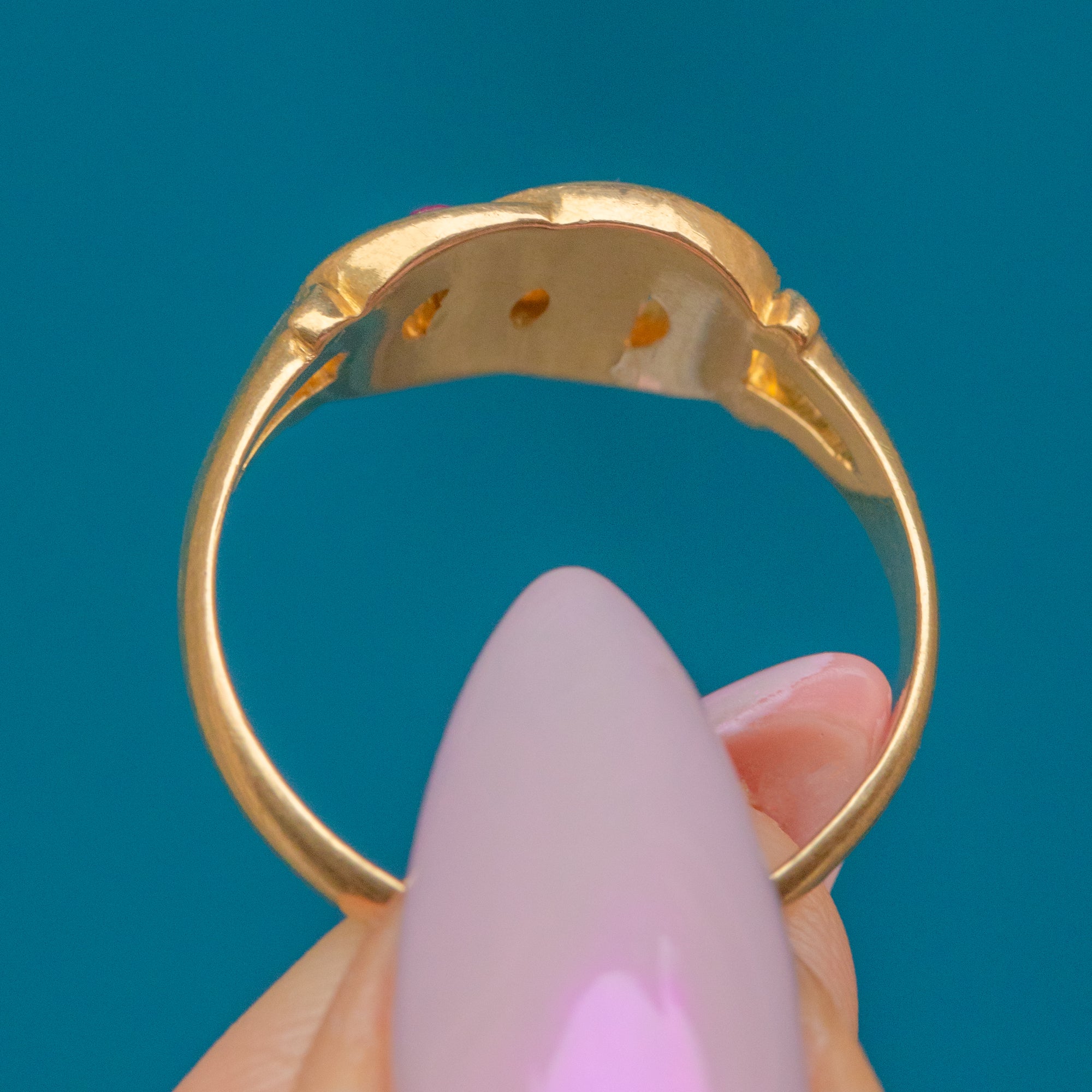 This distinctive Victorian ring is crafted in luxurious 18ct Gold and features a beautifully interlinked circular motif set with vivid natural Rubies. The rich hot pink to red gemstones add a vibrant pop of colour, perfectly complemented by the buttery yellow tone of the 18ct Gold.