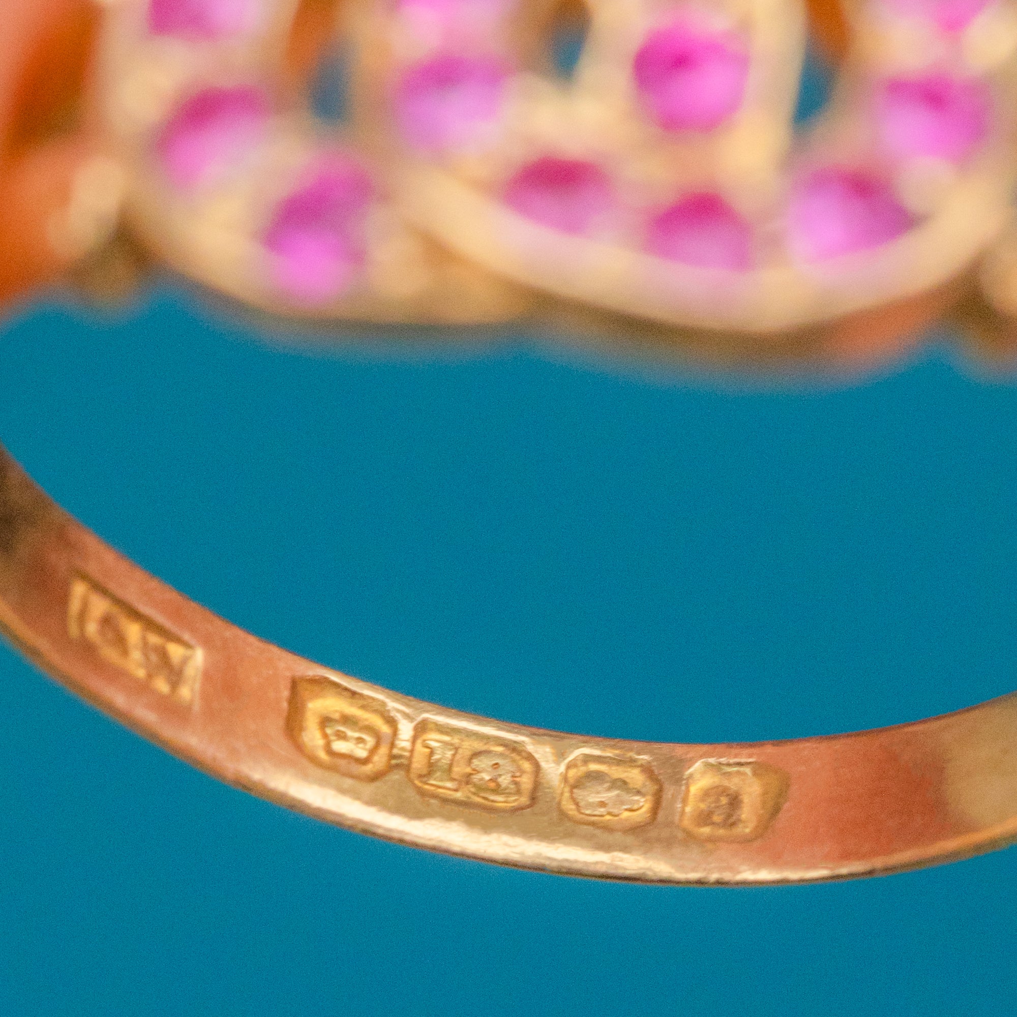 EXCELLENT: Beautifully preserved with bright, securely set Rubies and a crisp, full set of English hallmarks. The Gold retains its rich antique sheen with only minimal wear.