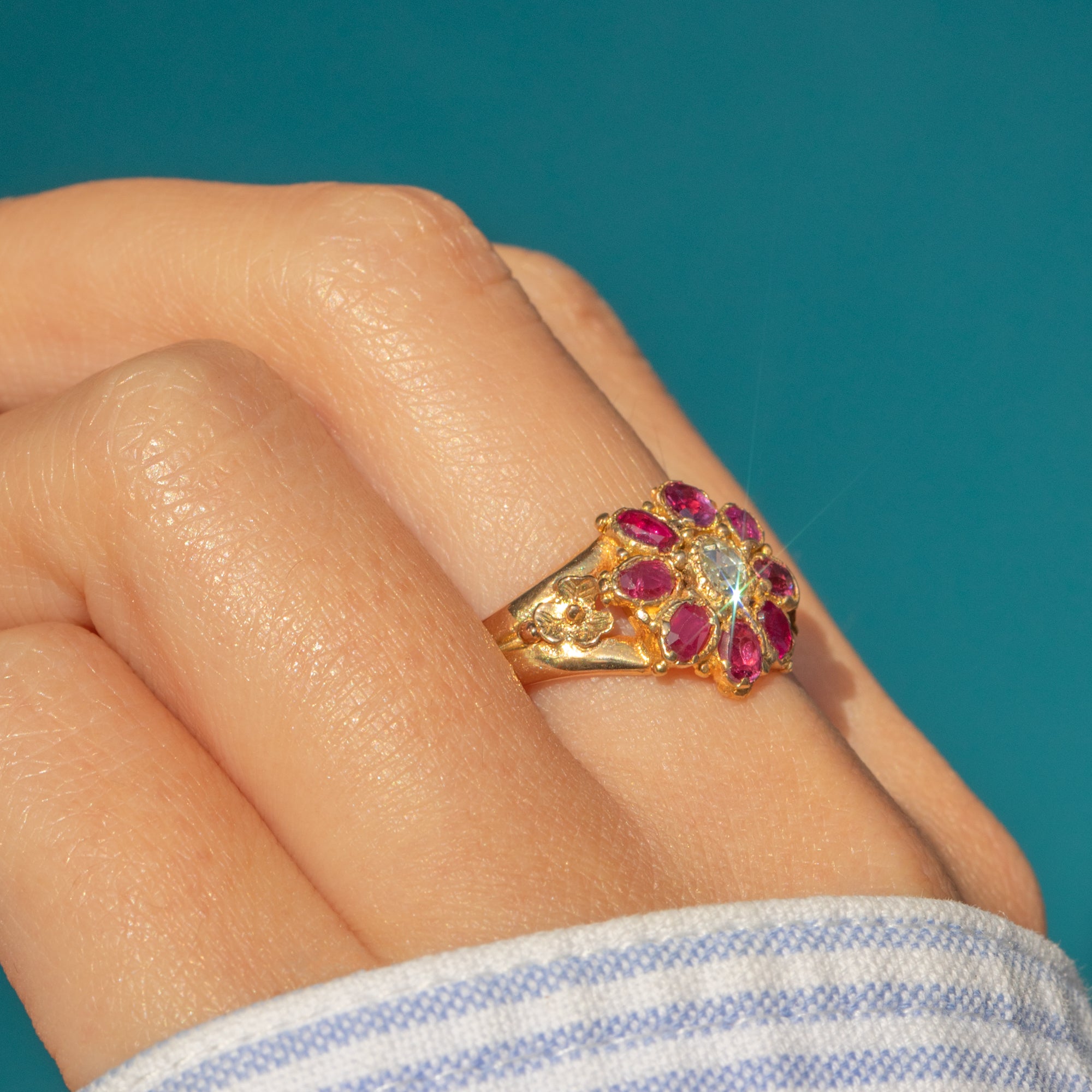 Crafted in rich 18ct Gold, the fiery Rubies provide a striking contrast, enhancing the Diamond’s glow. A timeless daisy-style design that captures the beauty and craftsmanship of the late Victorian era, perfect as a unique engagement ring or a statement of antique elegance.