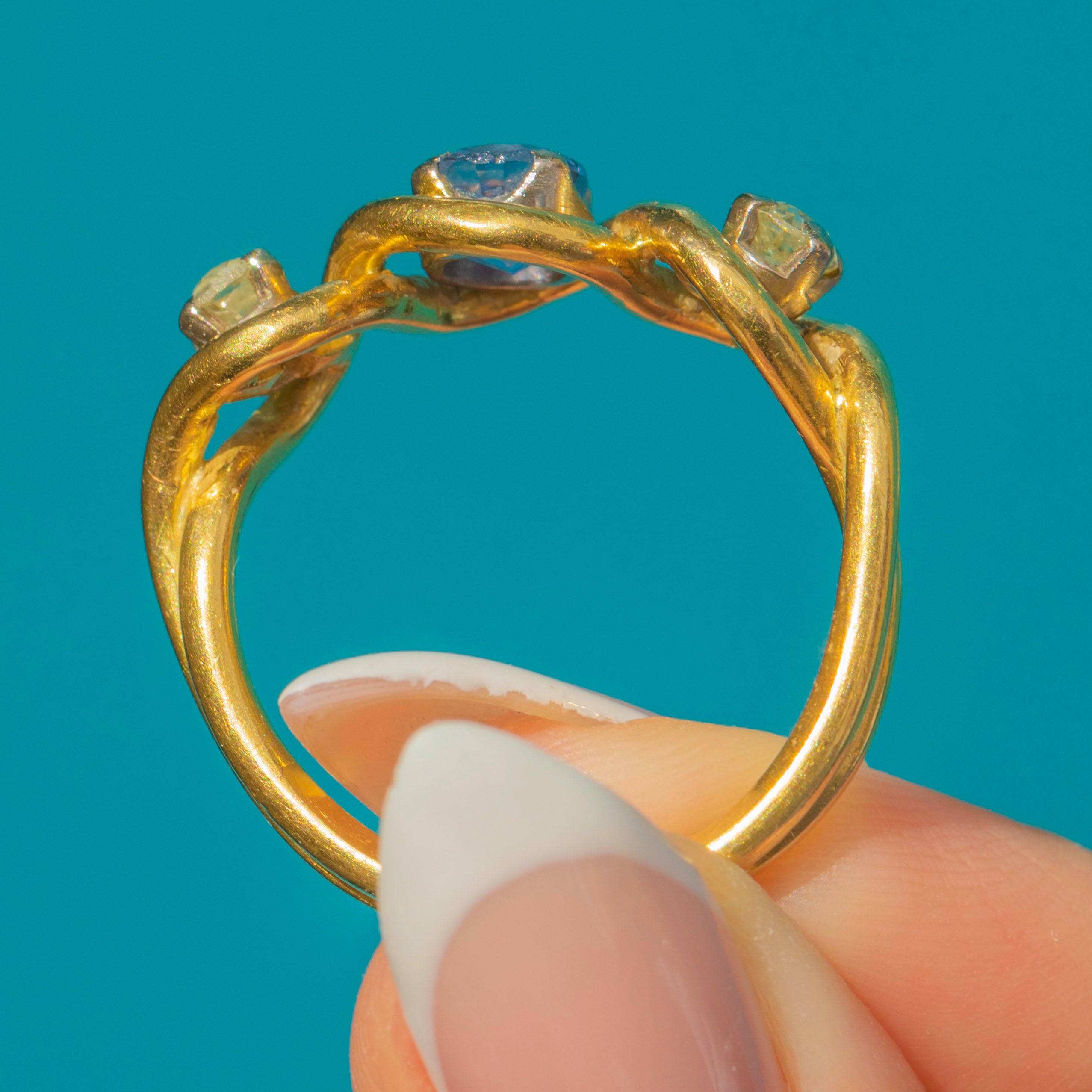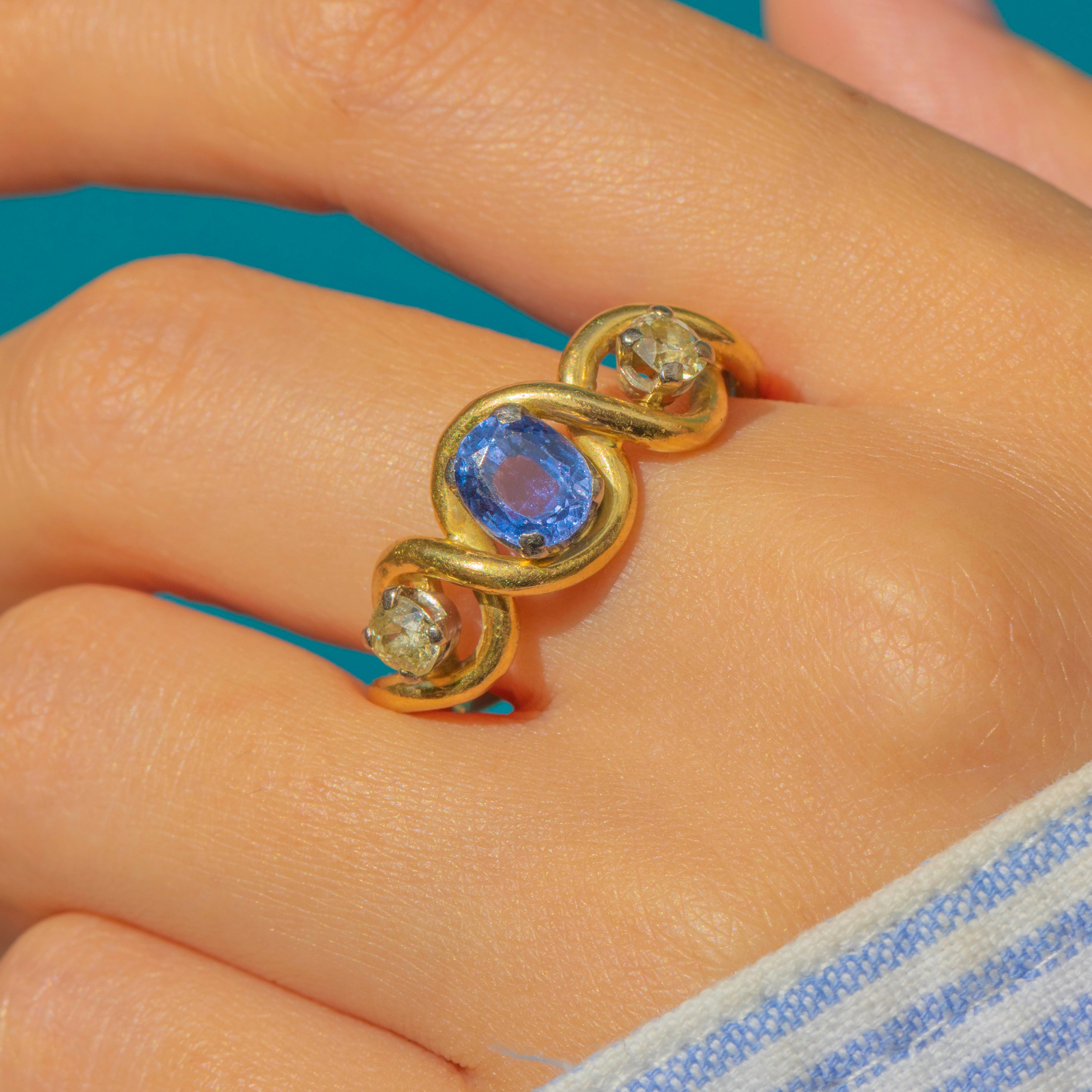 A charming late Victorian twist ring in rich 18ct Gold, featuring a vibrant oval Sapphire flanked by two Old Mine Cut Diamonds. The deeply cut Diamonds sparkle with antique fire, beautifully offsetting the Sapphire’s cool blue glow. The twisting Gold shoulders sweep gracefully around the stones, lending the piece a dynamic, romantic feel characteristic of the era.