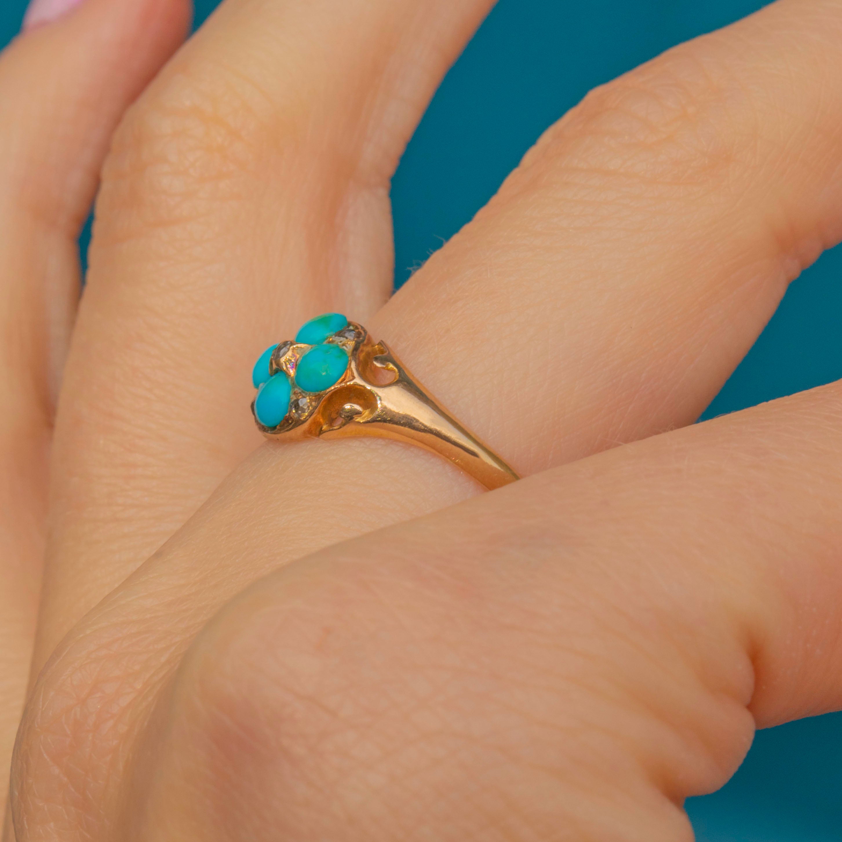 This gorgeous Victorian ring is crafted in glowing 18ct Gold and set with a vibrant quartet of Turquoise cabochons framed by sparkling antique Rose-cut Diamonds. The combination of vivid duck-egg blue Turquoise and warm Gold creates a look that’s both romantic and timeless — a perfect example of late 19th-century elegance.