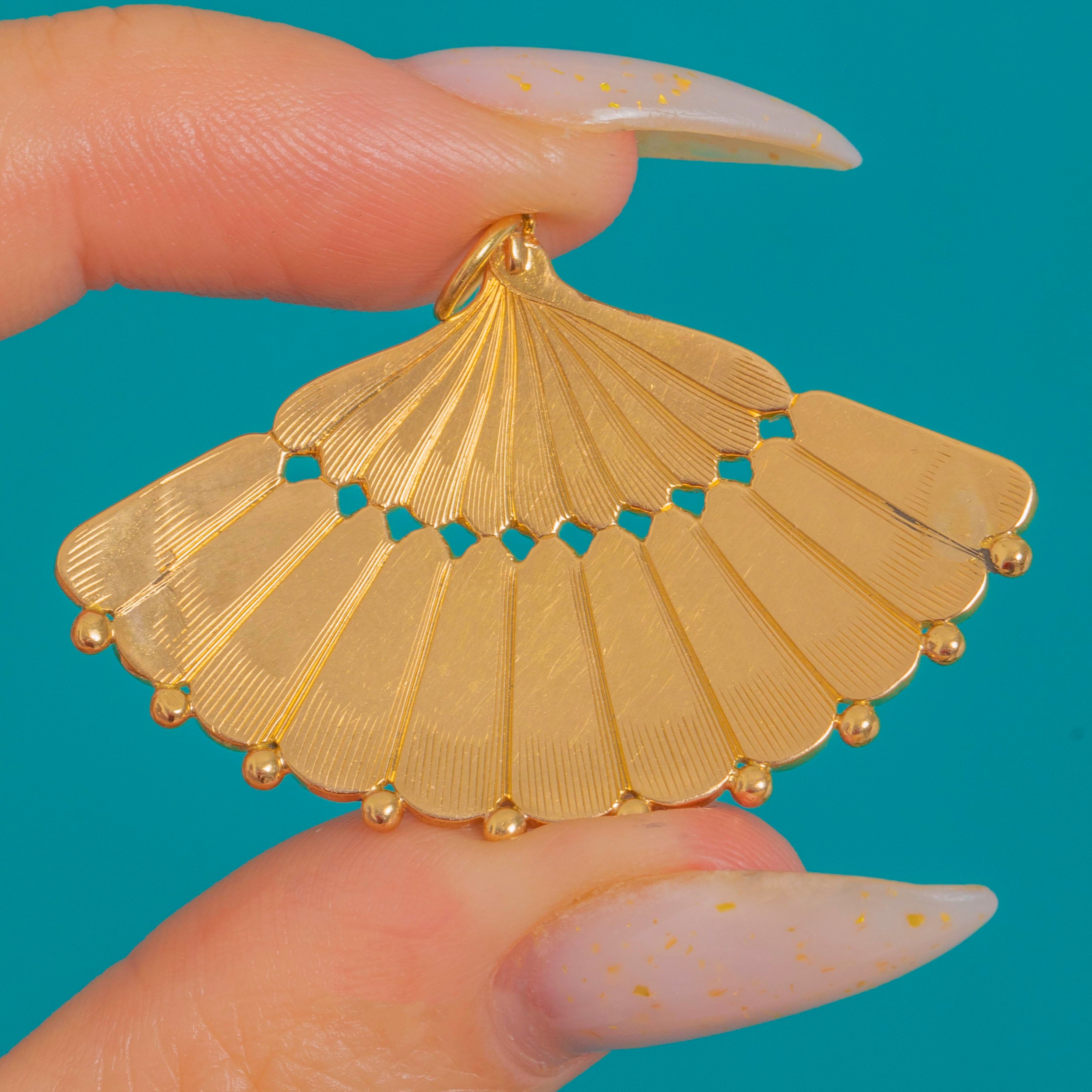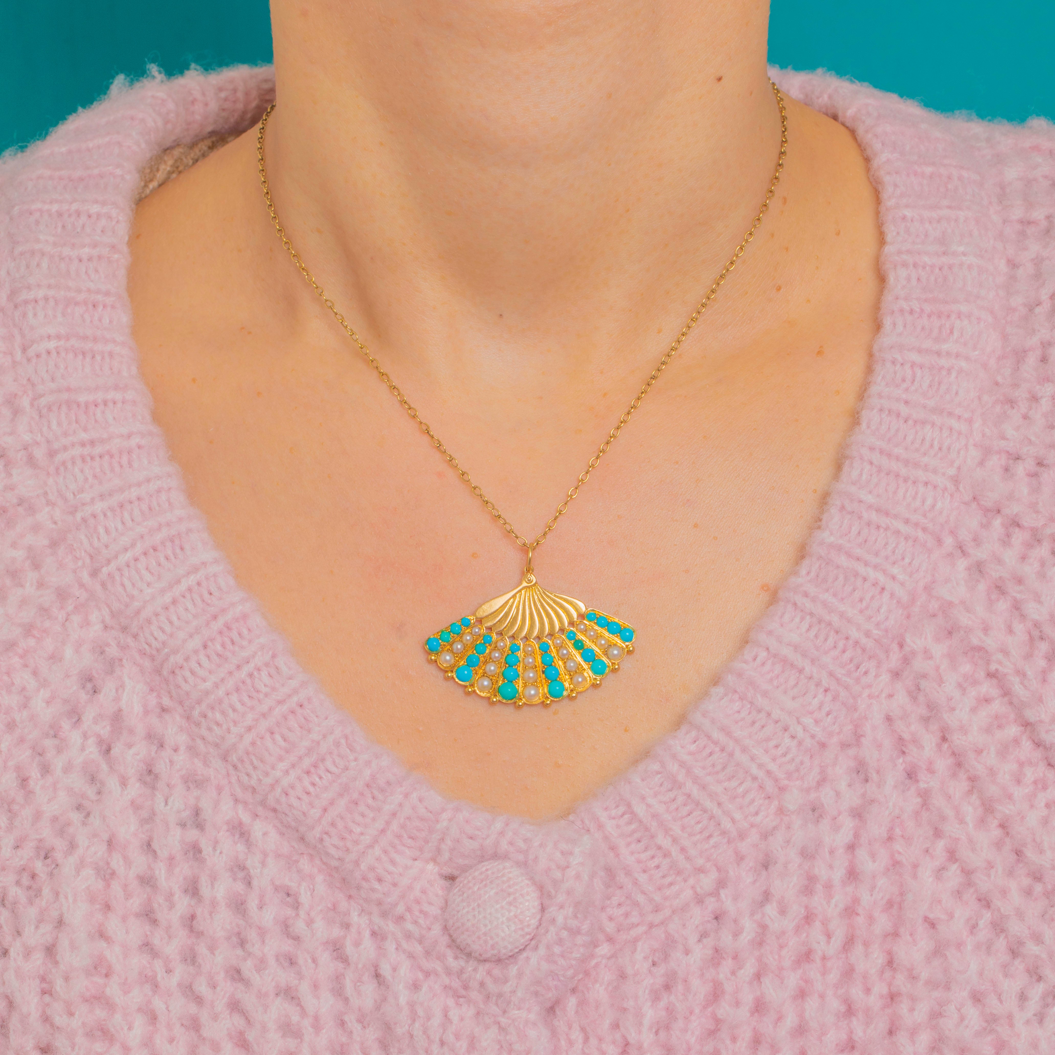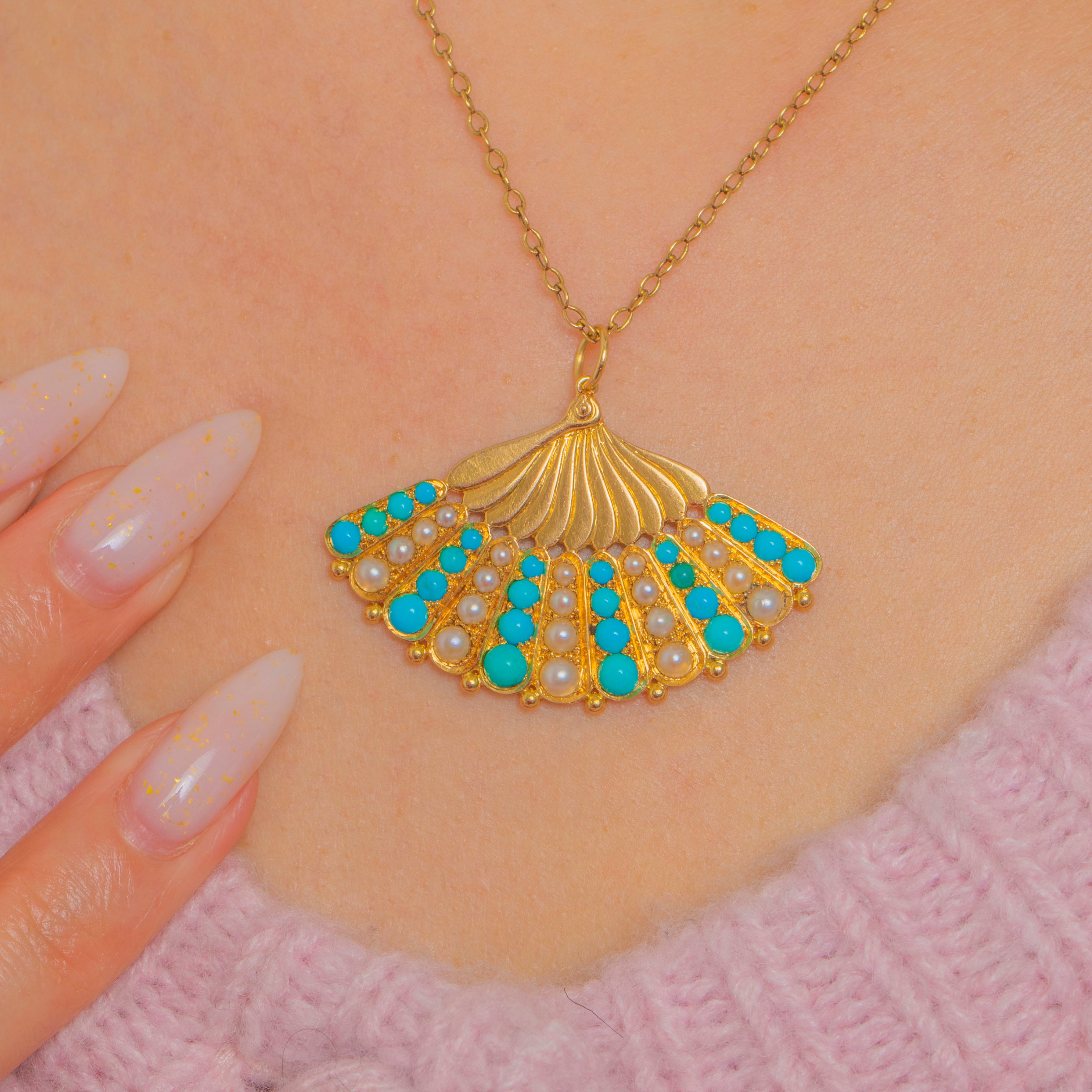 Shaped as an elegant scallop fan, this Victorian 18ct Gold pendant is richly embellished with alternating Turquoise cabochons and lustrous Pearls. Radiating fluted lines and a refined beaded perimeter celebrate the natural beauty of the shell motif, while the vivid blues and creamy tones create a timeless, feminine palette.