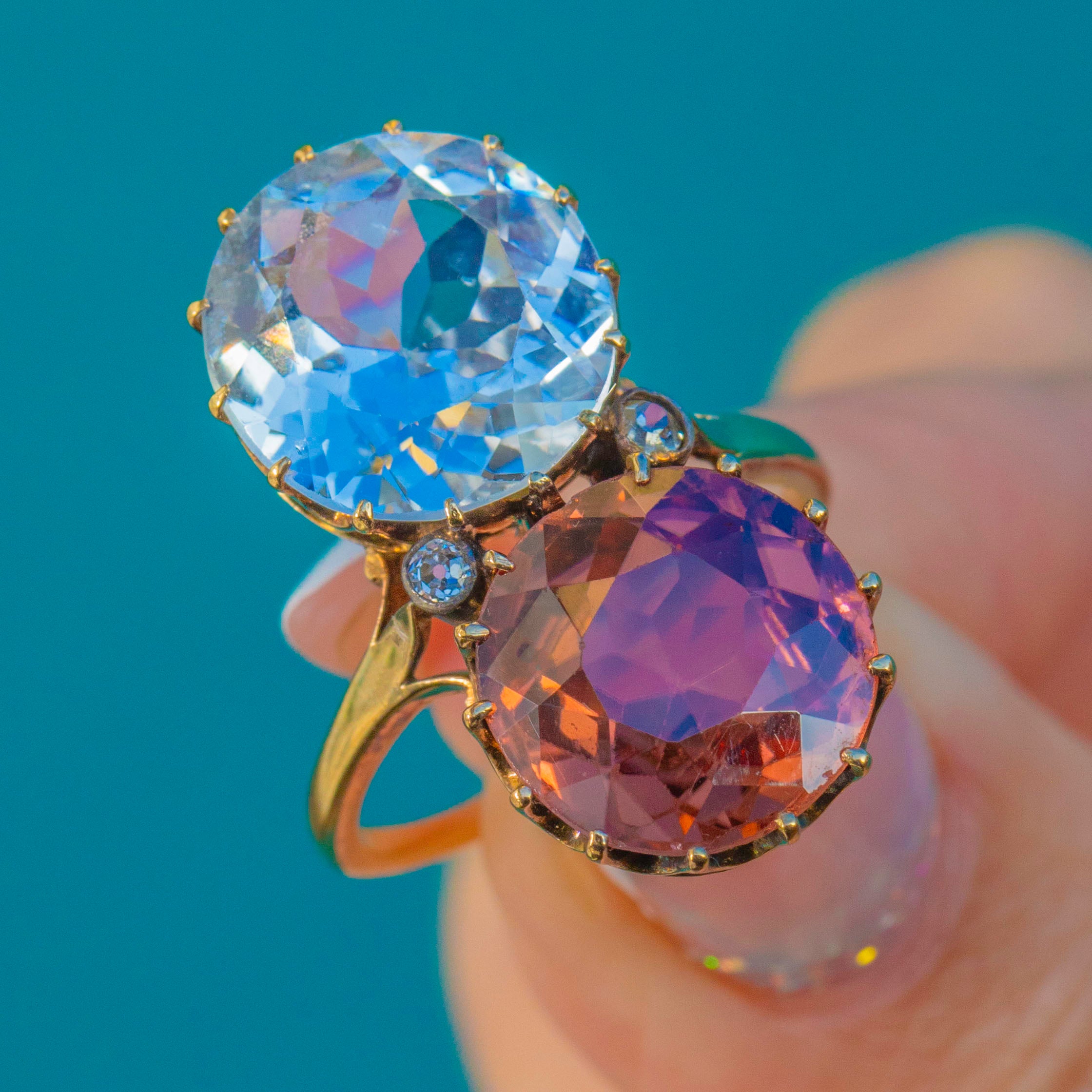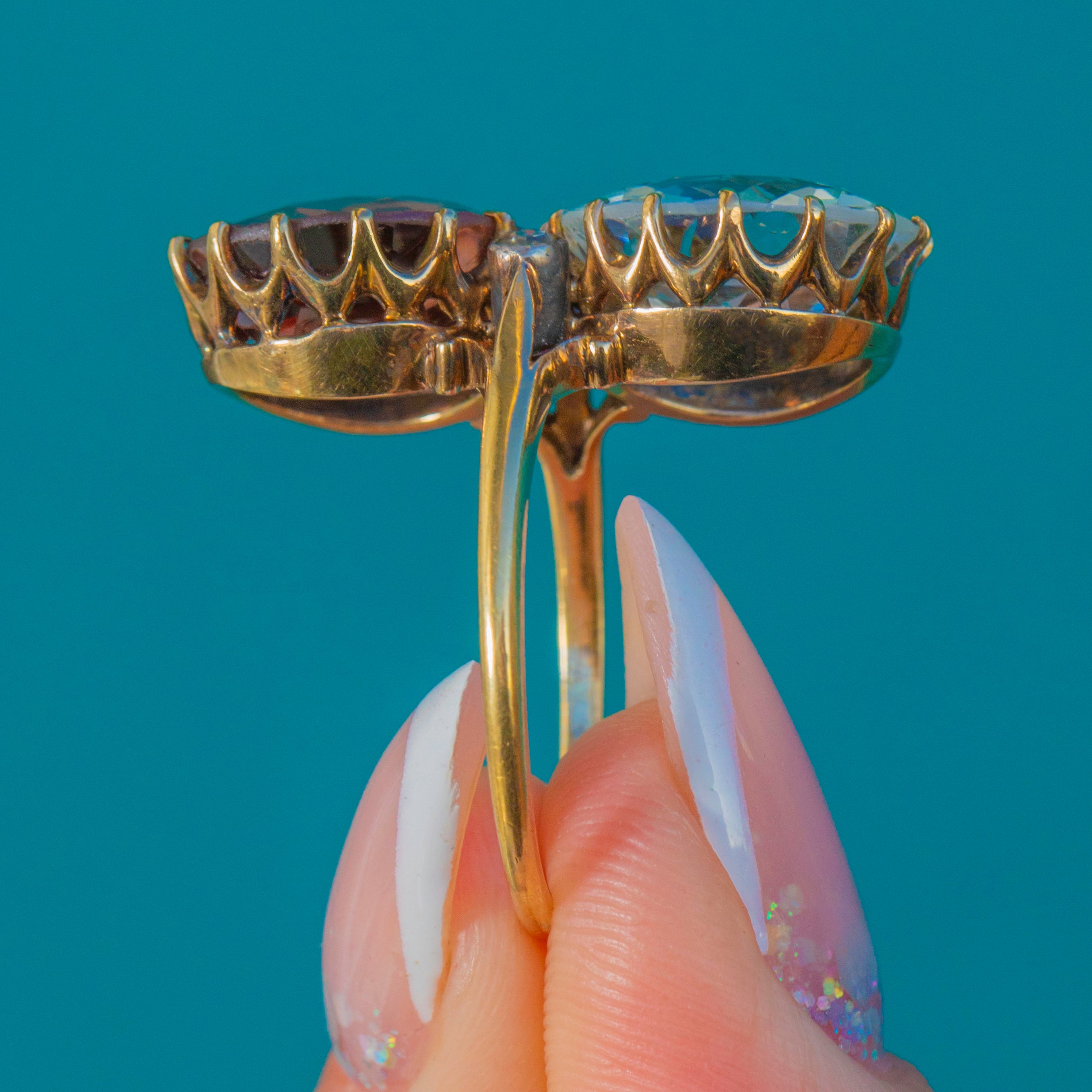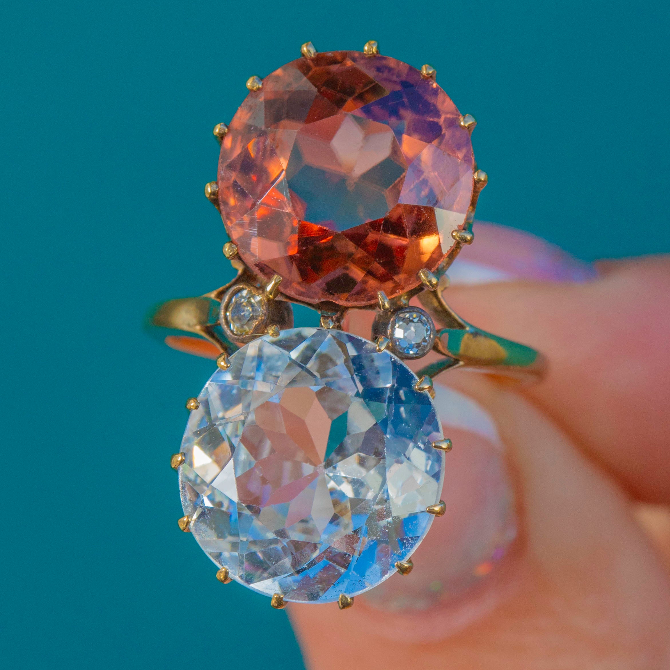 A striking Victorian toi et moi ring marrying colour, romance and scale. Twin antique round-cut Zircons totalling an impressive 14.00ct —one an icy blue, the other a warm peach‑pink—rise proudly in tall coronet claw settings atop an 18ct Gold mount. Their open backs and airy, scalloped galleries invite the light, creating a vivid duet that dances across the finger.
