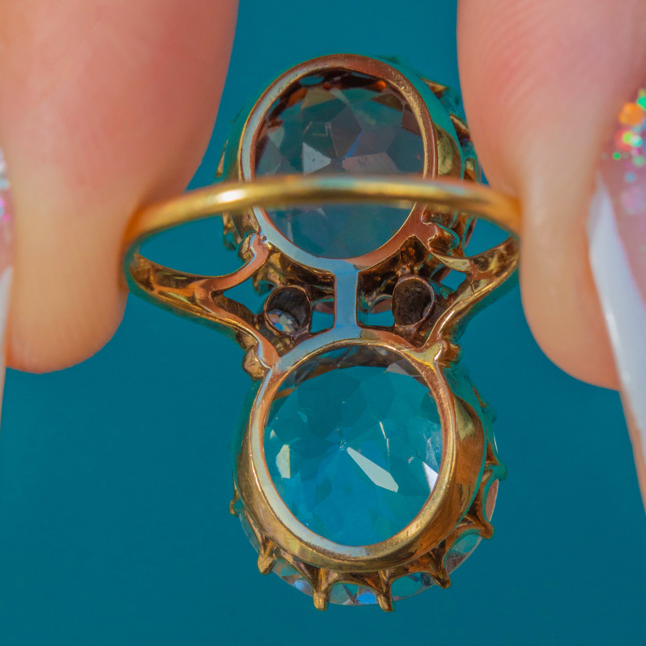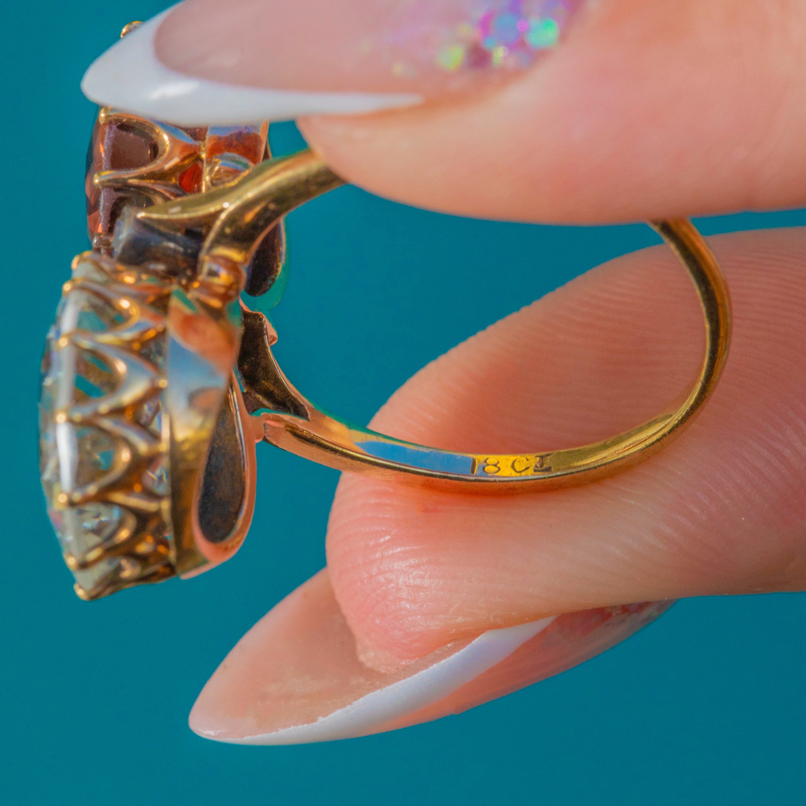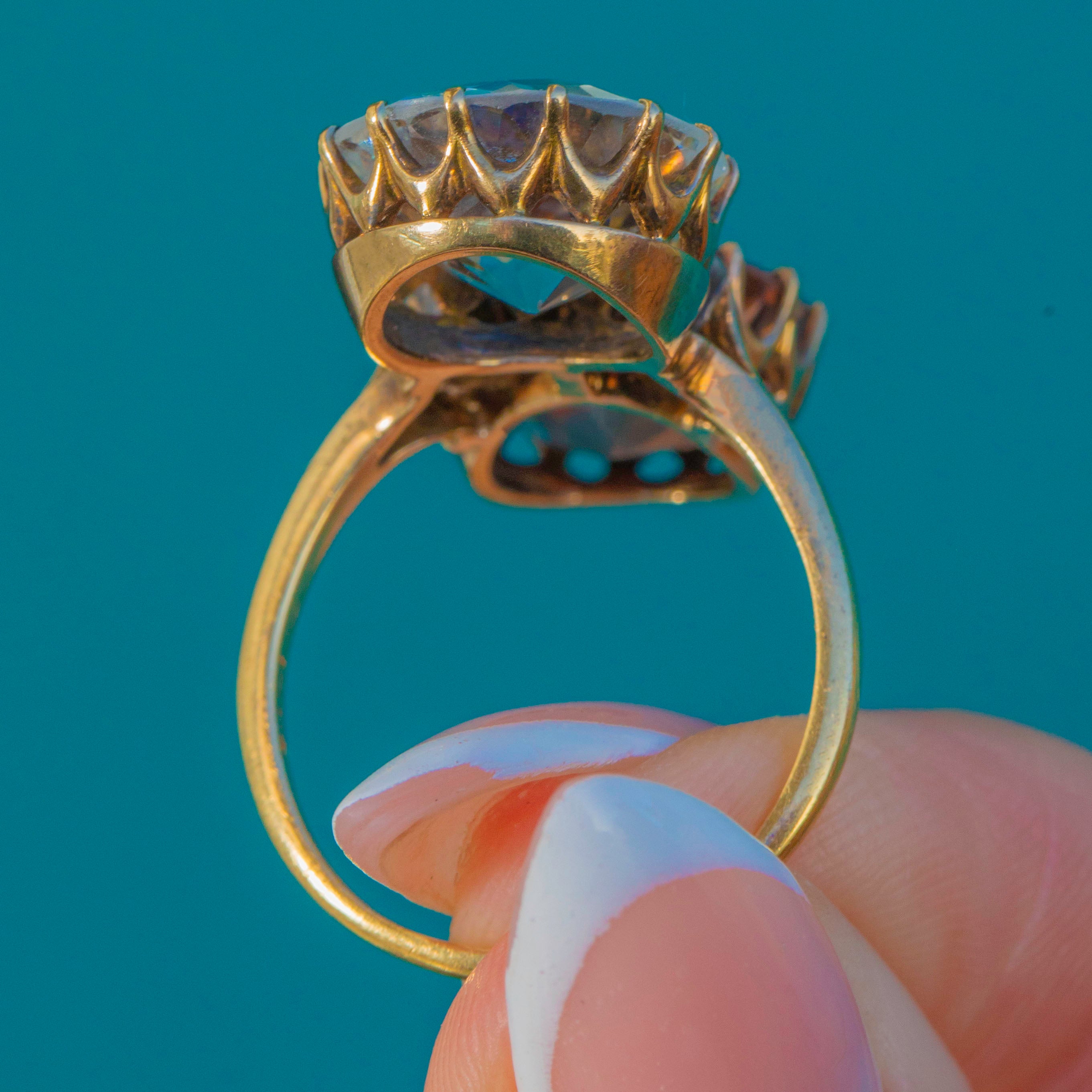 A striking Victorian toi et moi ring marrying colour, romance and scale. Twin antique round-cut Zircons totalling an impressive 14.00ct —one an icy blue, the other a warm peach‑pink—rise proudly in tall coronet claw settings atop an 18ct Gold mount. Their open backs and airy, scalloped galleries invite the light, creating a vivid duet that dances across the finger.