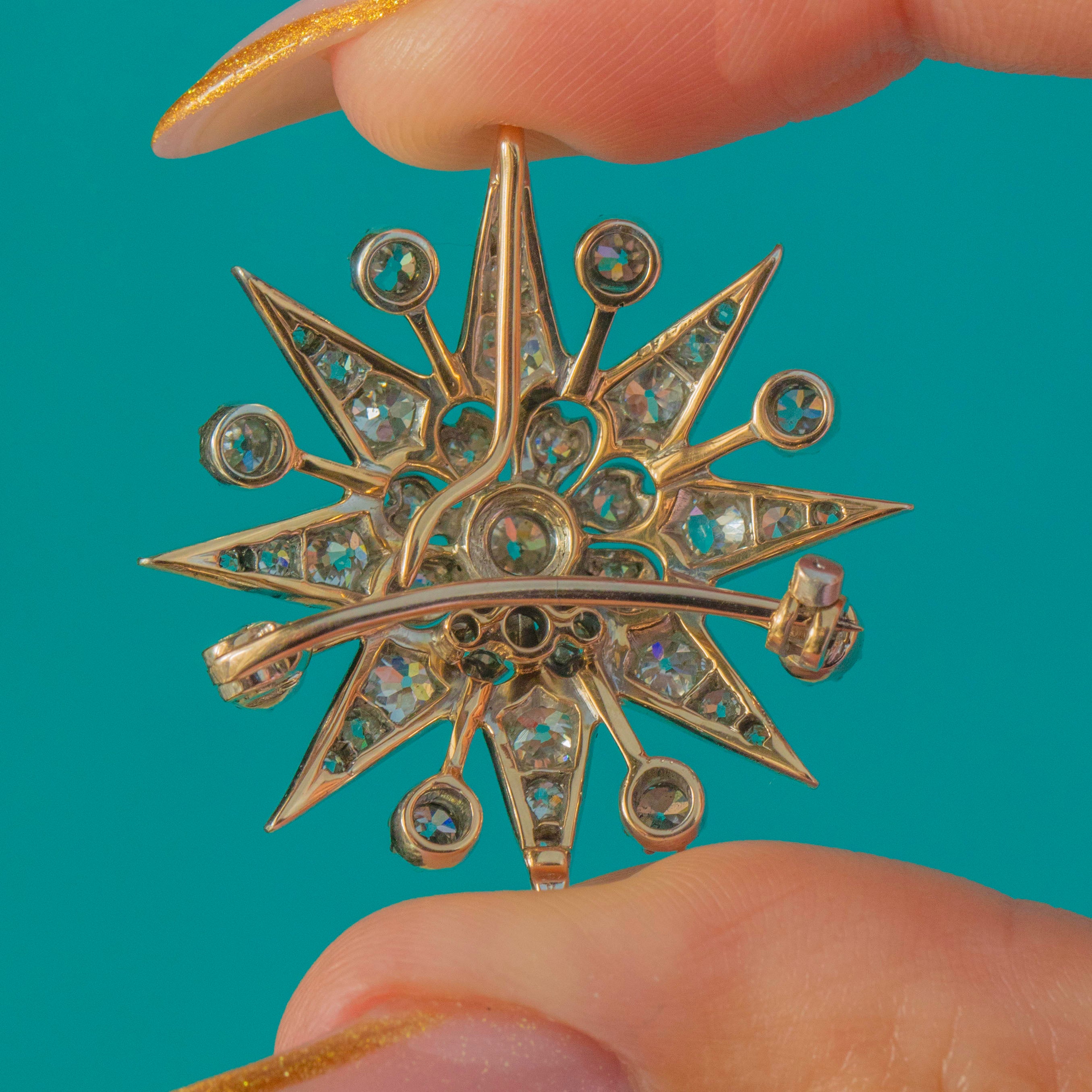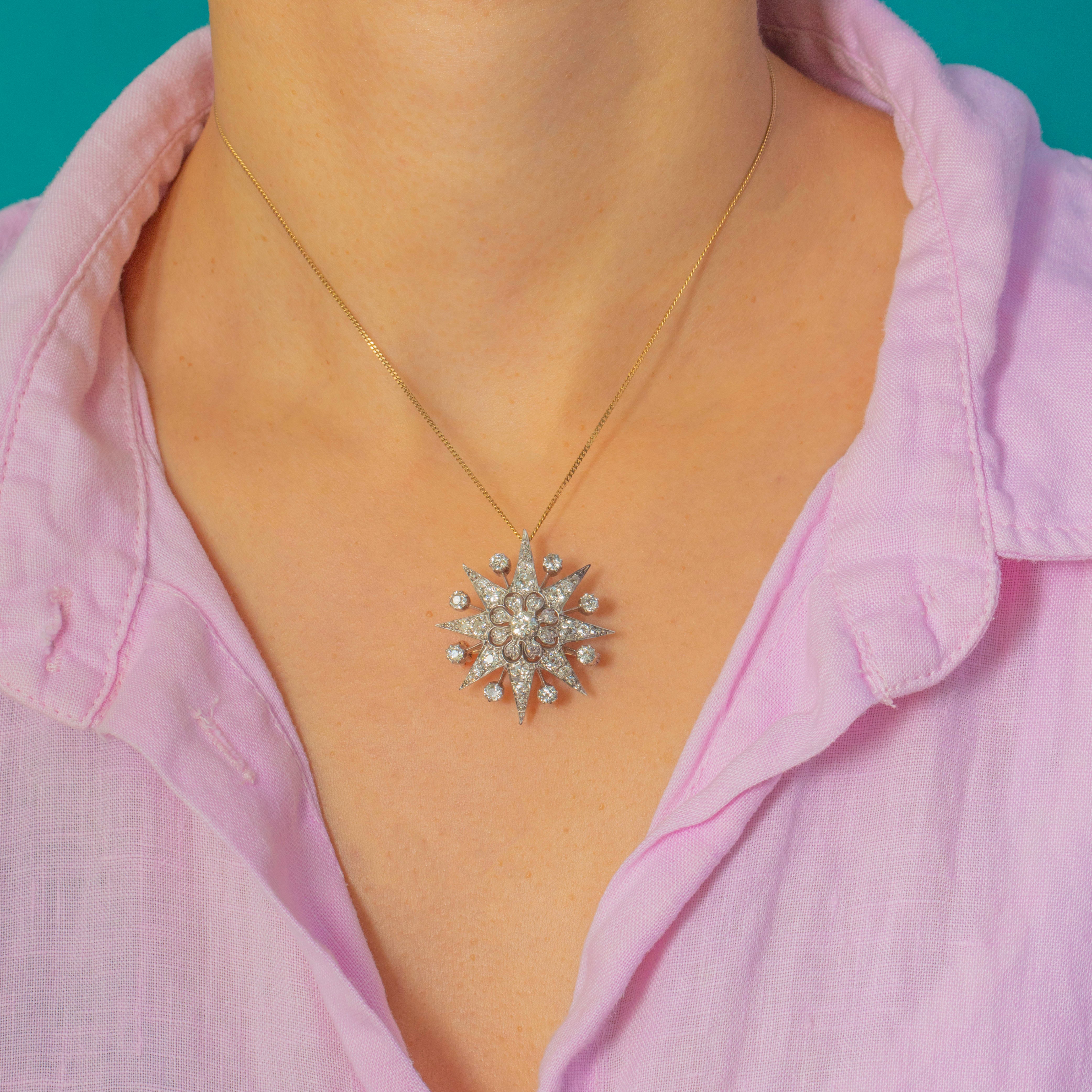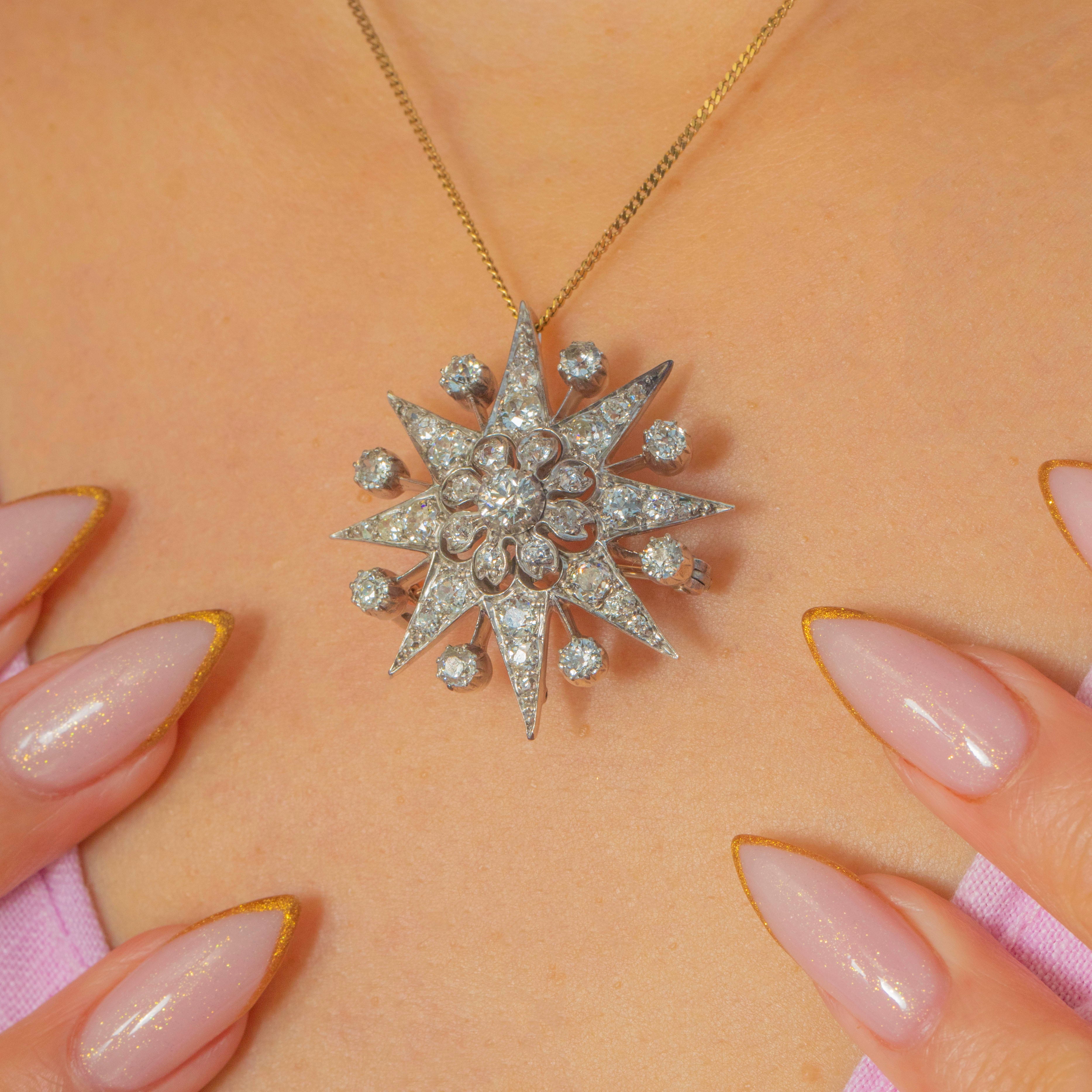A spectacular Victorian Diamond starburst pendant with brooch fittings in gleaming Silver and 15ct Gold, ablaze with approximately 2.75cts of sparkling antique Diamonds. The crisp, radiating rays and clustered centre give incredible presence, catching the light from every angle.
