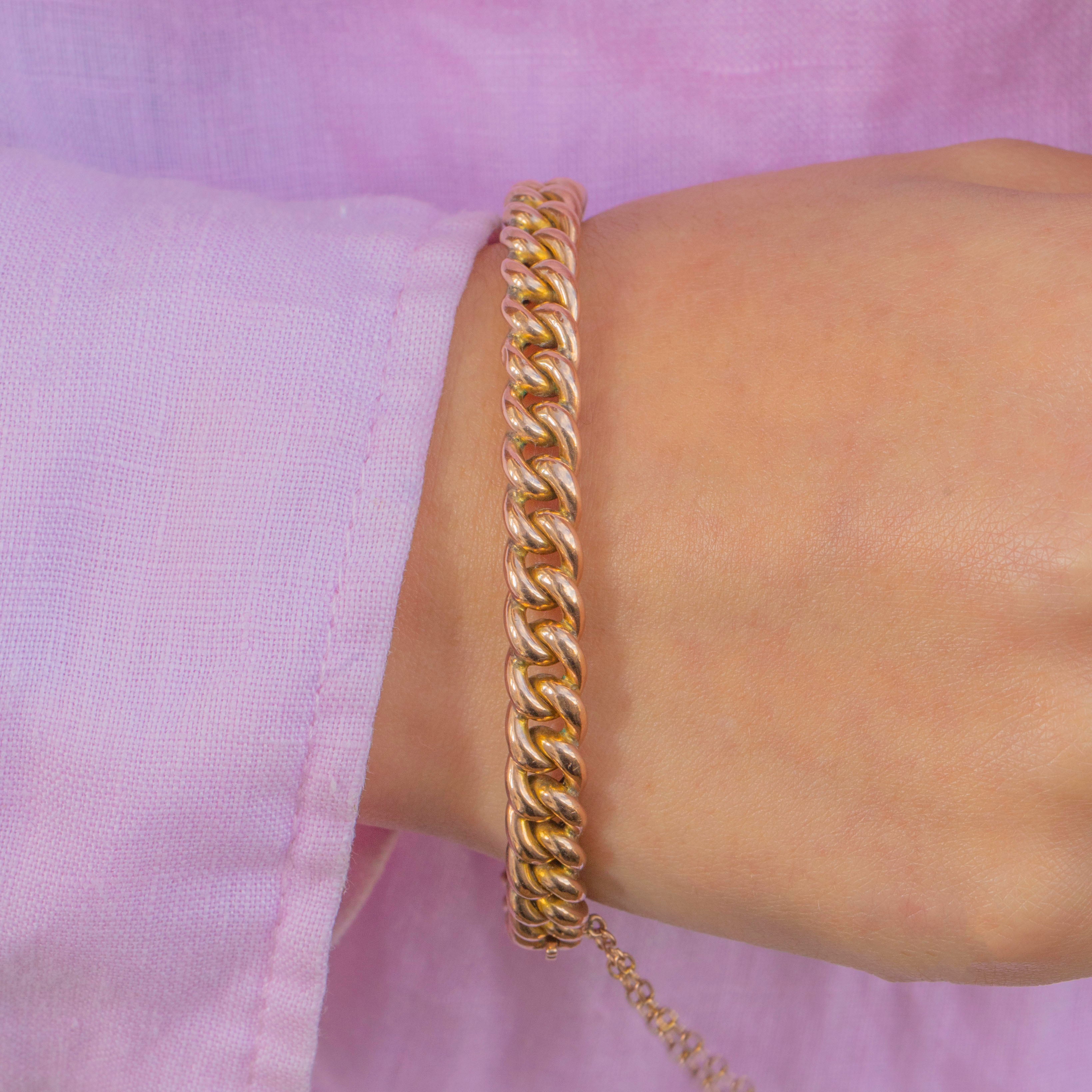 This antique 9ct Gold curb bangle is a gorgeous Victorian classic, dating to c.1900. The rounded curb links form a smooth, continuous row of Gold around the wrist, giving it a sleek yet substantial feel.