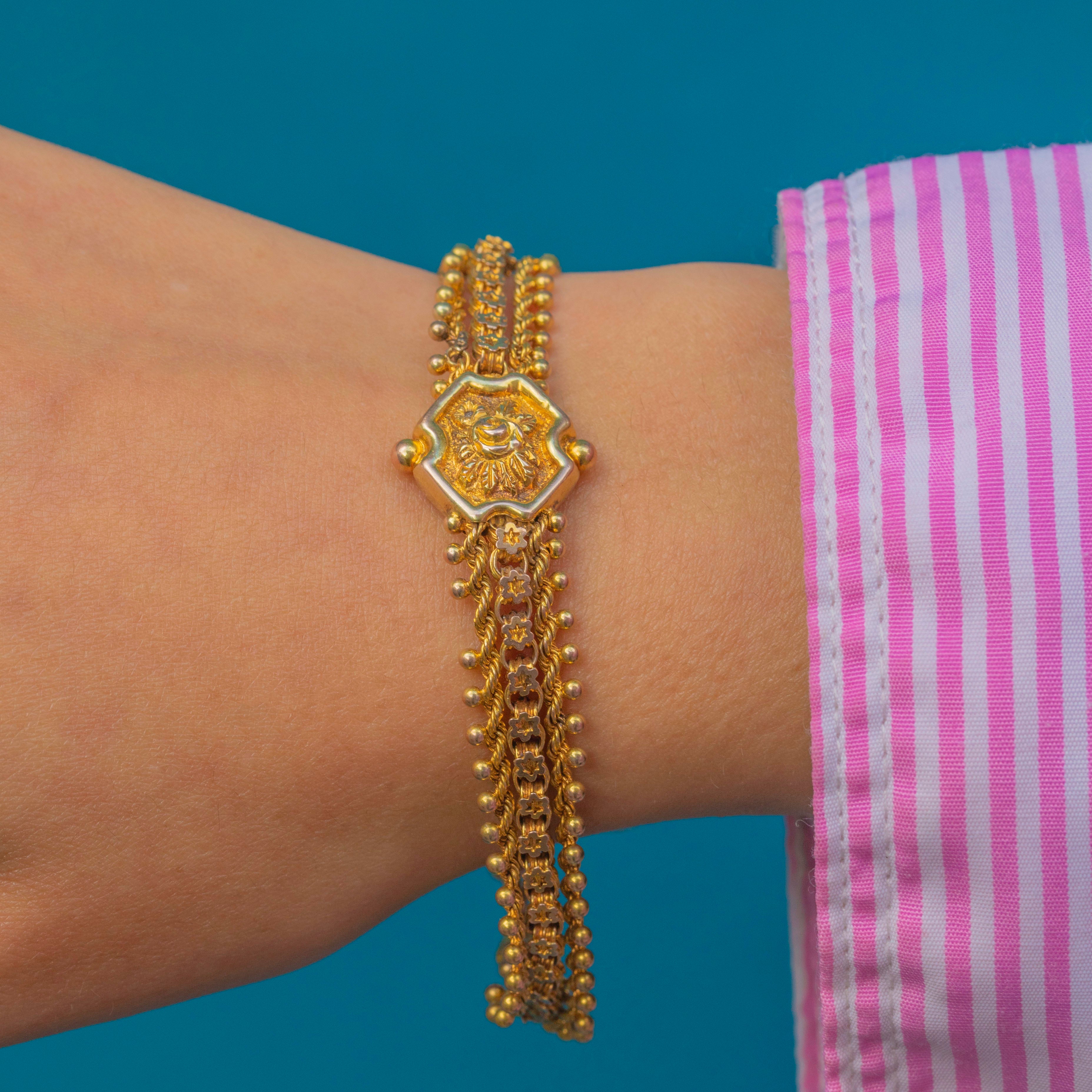 VERY GOOD: The Gold is in beautiful condition with only light surface wear consistent with age. There has been a small repair to one of the chain links, which is secure and unobtrusive. Overall the bracelet has been very well cared for, with the decorative details crisp and intact.