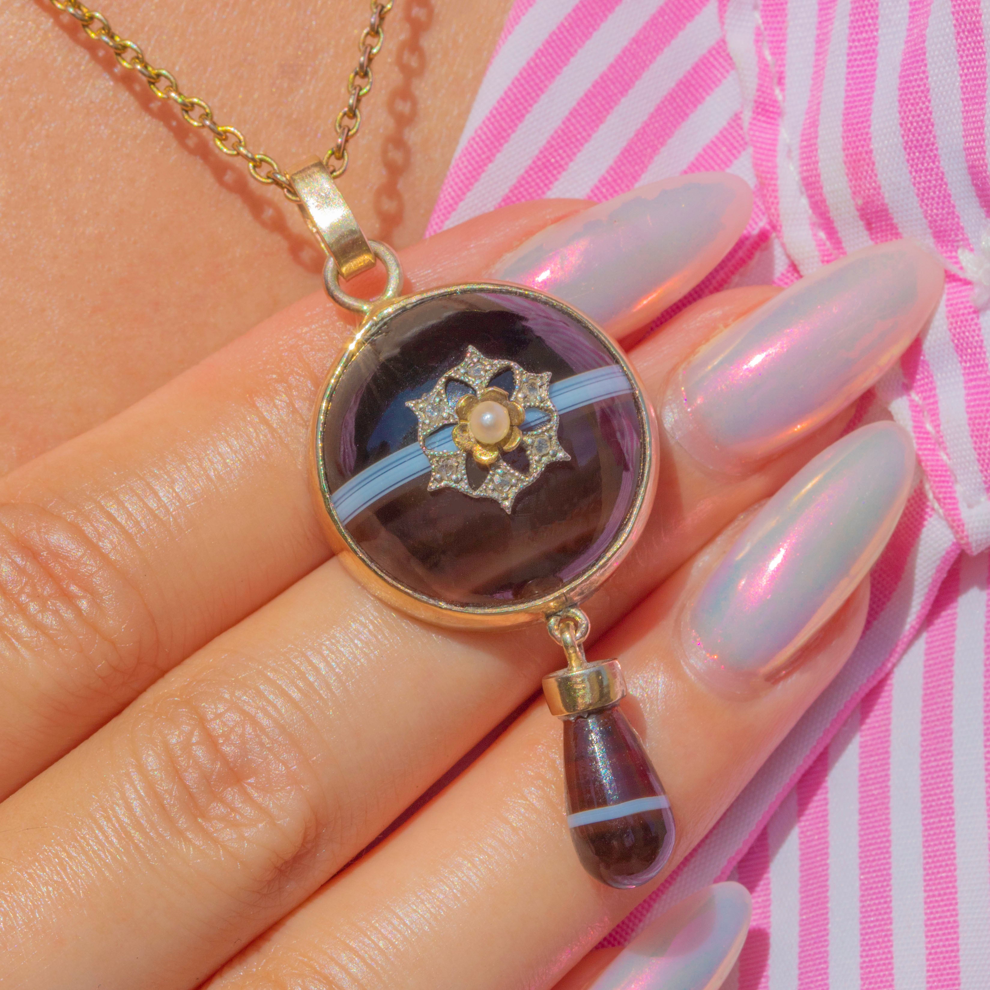 Victorian 9ct Gold Banded Agate Pendant with Pearl Diamond Flower