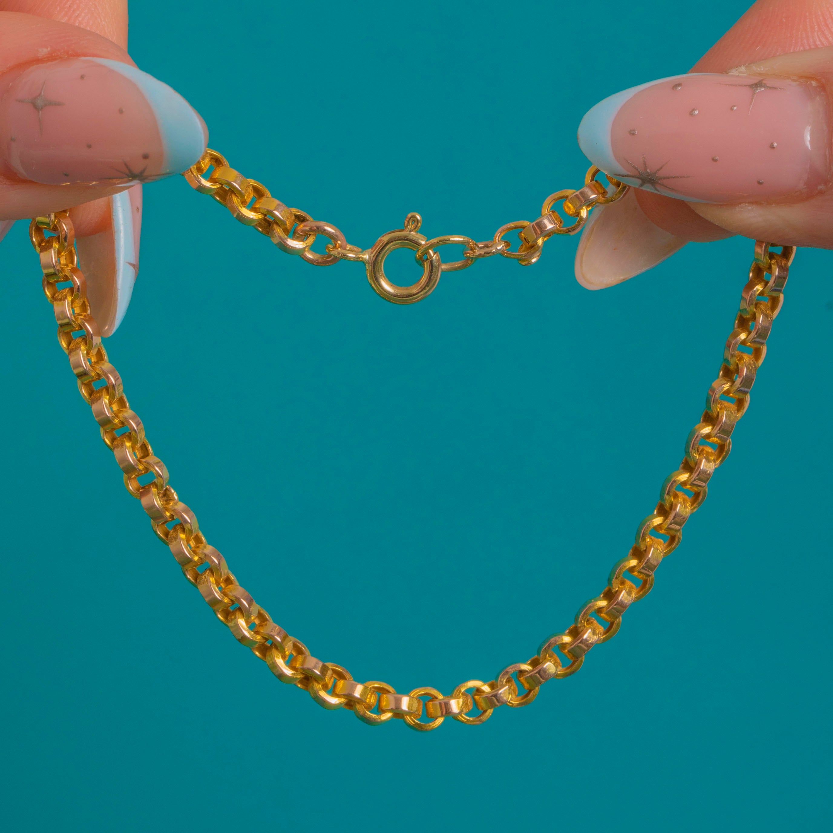 EXCELLENT: Links are bright with only light surface wear consistent with age; they remain even and well-formed with secure solder joins. The later added bolt ring clasp is in good working order and fastens securely.