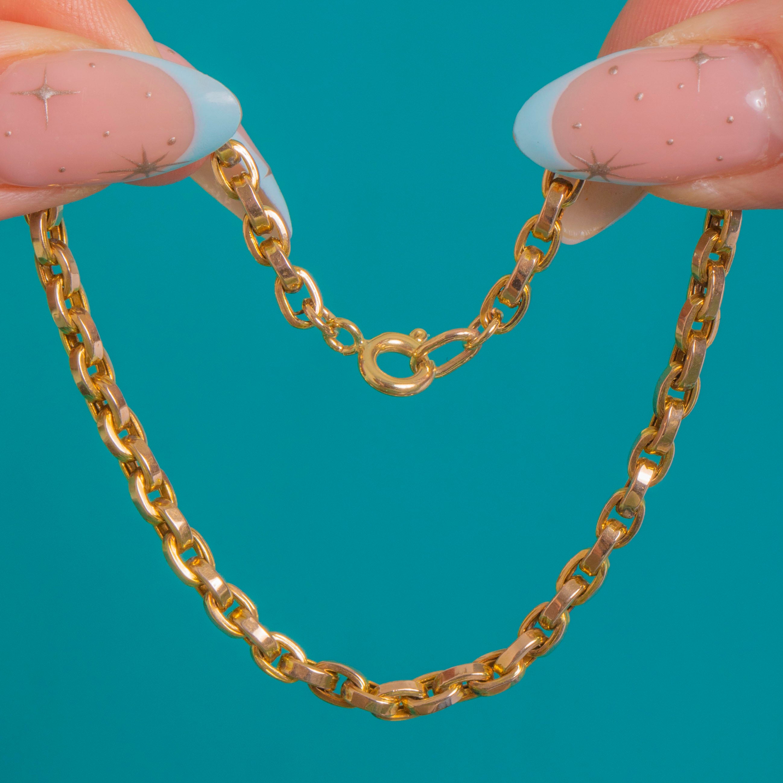 A classic Victorian 9ct Gold belcher bracelet, gleaming with a bright high-polish finish. The uniform oval belcher links have crisp, gently beveled faces that catch the light beautifully, creating a refined, minimalist silhouette.
