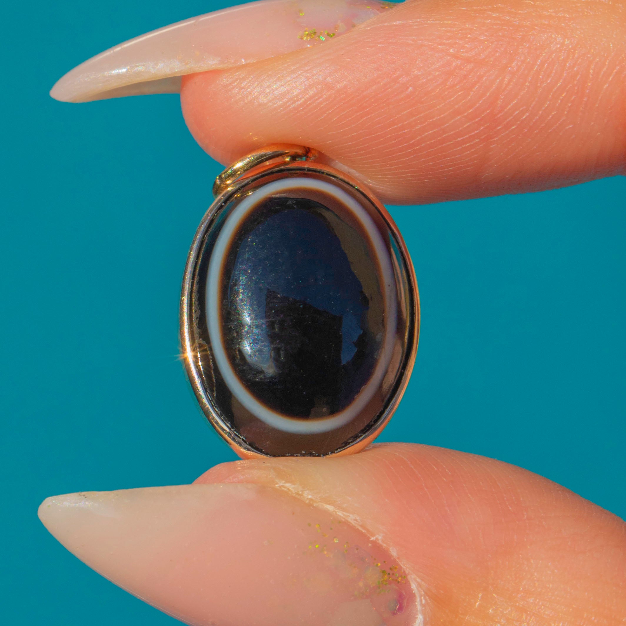 This striking Victorian pendant is crafted in 9ct Gold and set with a glossy Banded Agate cabochon. The natural black stone displays bold white and brown layers, creating a dramatic and eye-catching contrast.
