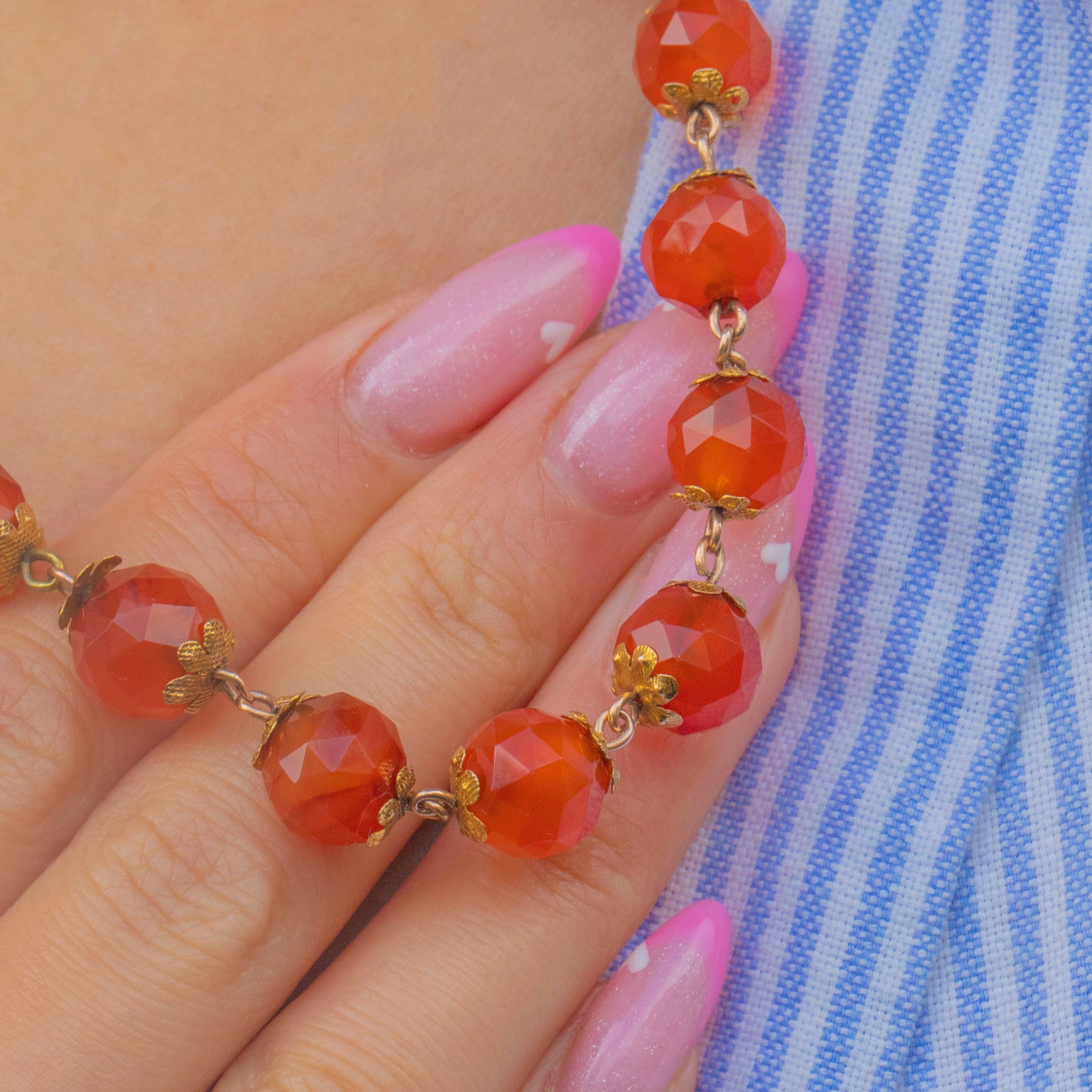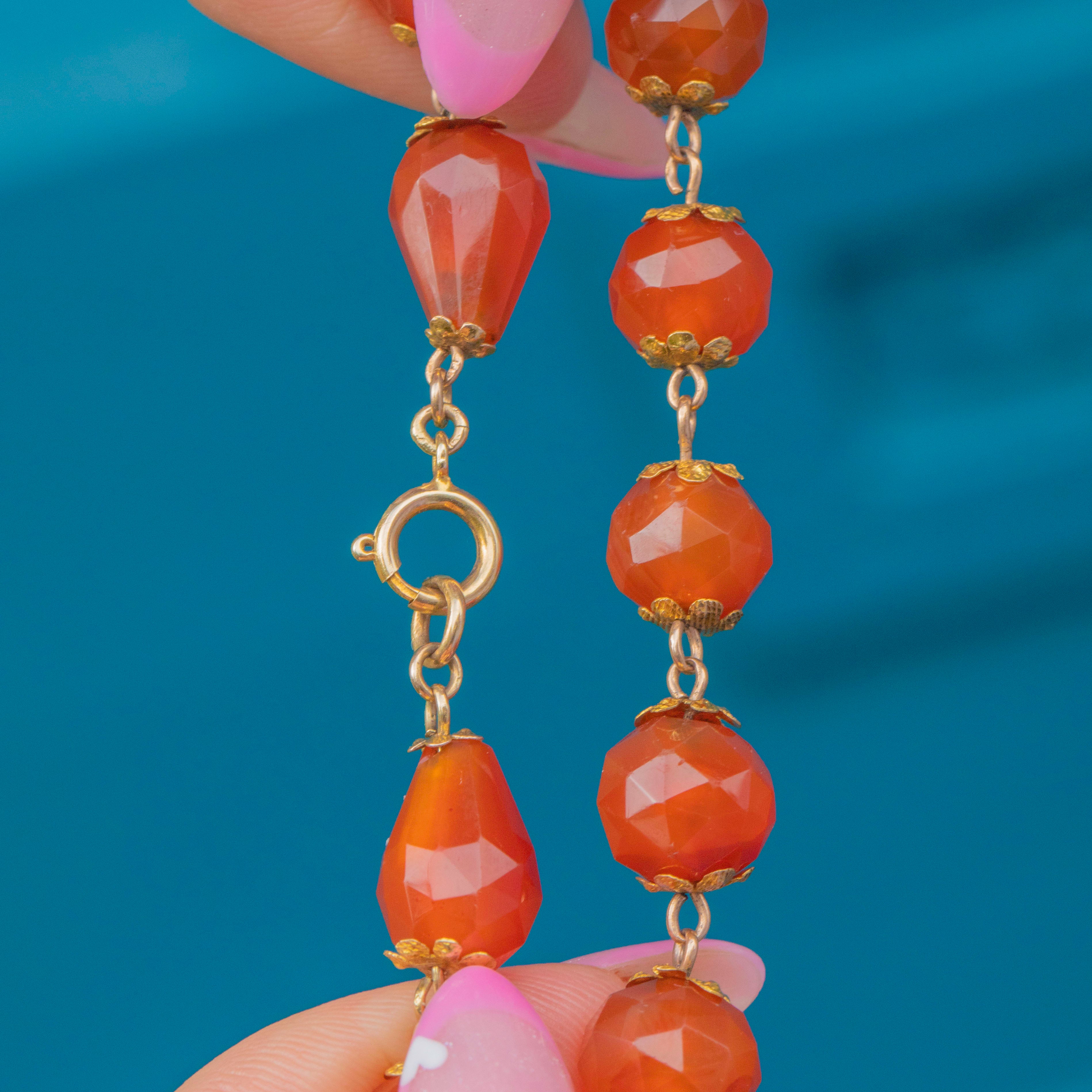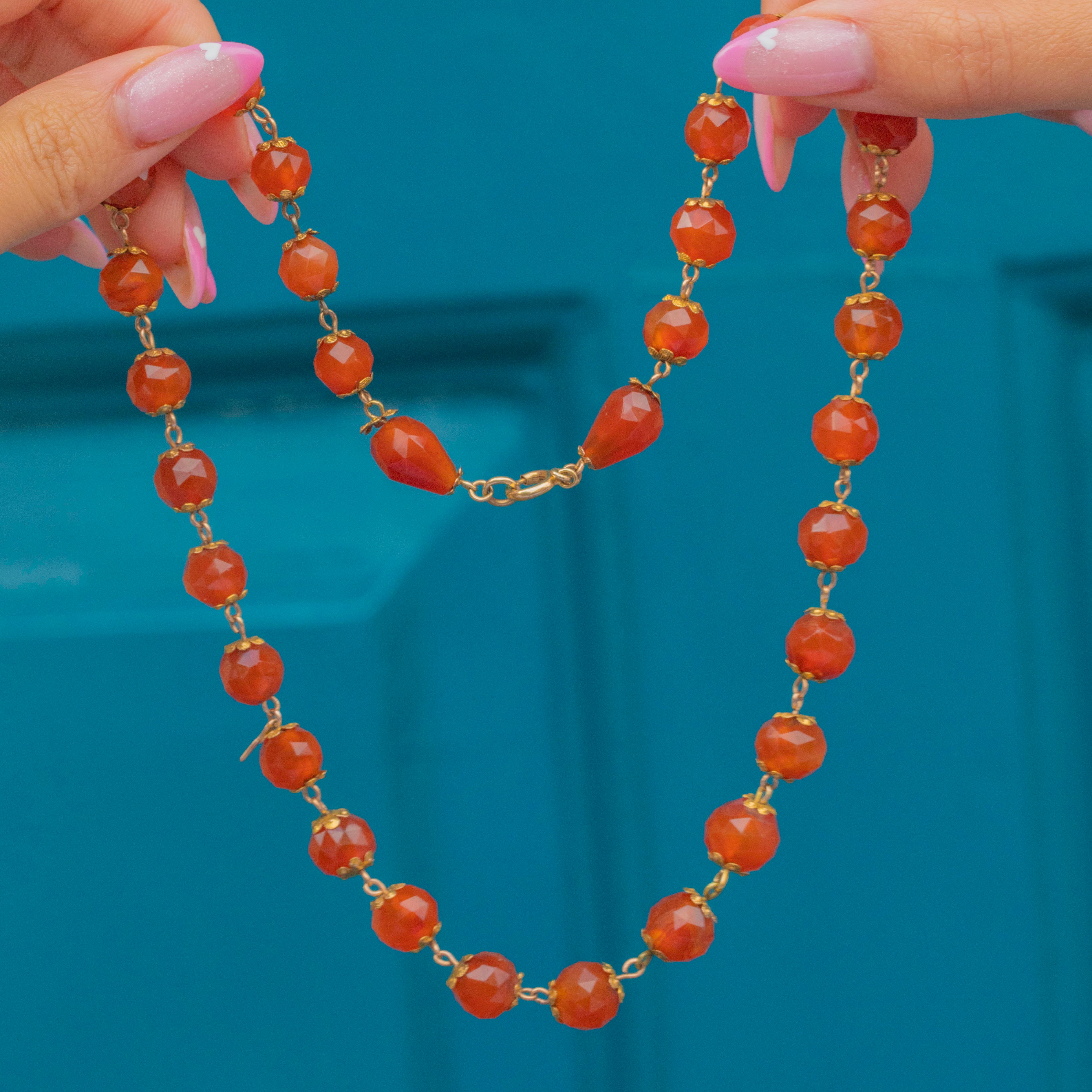 EXCELLENT: Carnelian beads are smooth and lustrous with no chips or cracks, showing attractive, even colour. Floral Gold settings are secure and well-preserved with minimal surface wear — a beautifully cared-for Victorian strand.
