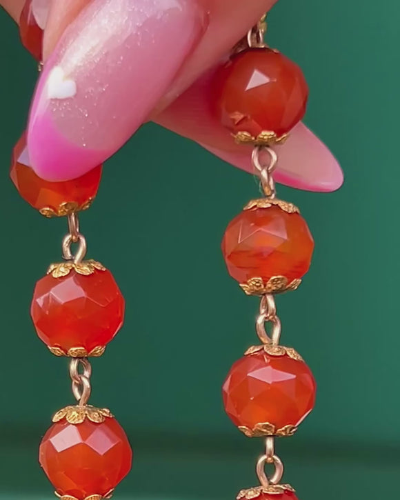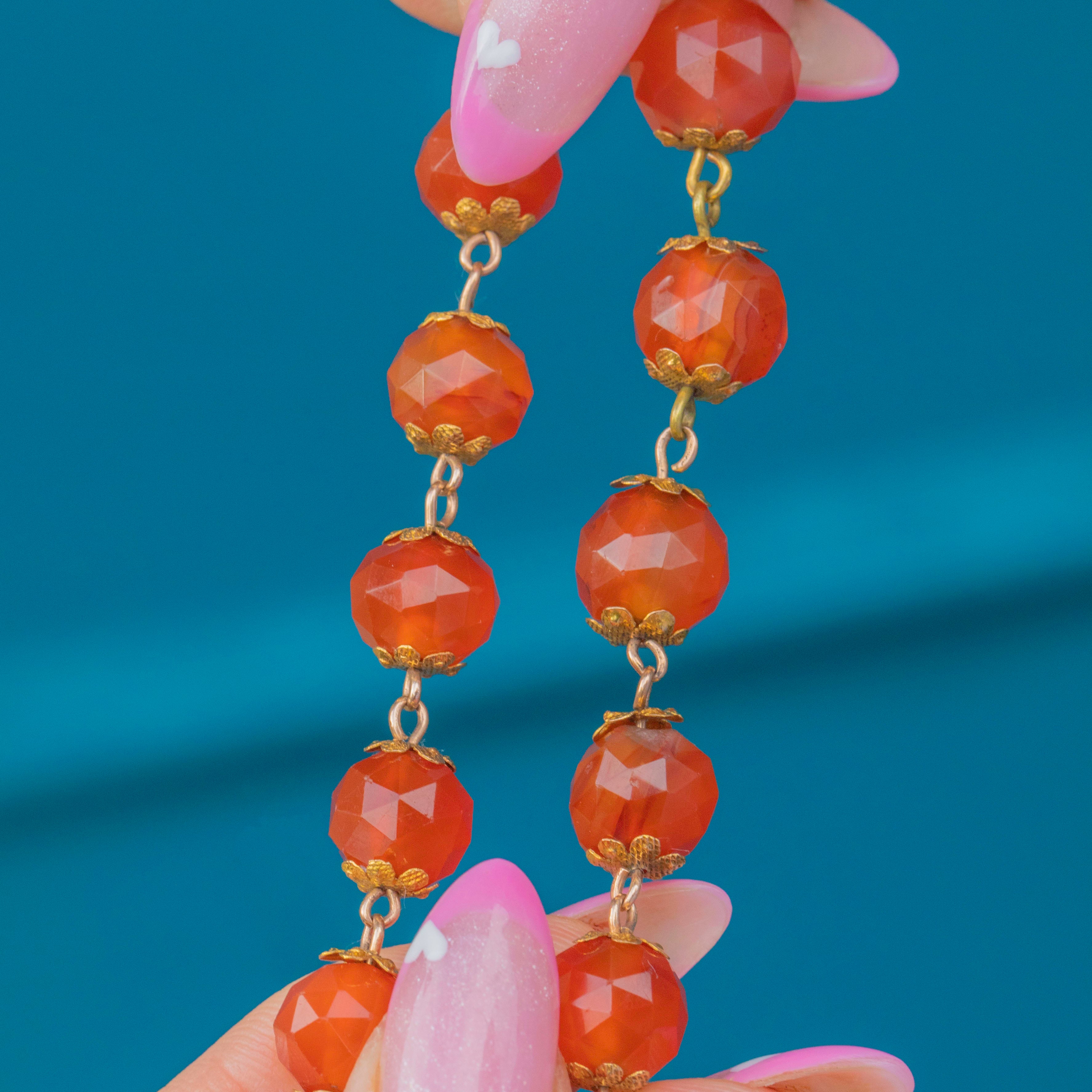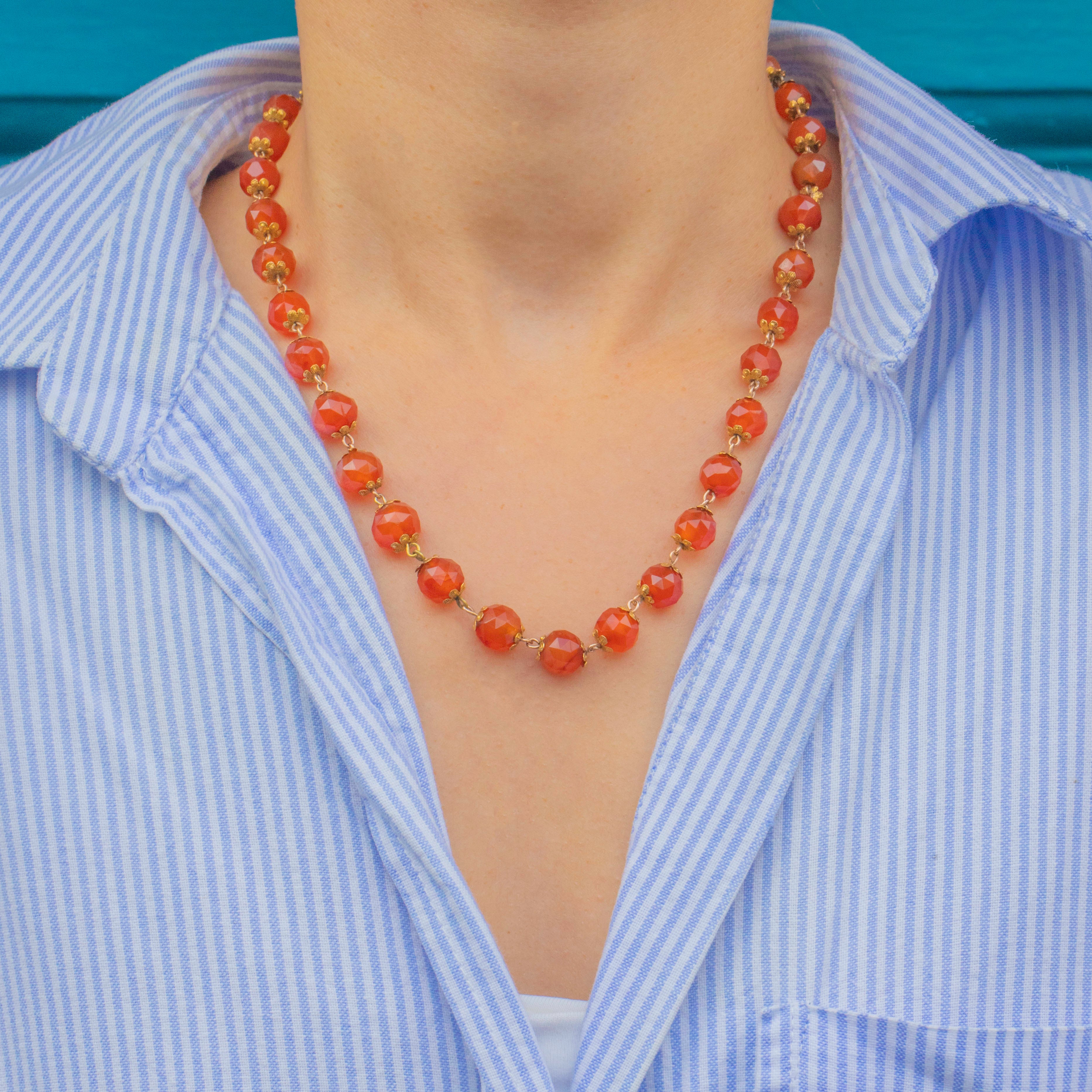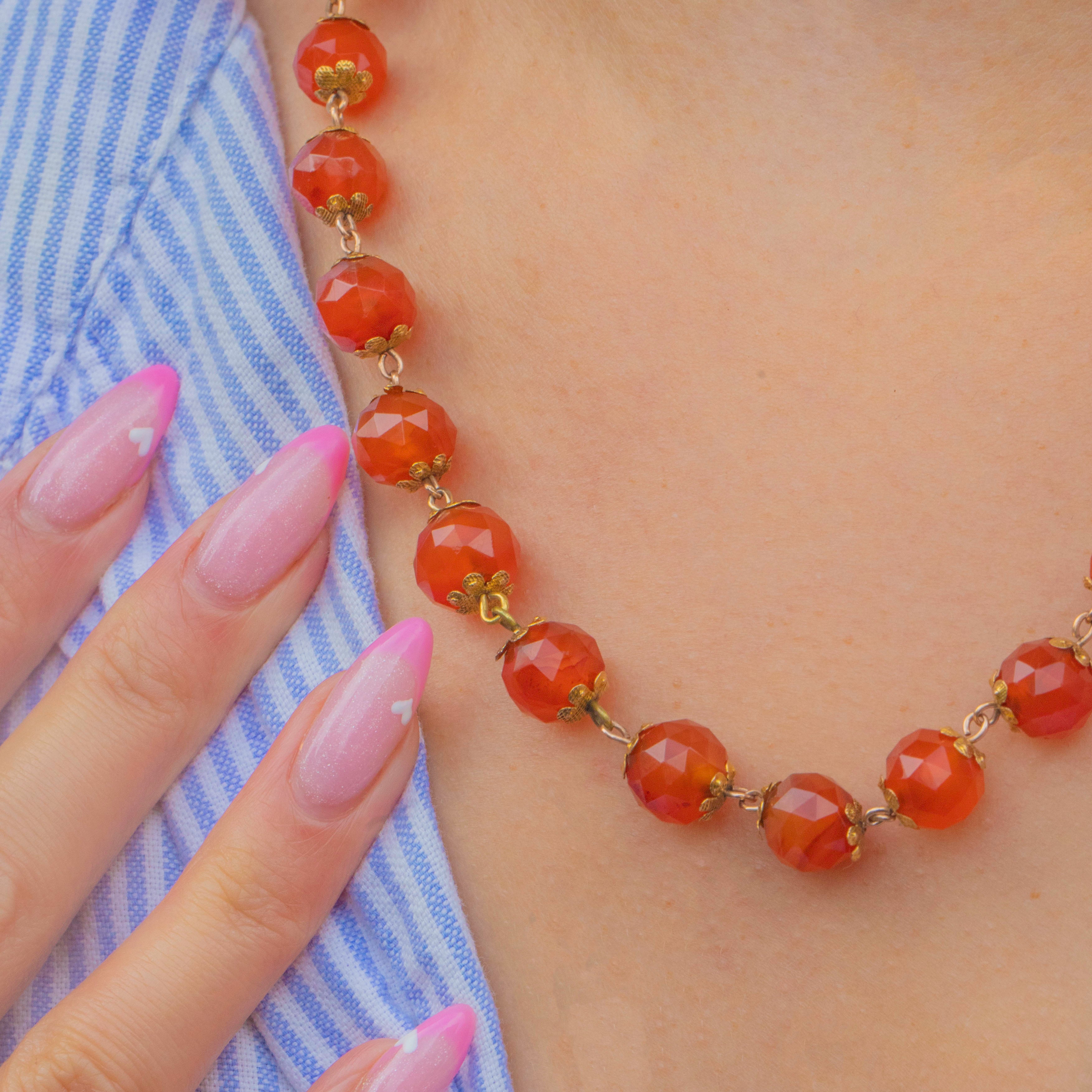 EXCELLENT: Carnelian beads are smooth and lustrous with no chips or cracks, showing attractive, even colour. Floral Gold settings are secure and well-preserved with minimal surface wear — a beautifully cared-for Victorian strand.