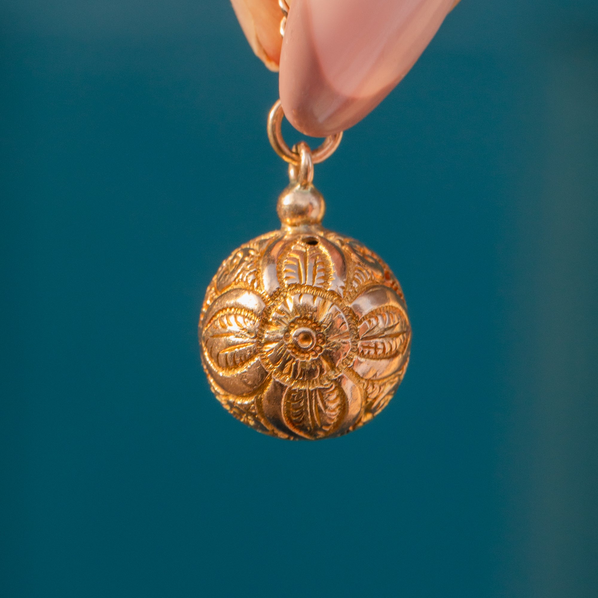 EXCELLENT. This Victorian 9ct Gold engraved floral orb pendant is in very good condition. This piece has very little sign of wear to note, with a beautifully formed exterior and jump ring so you can wear her with absolute confidence!