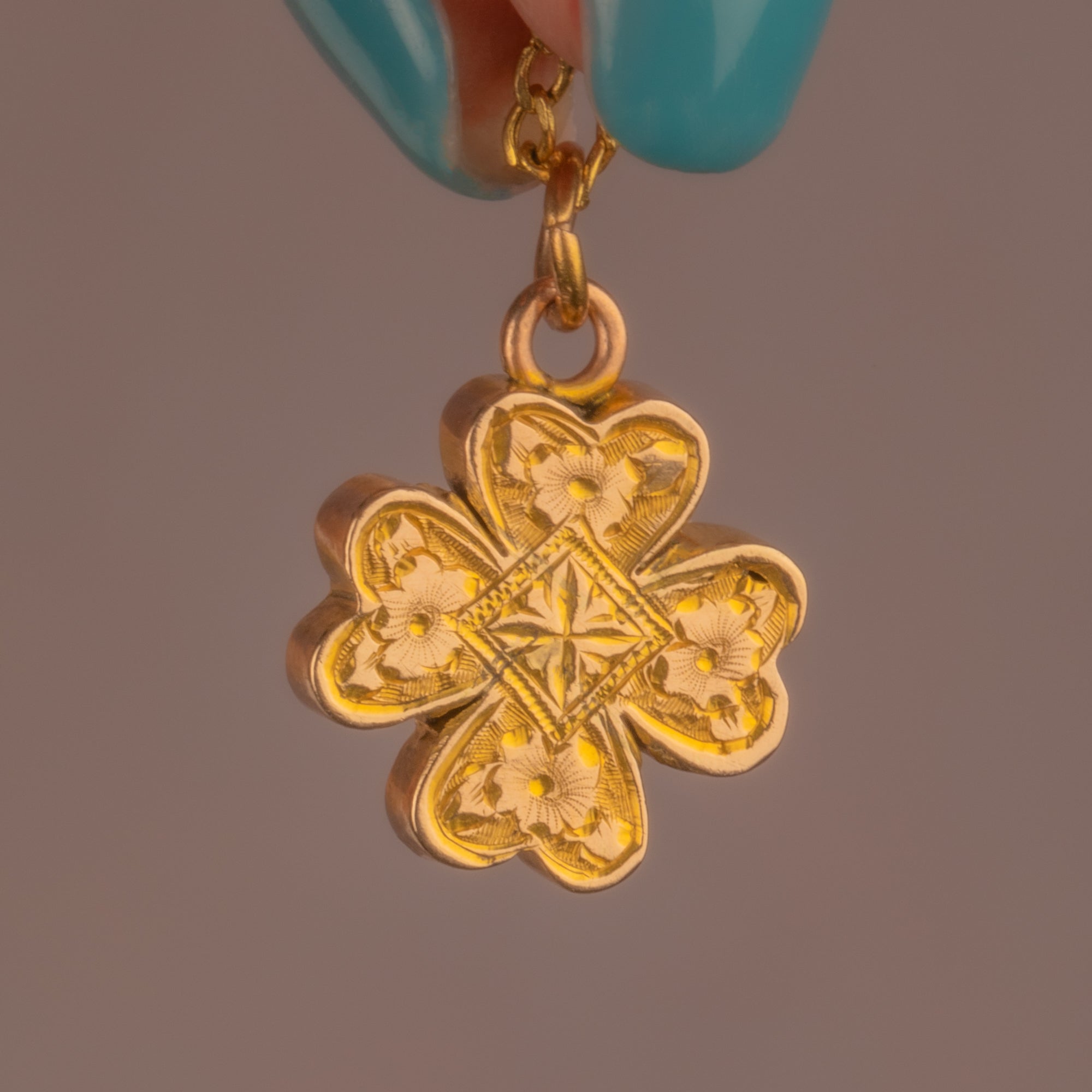 This Victorian 9ct Gold Engraved Four Leaf Clover Charm, featuring a four-leaf clover, a cherished emblem of luck. Known for their rarity and significance, four-leaf clovers have long been symbols of good fortune, making this locket a truly special piece for its wearer.